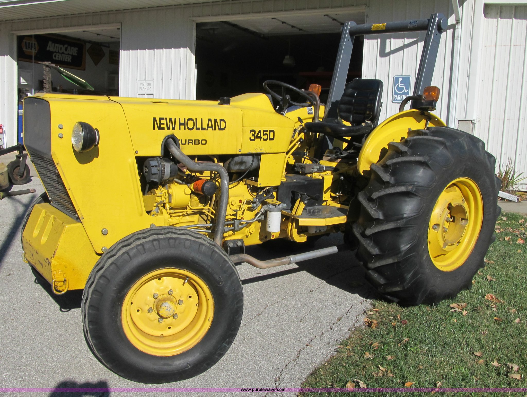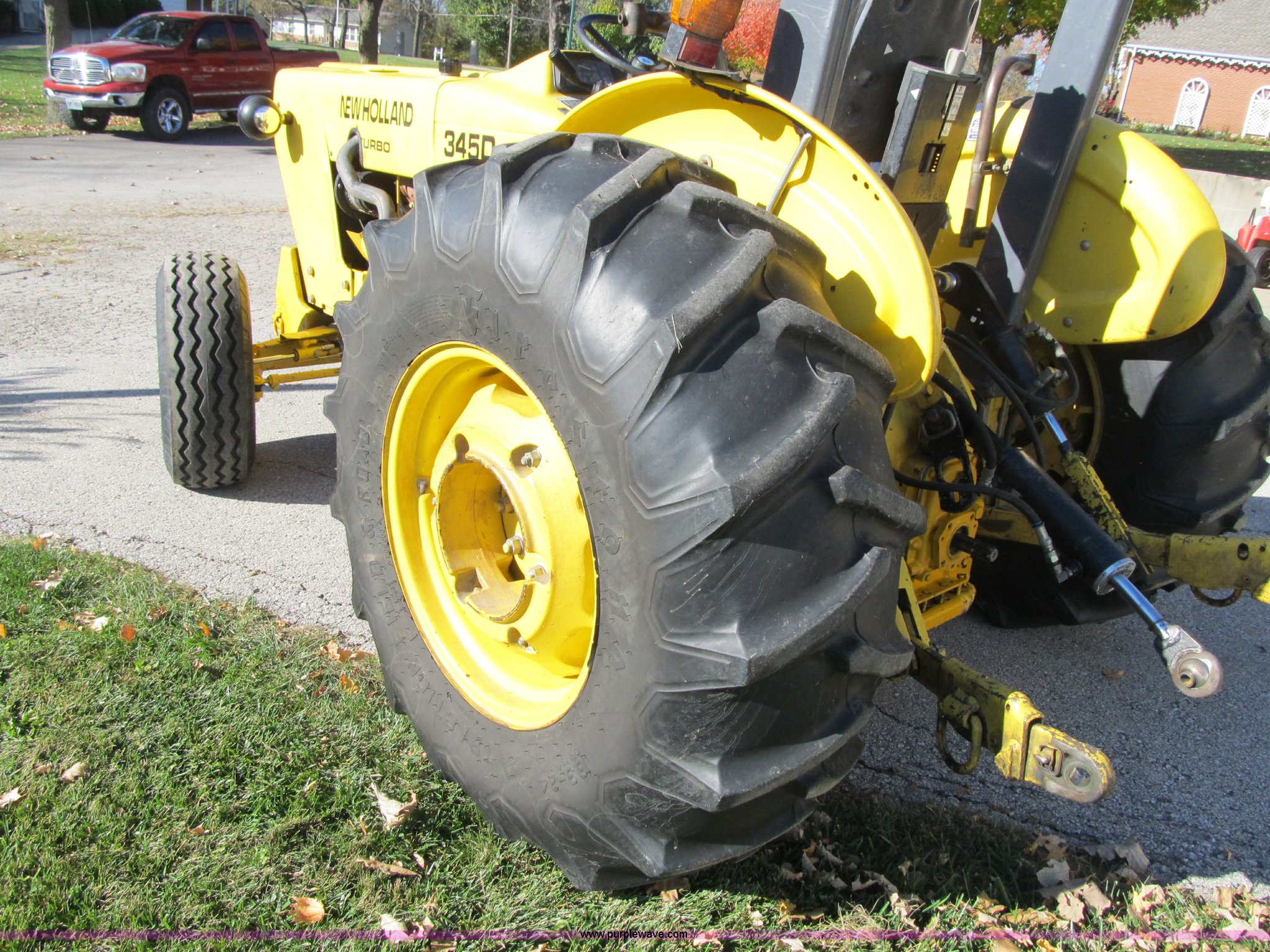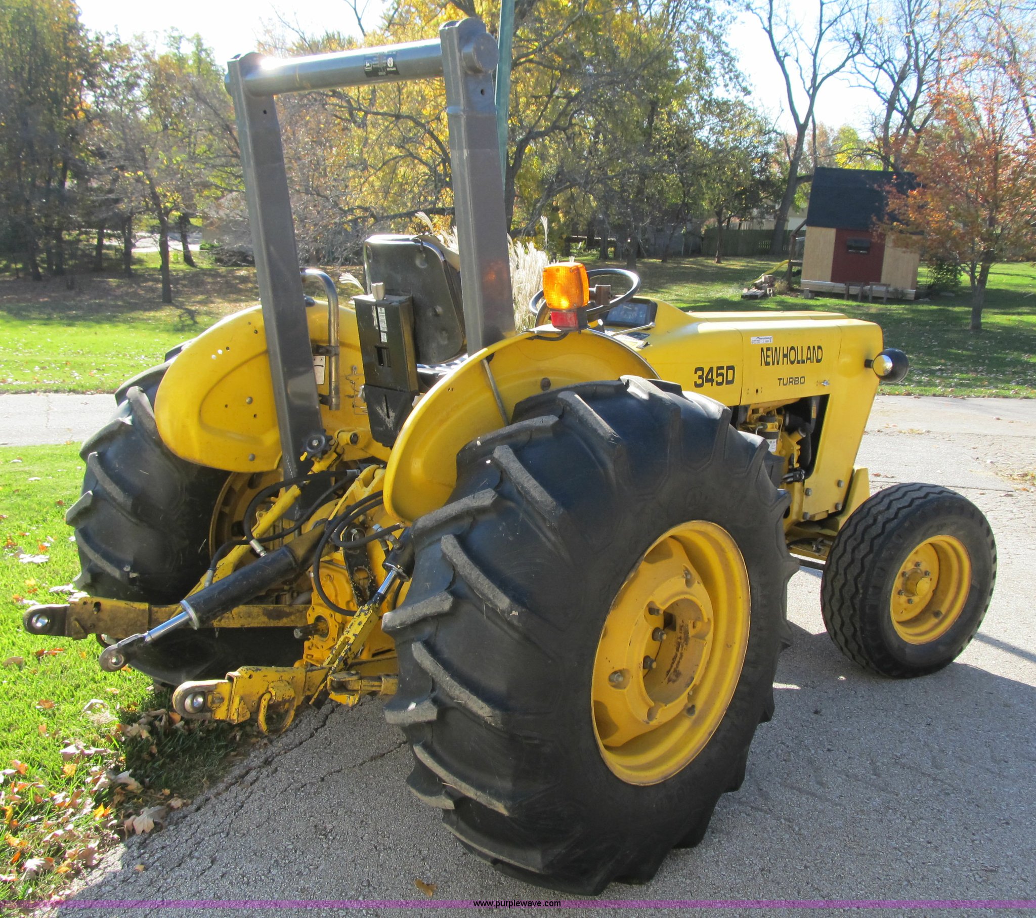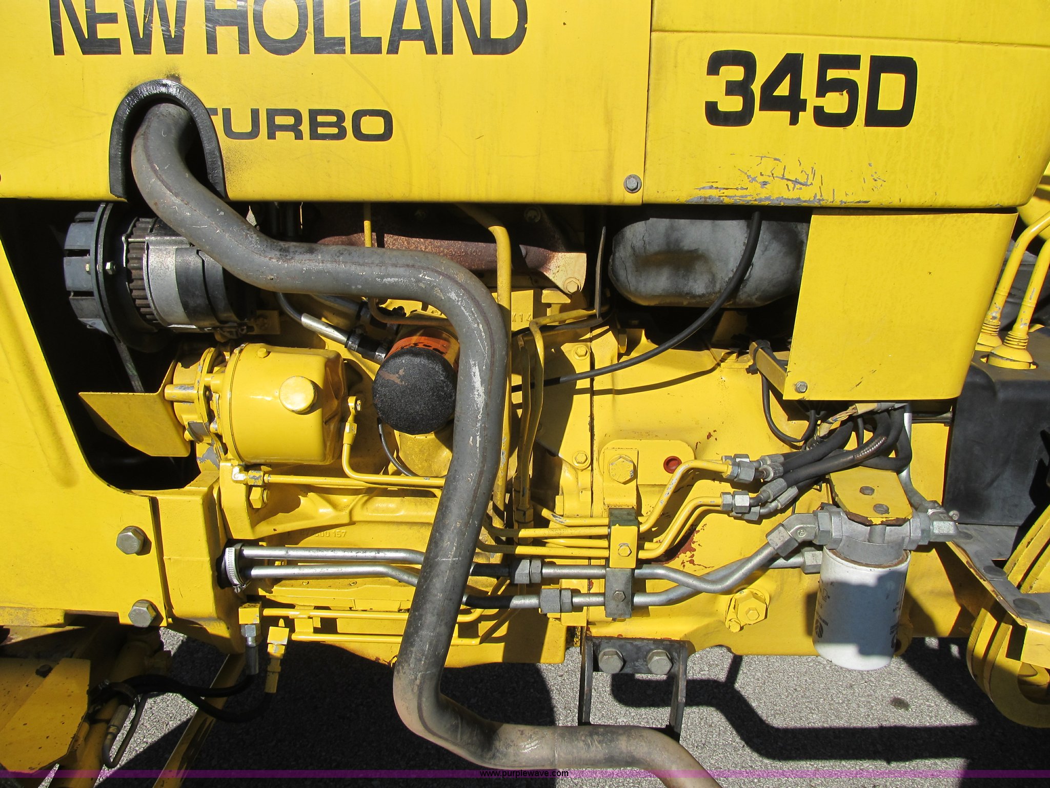 Purple Wave is selling a used Tractor in Missouri. This item is a 2000 New Holland 345D tractor with the following: 1,685 hours on meter, New Holland 332T/JC three cylinder diesel engine, 54 HP, Serial D879706-9M07, Powershift transmission, 8F-2R gears, Serial 8J11, ROPS, Canopy umbrella, Spring suspension seat, Three point, Draw bar, 540 PTO, (2) rear hydraulic remotes, Hydraulic top link, Approx. 500 lbs suitcase weight, Rear inner and outer wheels weights, Approx. 1,200 lbs, 11L-16 front tires, 16.9-24 rear tires, Serial A444002