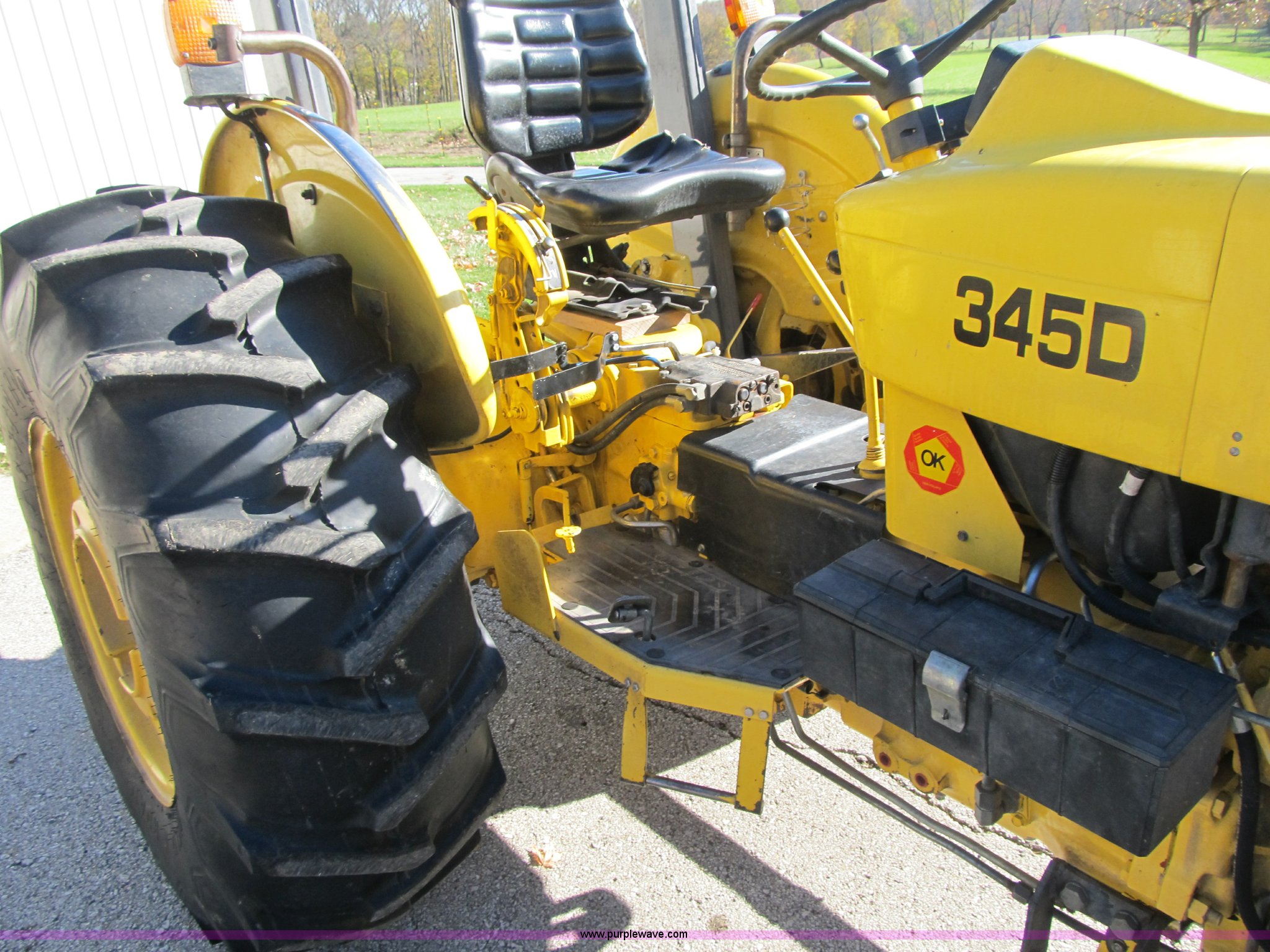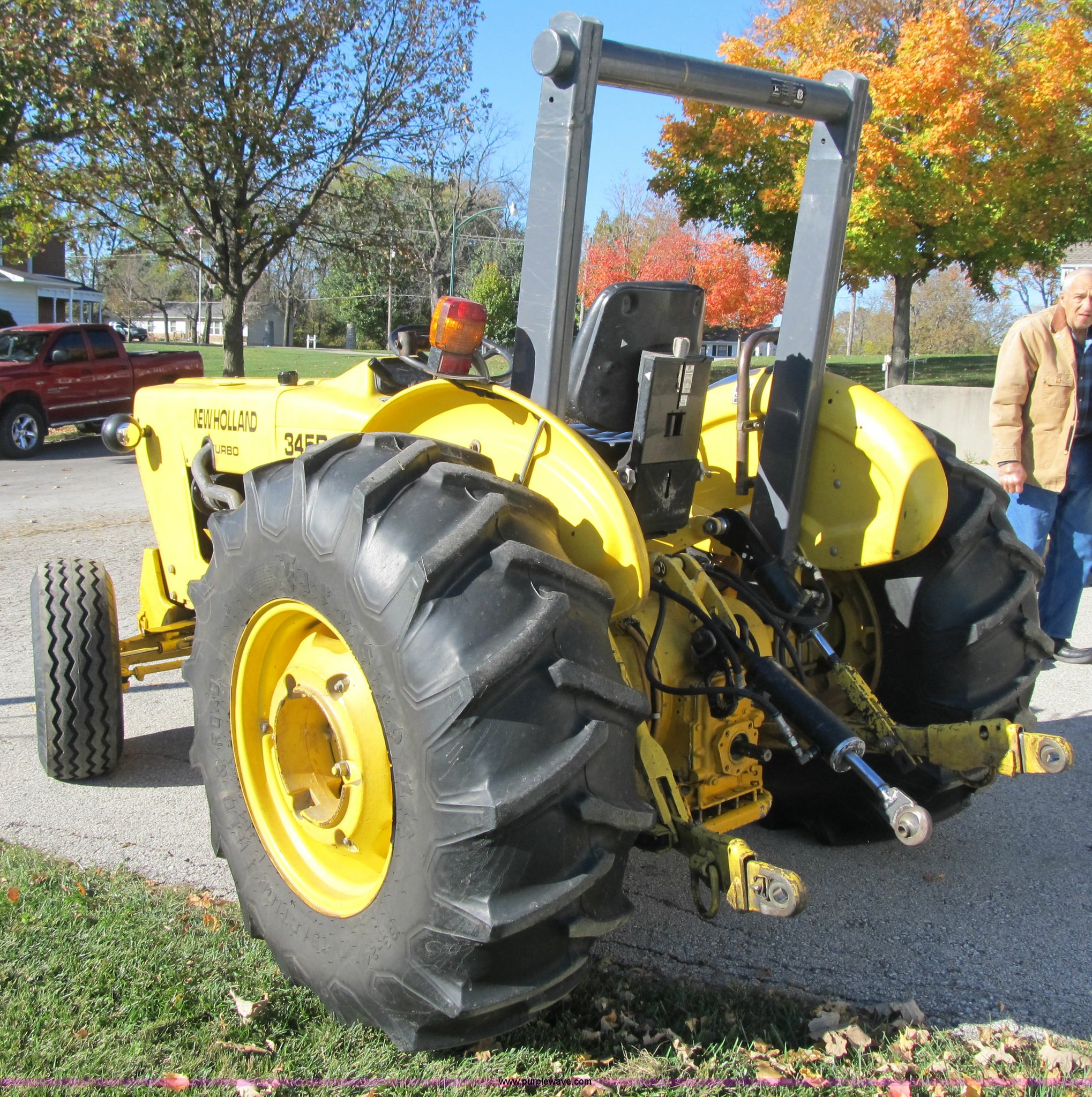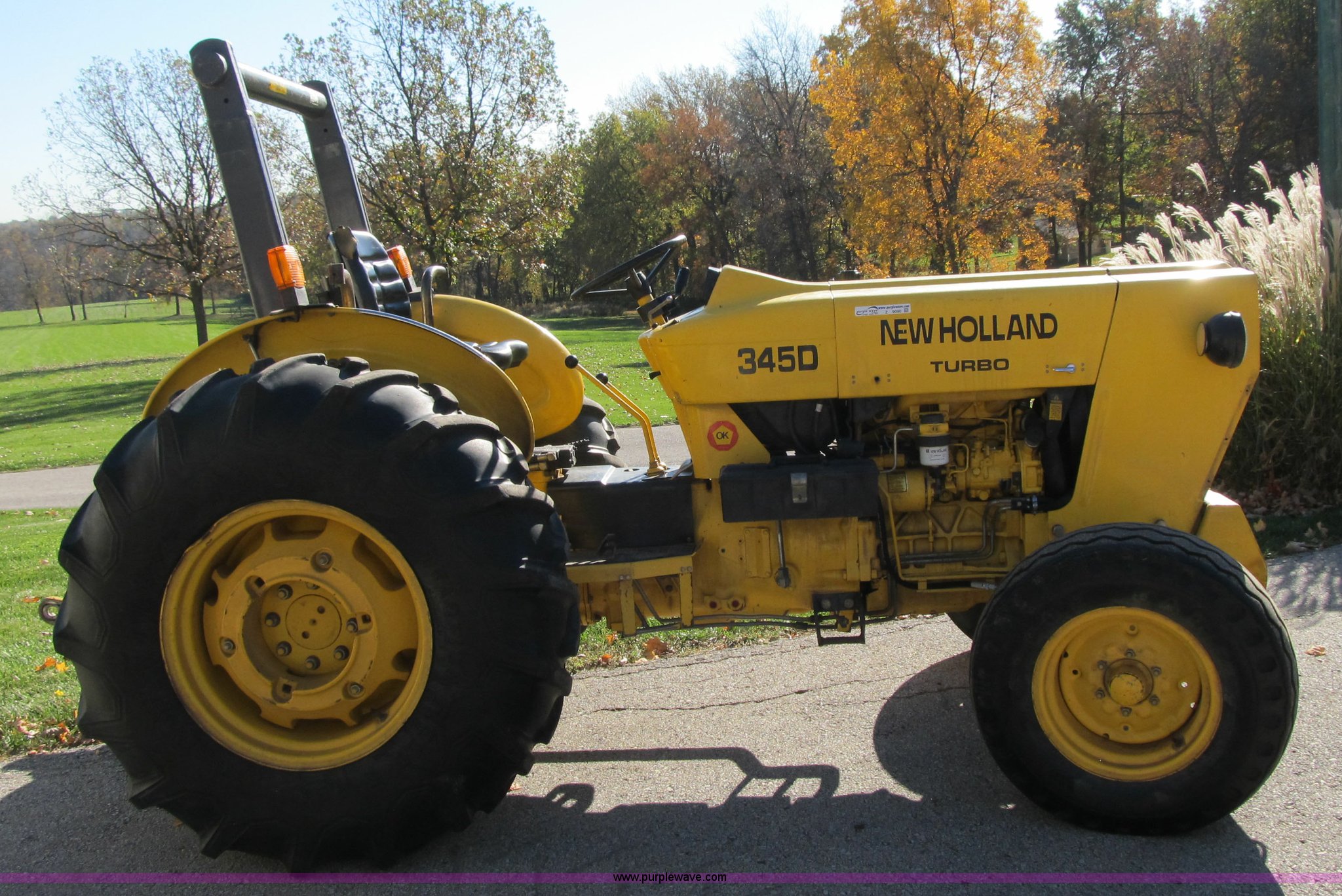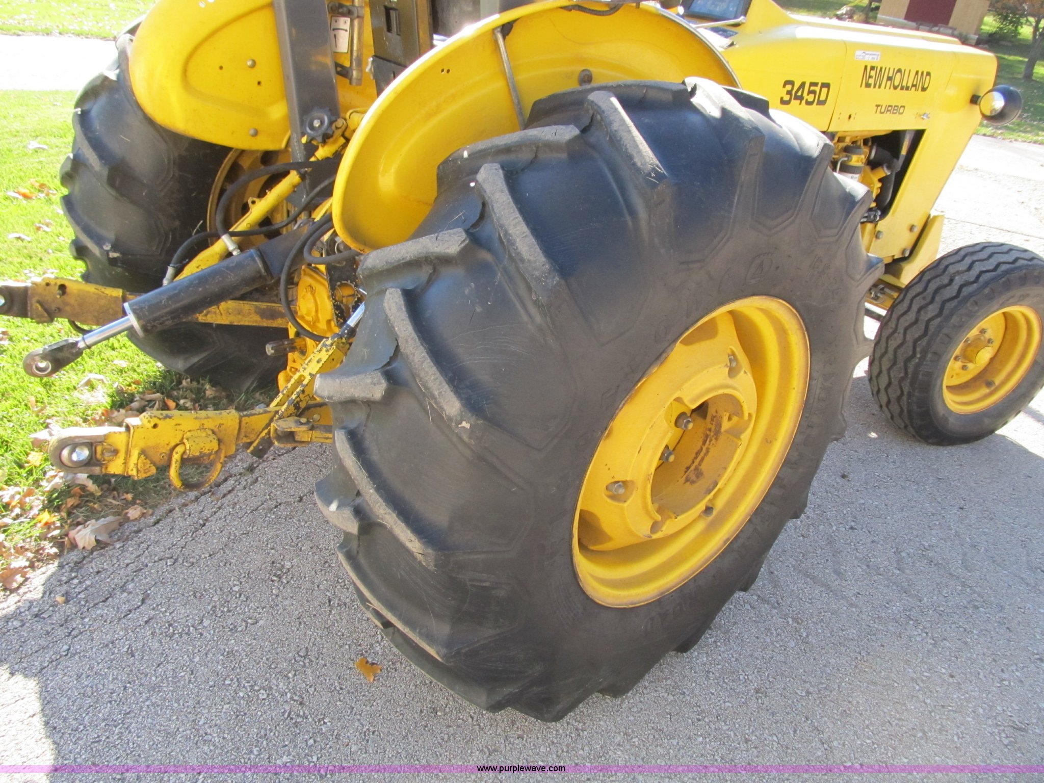 Purple Wave is selling a used Tractor in Missouri. This item is a 2000 New Holland 345D tractor with the following: 1,685 hours on meter, New Holland 332T/JC three cylinder diesel engine, 54 HP, Serial D879706-9M07, Powershift transmission, 8F-2R gears, Serial 8J11, ROPS, Canopy umbrella, Spring suspension seat, Three point, Draw bar, 540 PTO, (2) rear hydraulic remotes, Hydraulic top link, Approx. 500 lbs suitcase weight, Rear inner and outer wheels weights, Approx. 1,200 lbs, 11L-16 front tires, 16.9-24 rear tires, Serial A444002