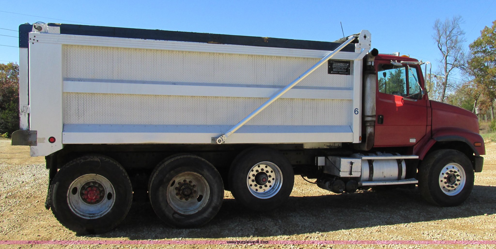 Purple Wave is selling a used Construction Dump Truck in Missouri. This item is a 1999 Freightliner FL112 dump truck with the following: 461,115 miles on odometer, Cummins ISM L6 diesel engine, Eight speed manual transmission, Lo and Lo-Lo gears, Locking differential, Cruise, AM/FM/CD, PTO, 16'7"L x 8'W dump bed, 54"H sideboards, Aluminum bed construction, Air operated end gate, Single ram three stage hoist, Dual 60 gallon fuel tanks, Block heater, Pintle hitch, Spring over walking beam suspension, Air brakes, Air operated tag axle, 385/65R22.5 front and tag axle tires, 11R24.5 rear tires, GVWR 64,000 lbs, FAWR 18,000 lbs, IAWR 23,000 lbs, RAWR 23,000 lbs, Interior/exterior cosmetic damage, Cracked windshield