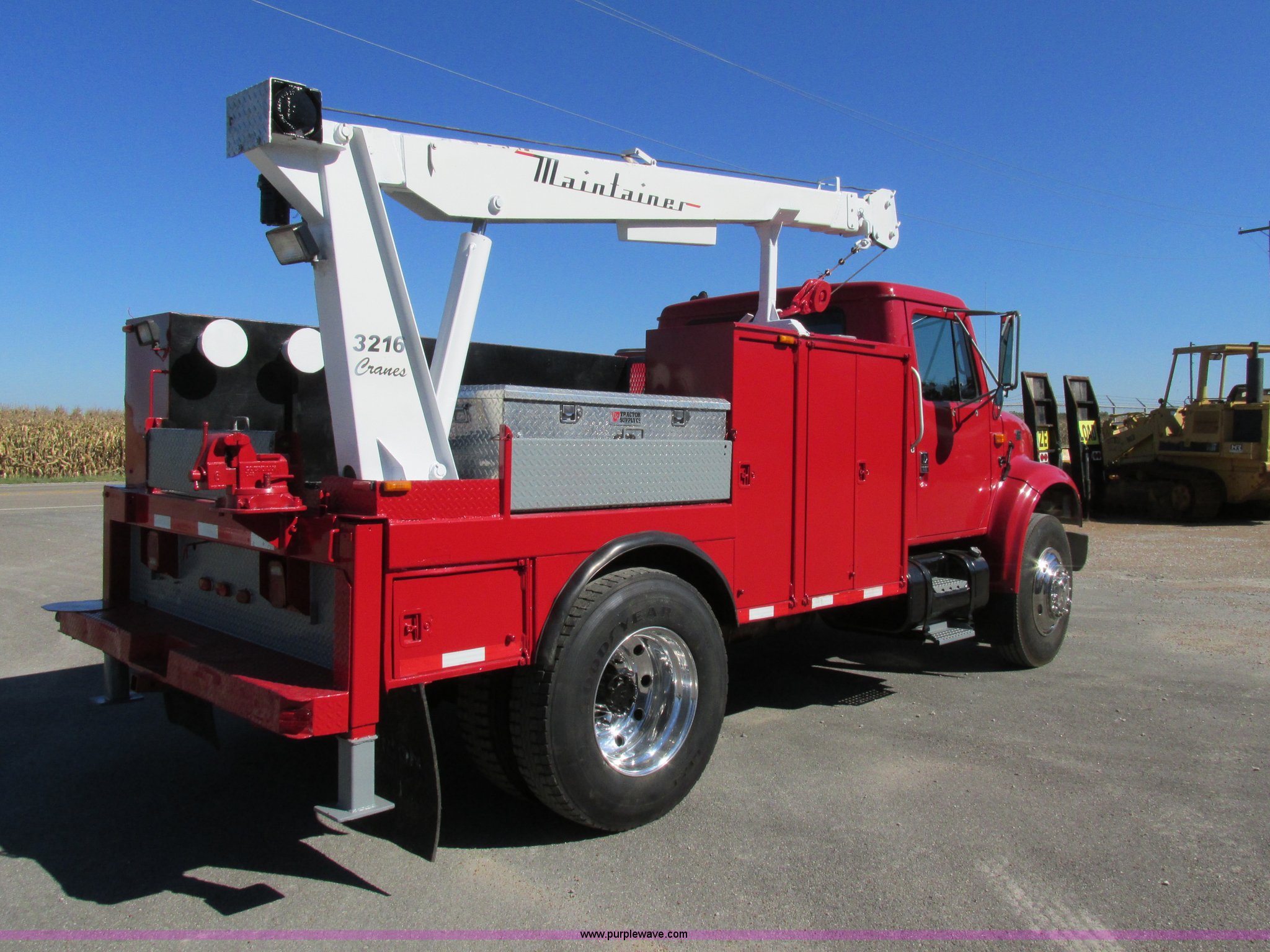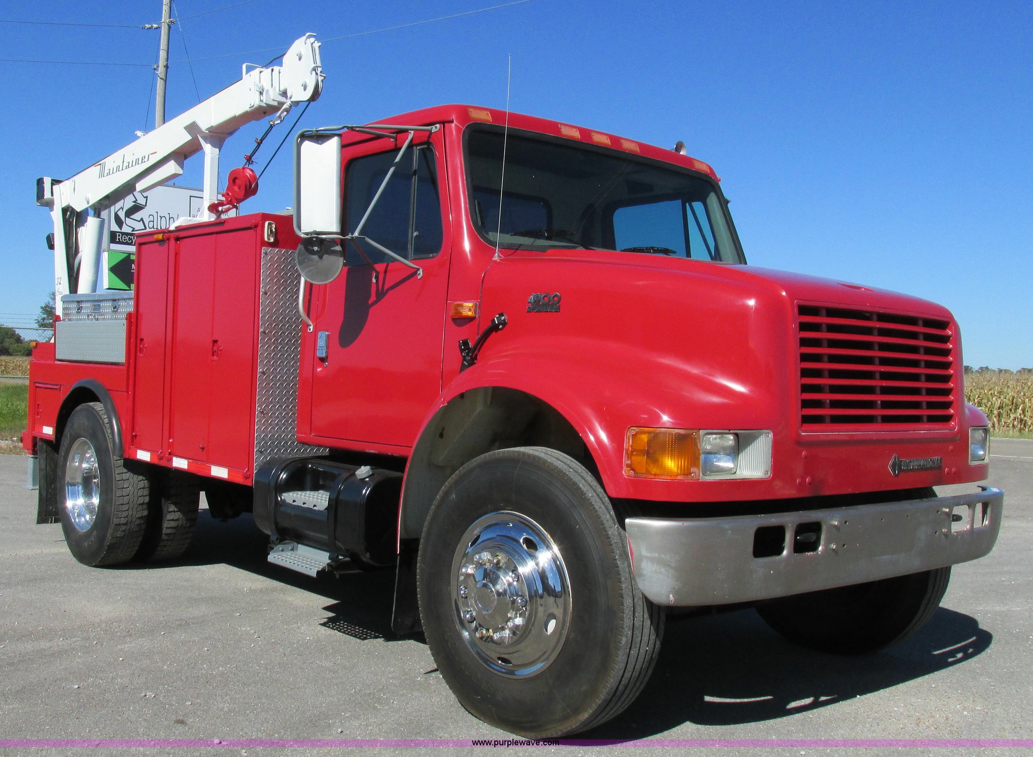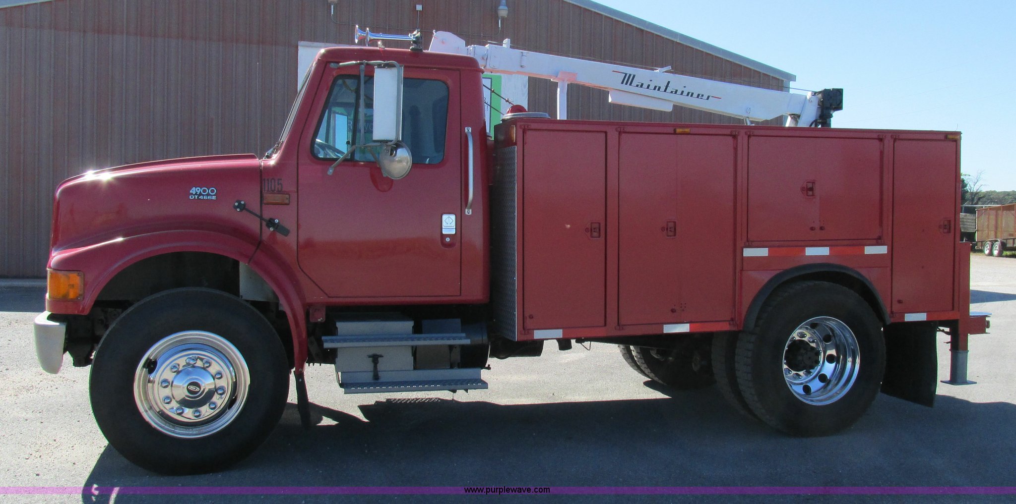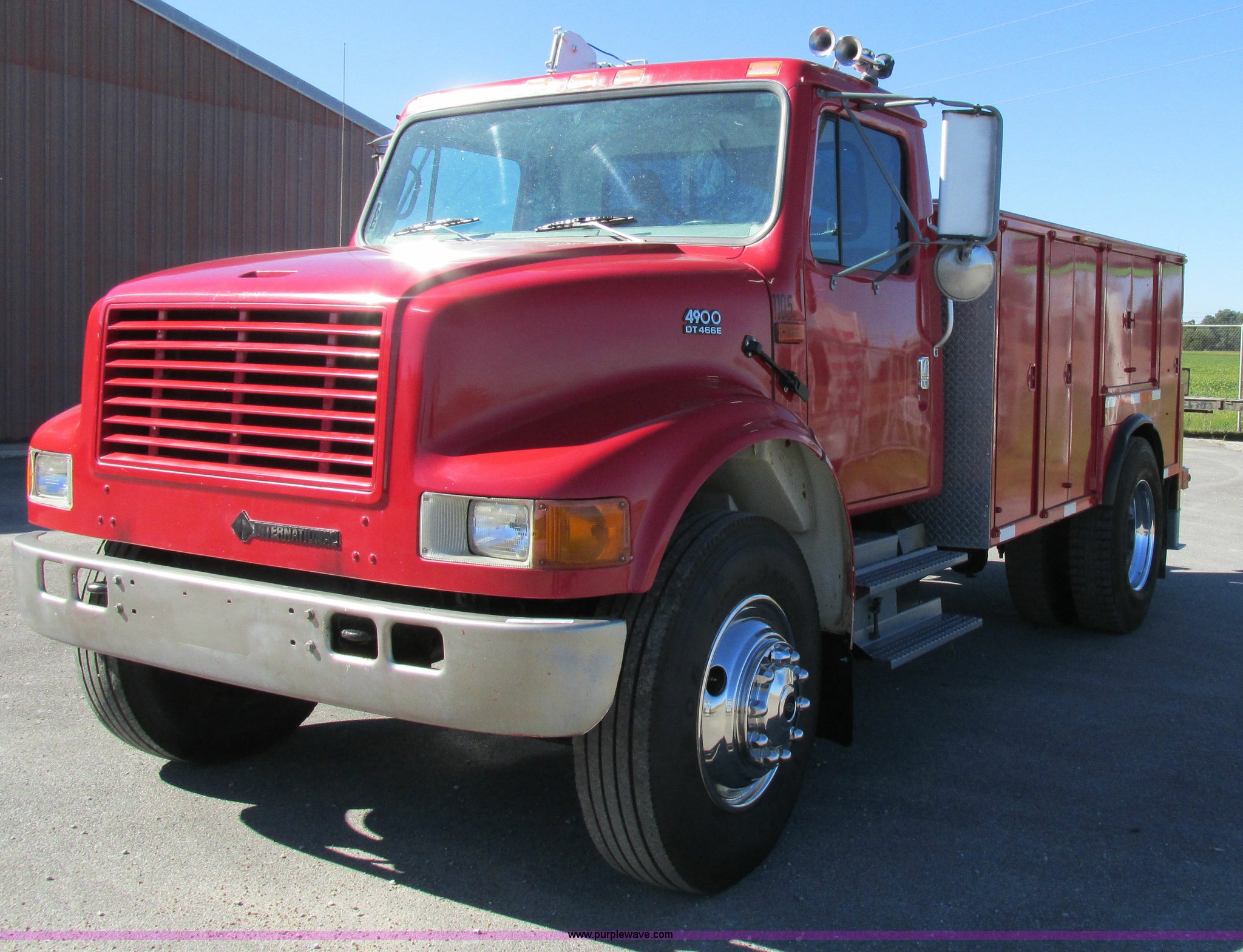 Purple Wave is selling a used Service Truck in Illinois. This item is a 2001 International 4900 service truck with crane with the following: 116,723 miles on odometer, International DT466E 7.6L L6 diesel engine, Six speed manual transmission, AC and heat, Cruise, AM/FM, Vinyl interior, 11'L x 90"W utility bed, Rear step bumper, Water cooler base, Rear vise, Exterior oxygen/acetylene tank brackets, Auxiliary 4' x 18" x 16" aluminum toolbox, 48"H boxes, Maintainer 3216 crane, Tethered remote, Dual hydraulic outriggers, Block heater, Front stainless steel simulator, Rear outer aluminum wheels, 188" wheelbase, 11R22.5 tires, GVWR 25,999 lbs