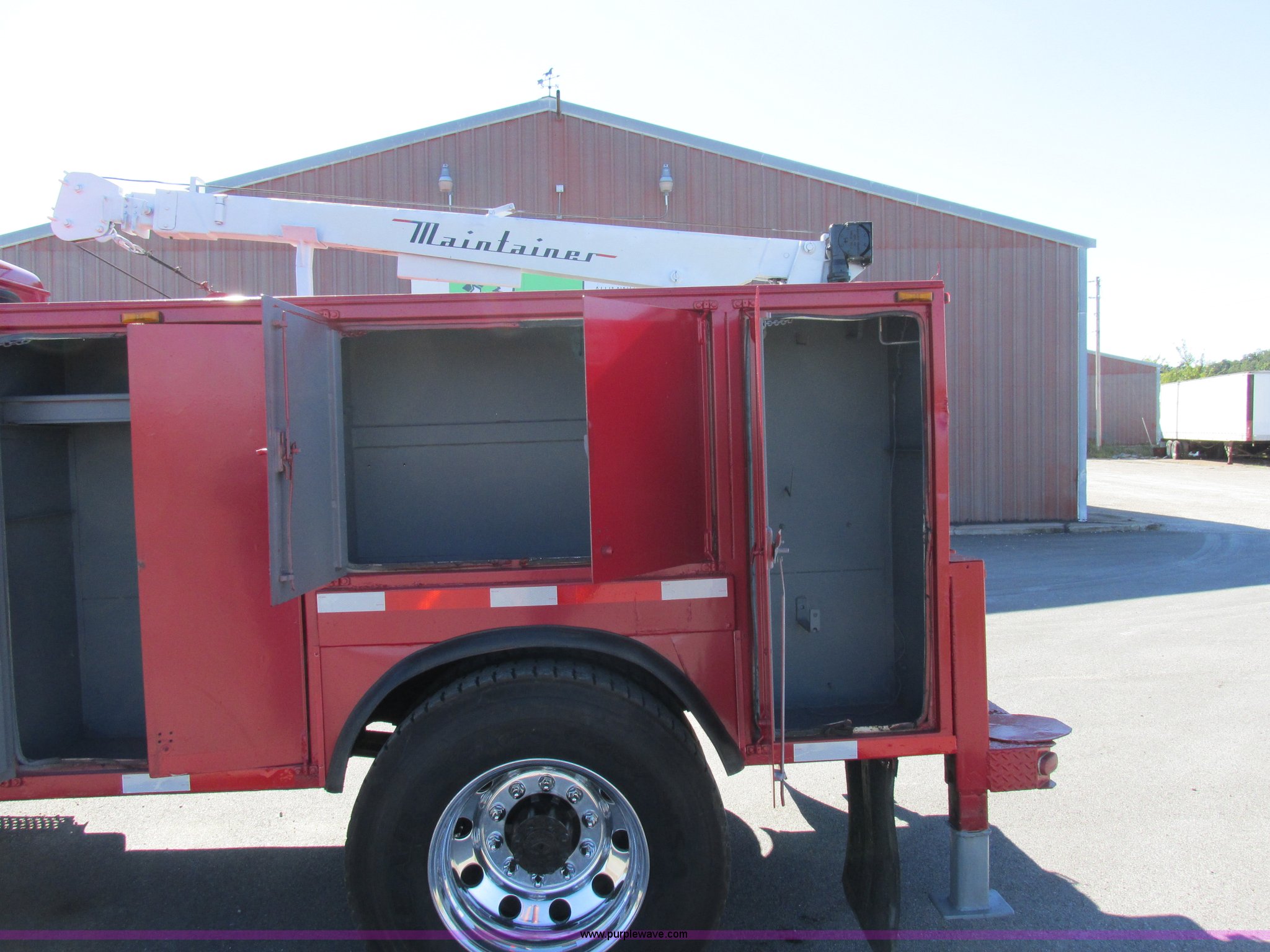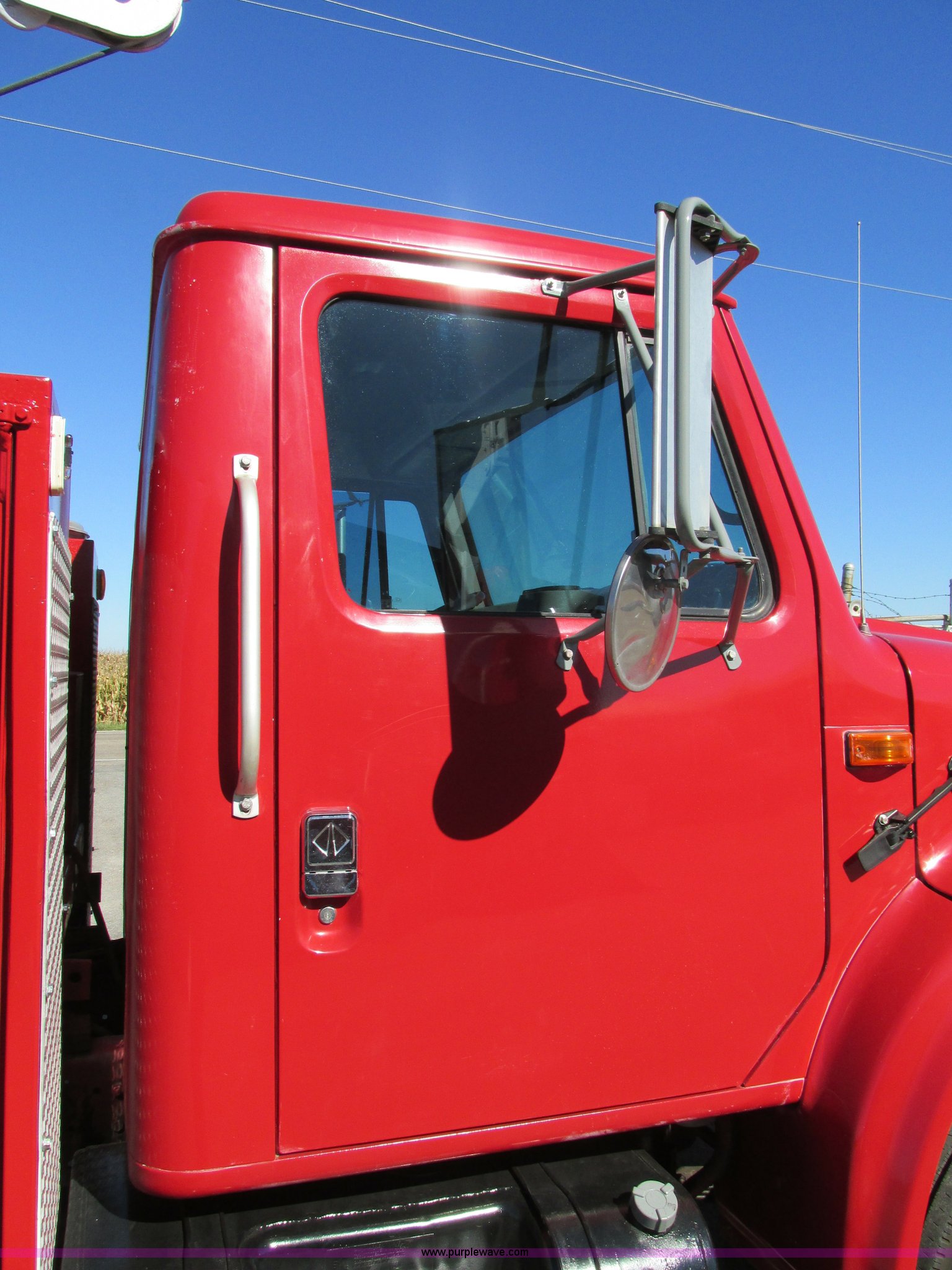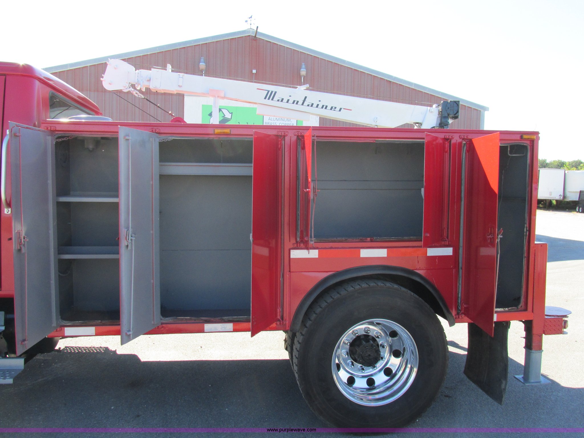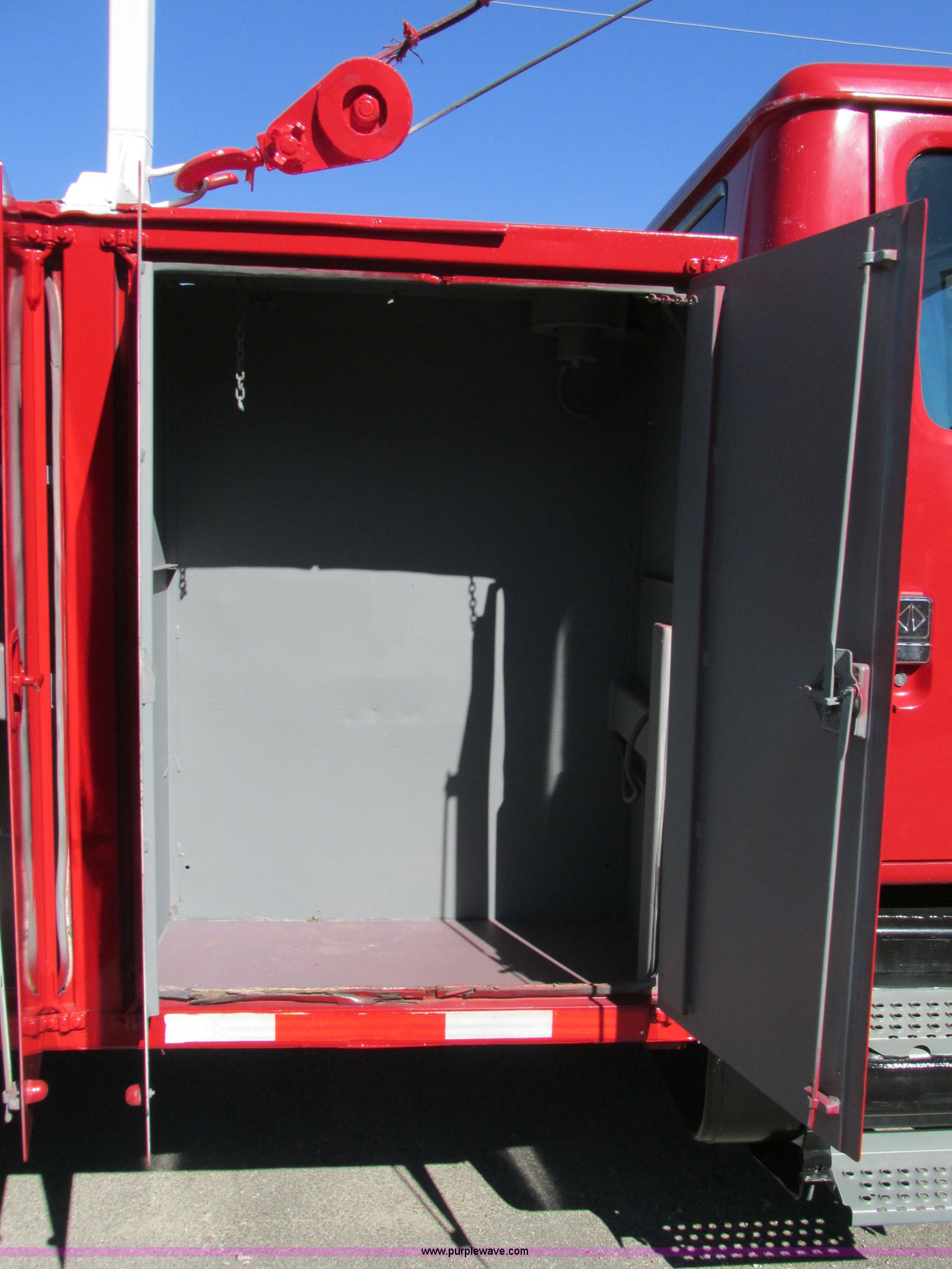 Purple Wave is selling a used Service Truck in Illinois. This item is a 2001 International 4900 service truck with crane with the following: 116,723 miles on odometer, International DT466E 7.6L L6 diesel engine, Six speed manual transmission, AC and heat, Cruise, AM/FM, Vinyl interior, 11'L x 90"W utility bed, Rear step bumper, Water cooler base, Rear vise, Exterior oxygen/acetylene tank brackets, Auxiliary 4' x 18" x 16" aluminum toolbox, 48"H boxes, Maintainer 3216 crane, Tethered remote, Dual hydraulic outriggers, Block heater, Front stainless steel simulator, Rear outer aluminum wheels, 188" wheelbase, 11R22.5 tires, GVWR 25,999 lbs