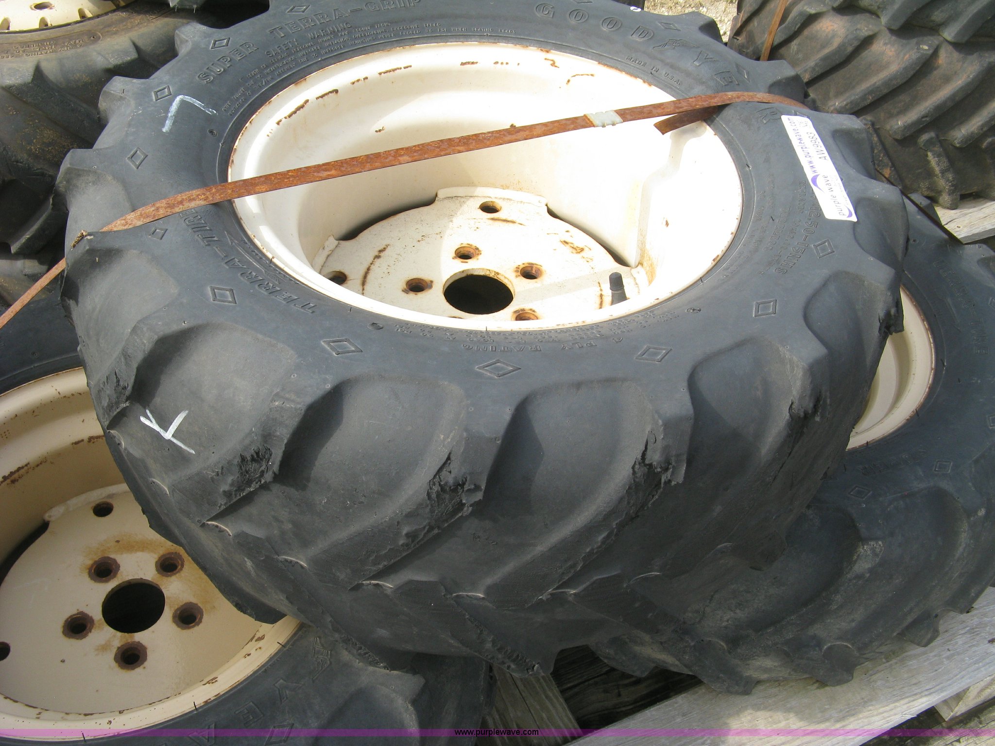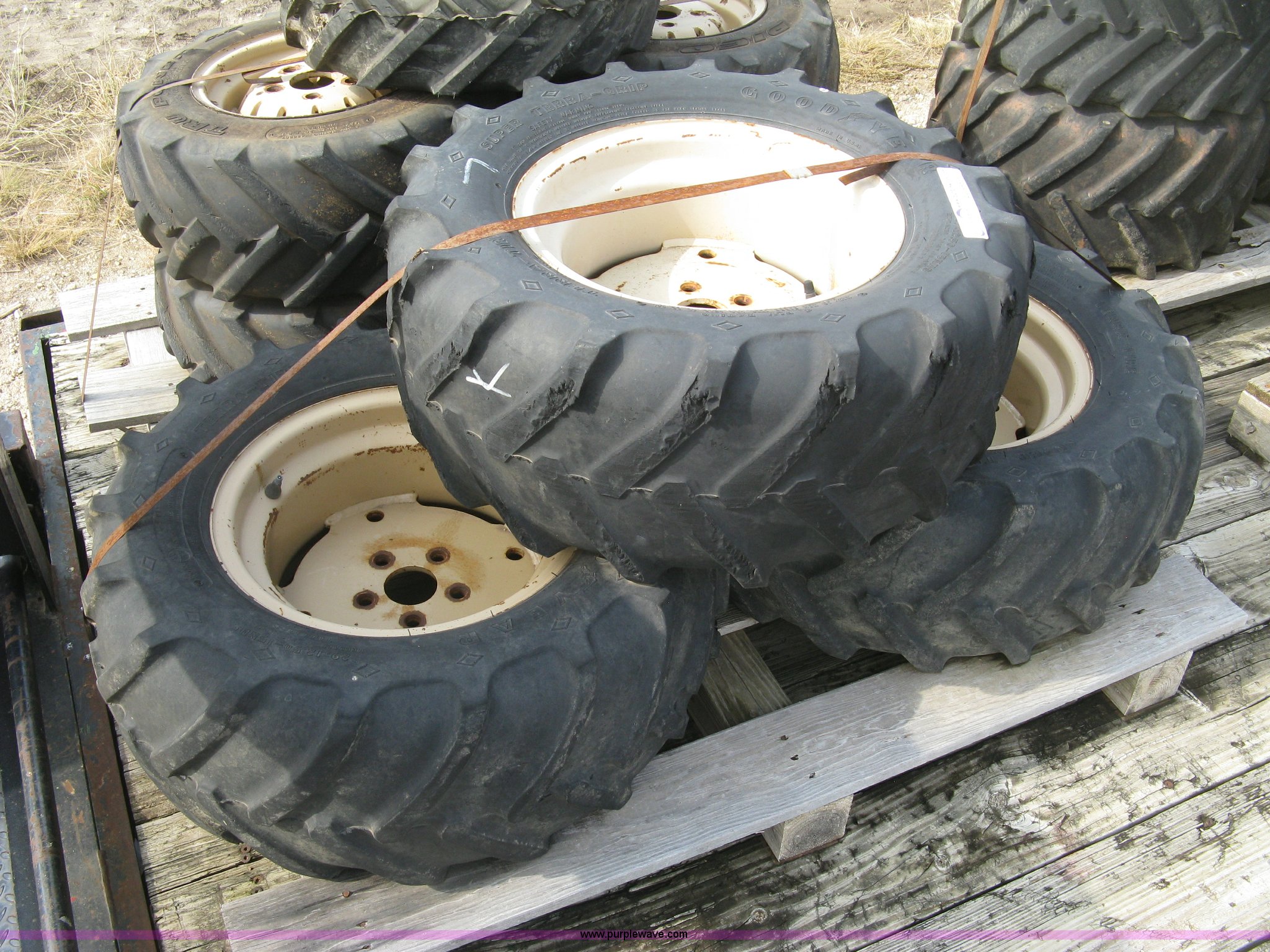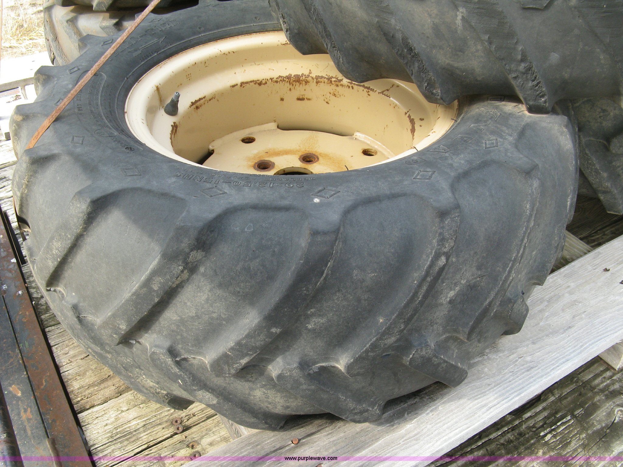 Purple Wave is selling a used Industrial Tires or Tracks in Kansas. This item is a (3) 29 x 12.5 x 15 tires and wheels with the following: Four ply, Five hole wheels, Lug damage