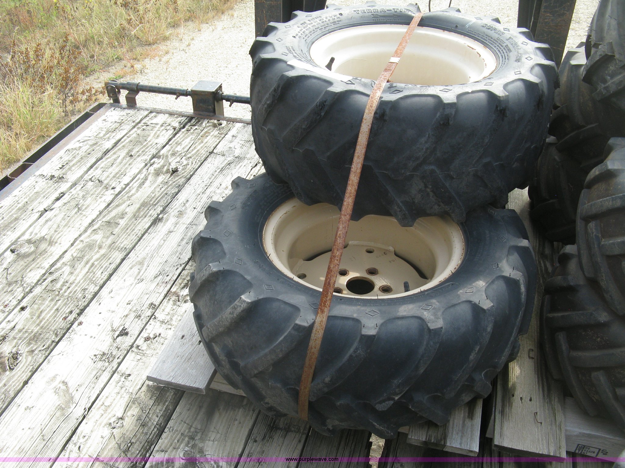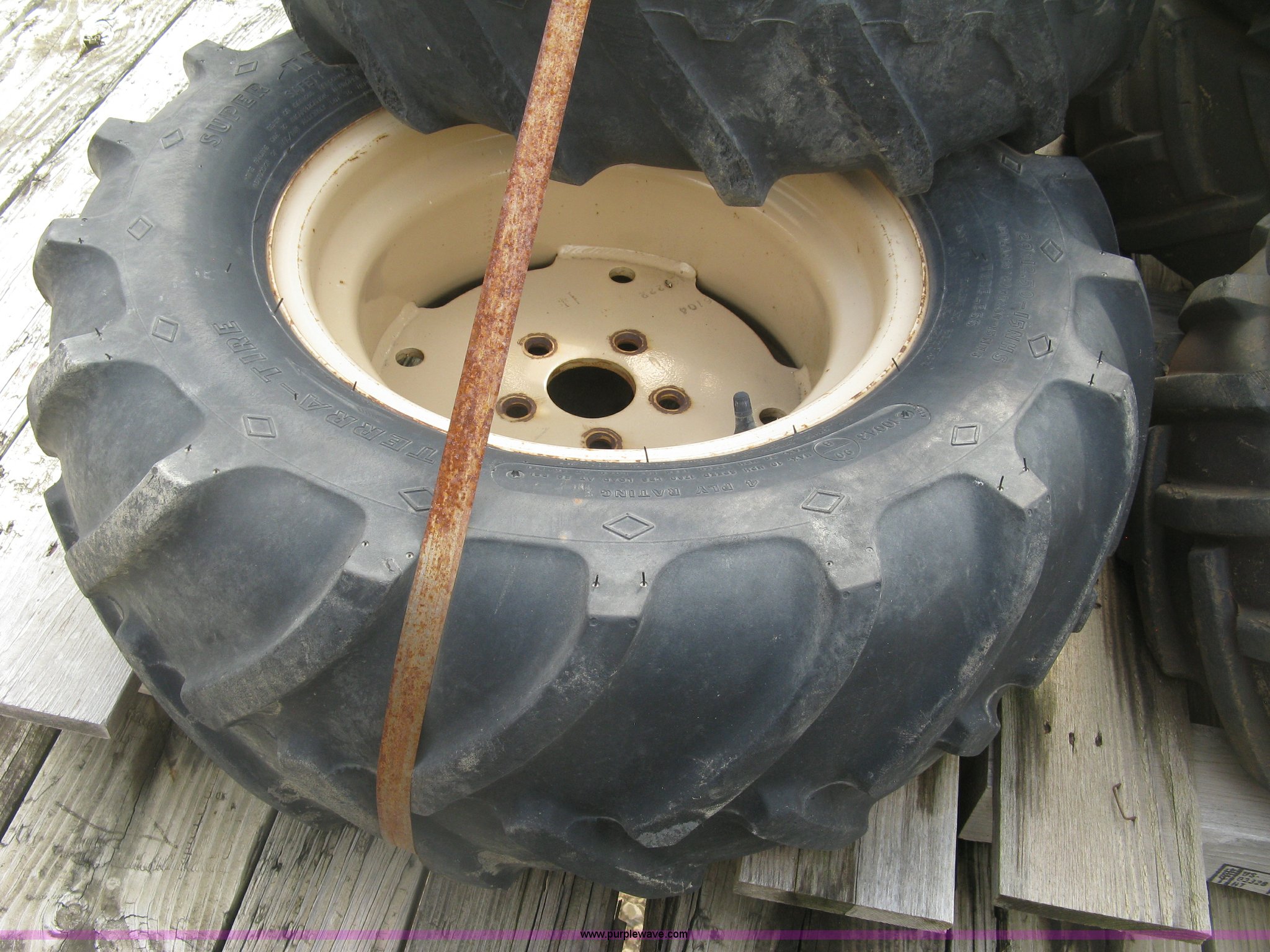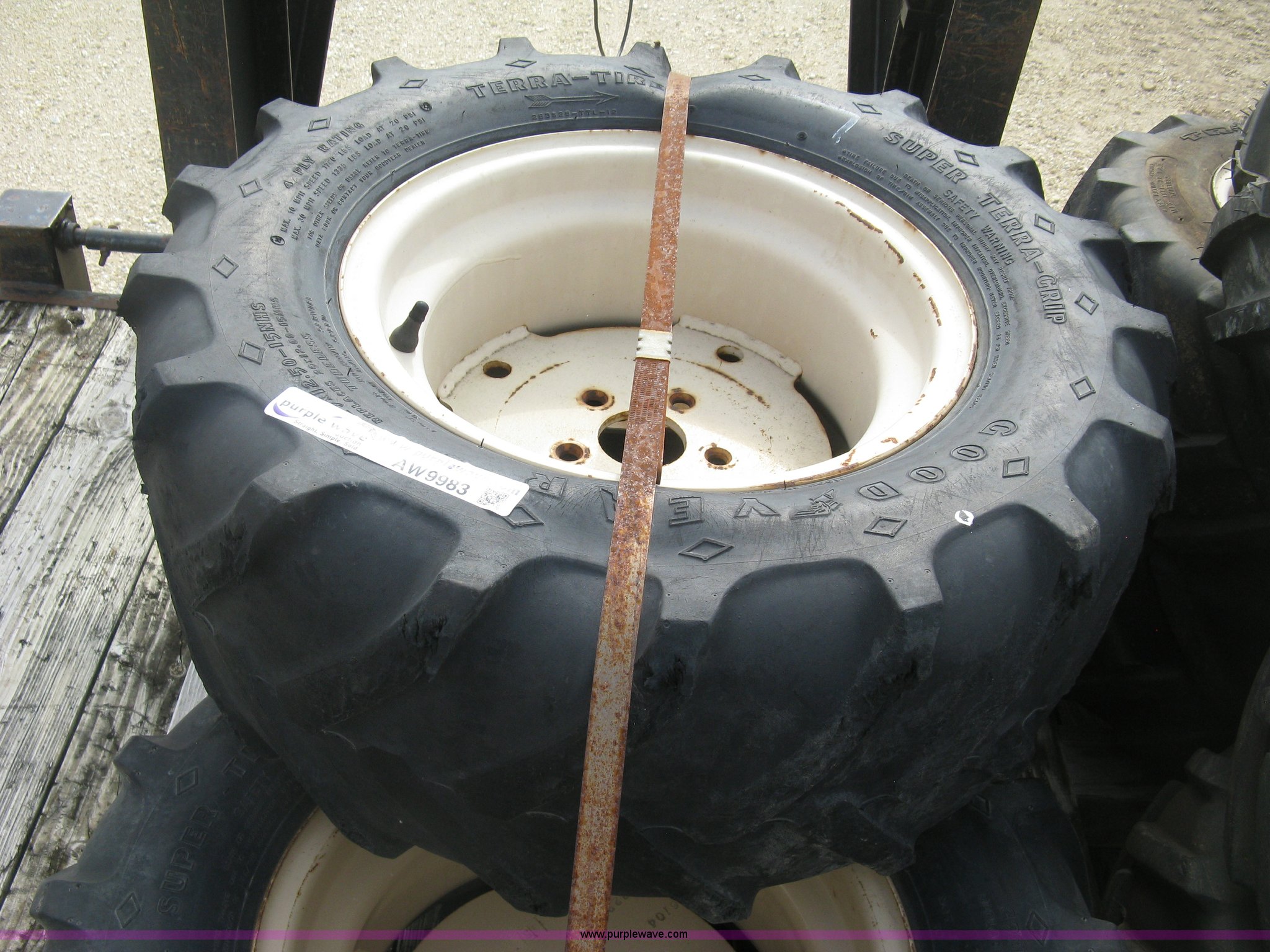 Purple Wave is selling a used Industrial Tires or Tracks in Kansas. This item is a (3) 29 x 12.5 x 15 tires and wheels with the following: Four ply, Five hole wheels, Lug damage