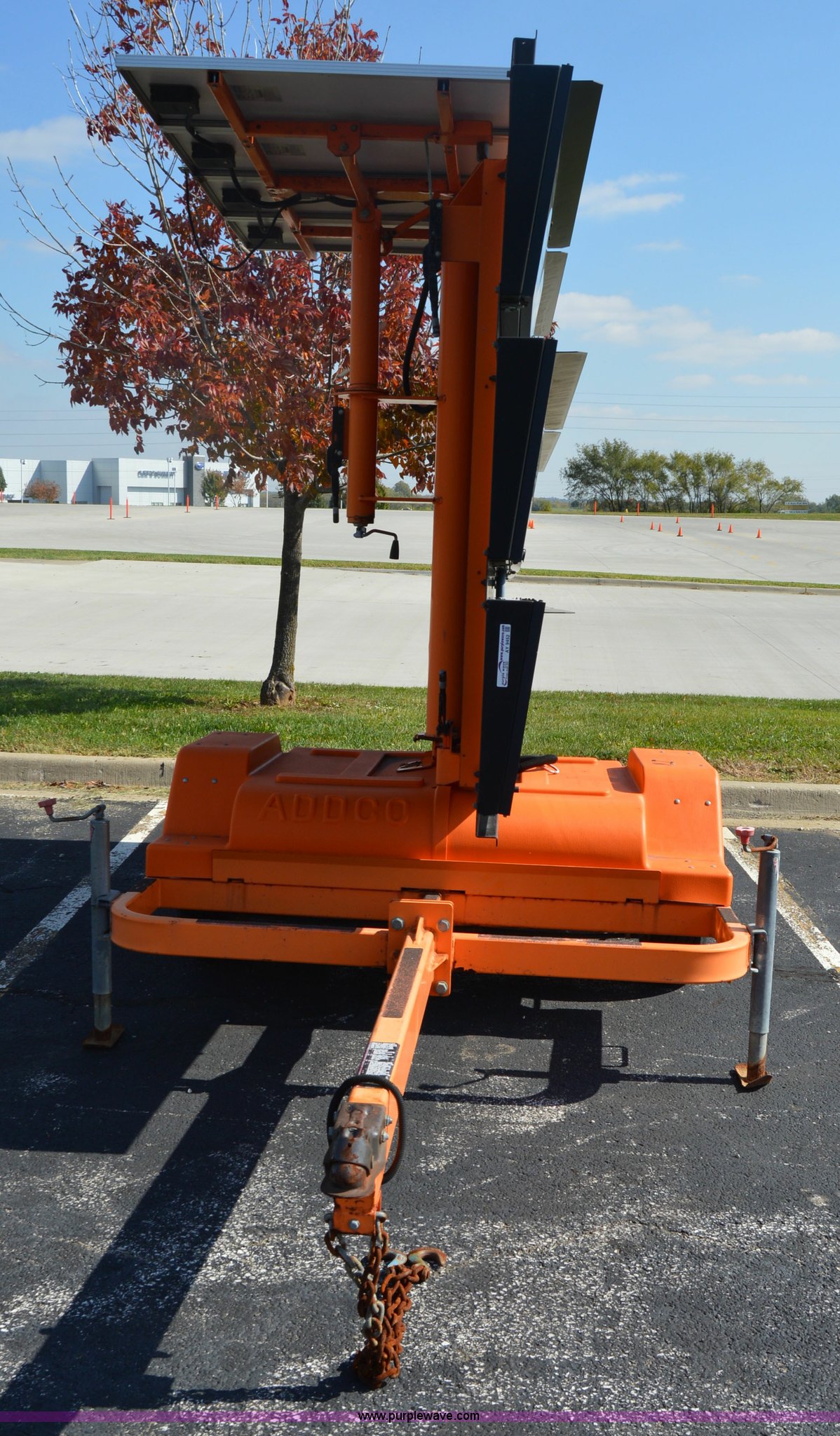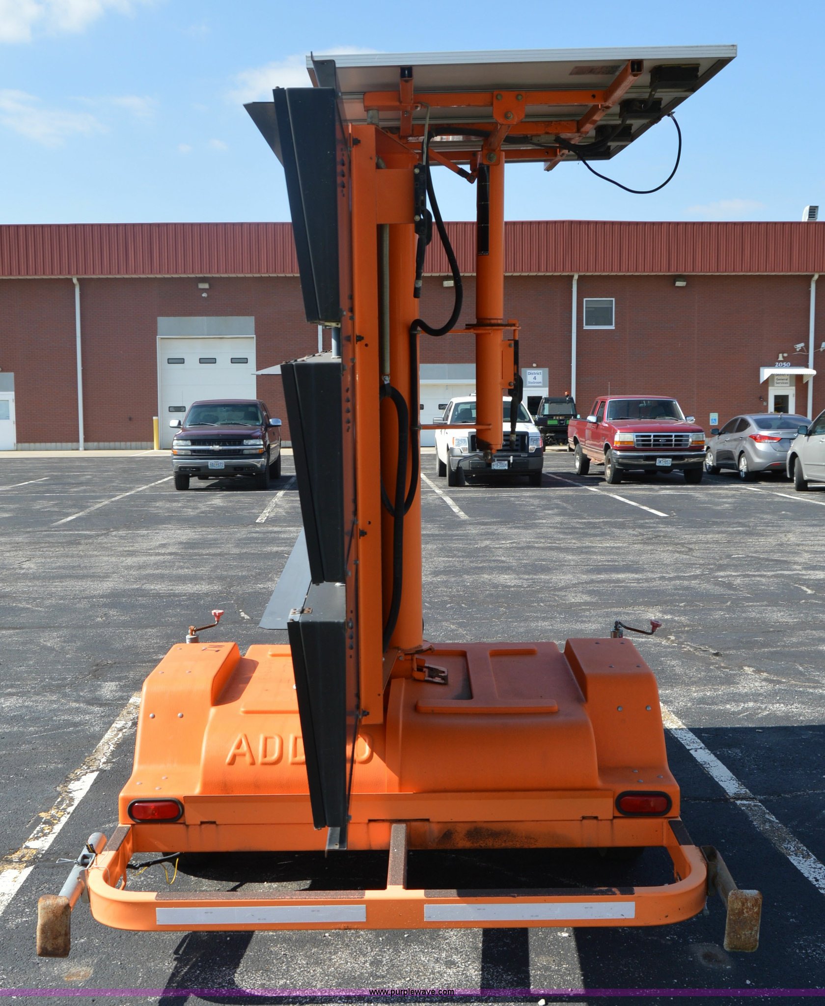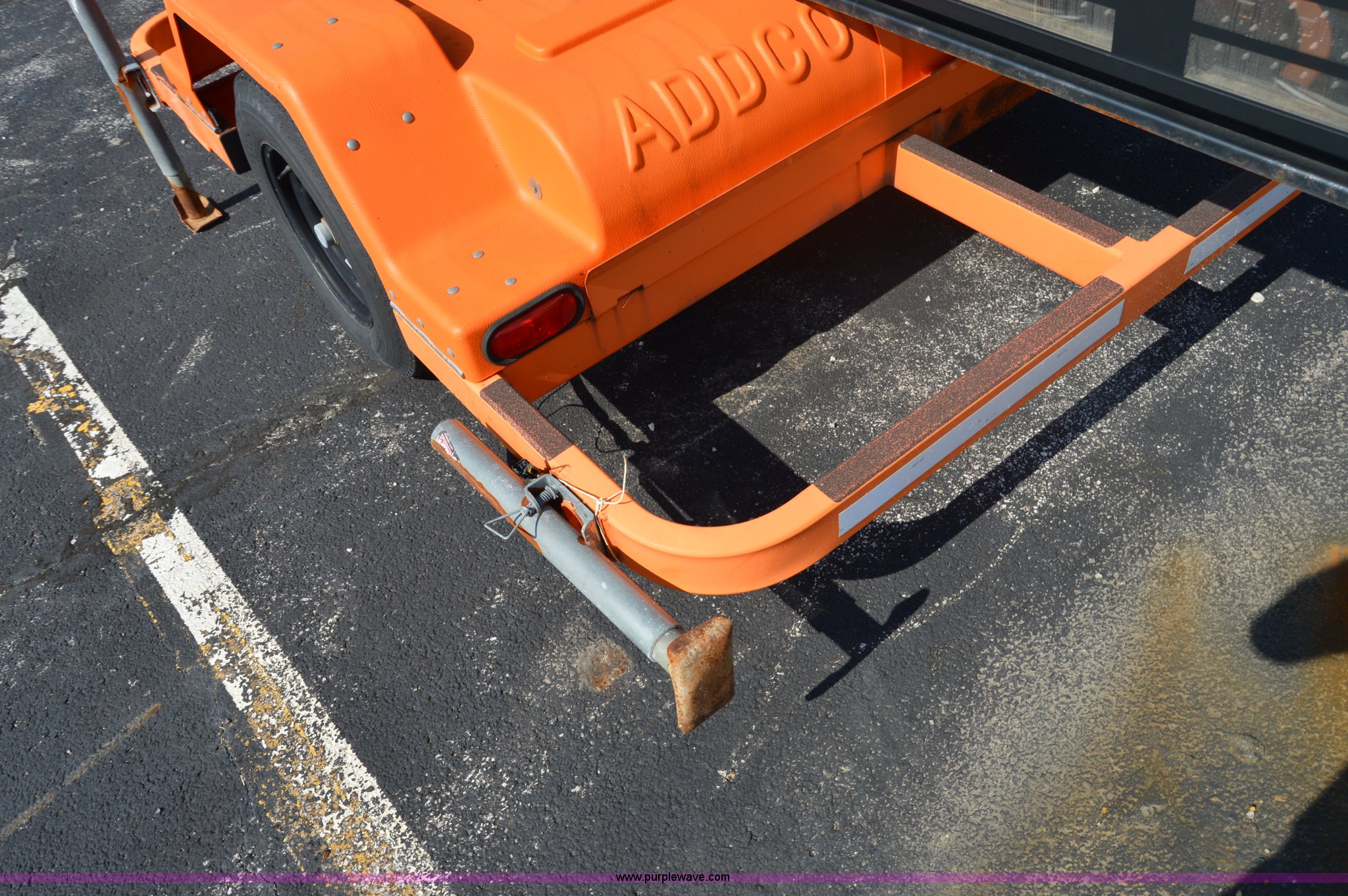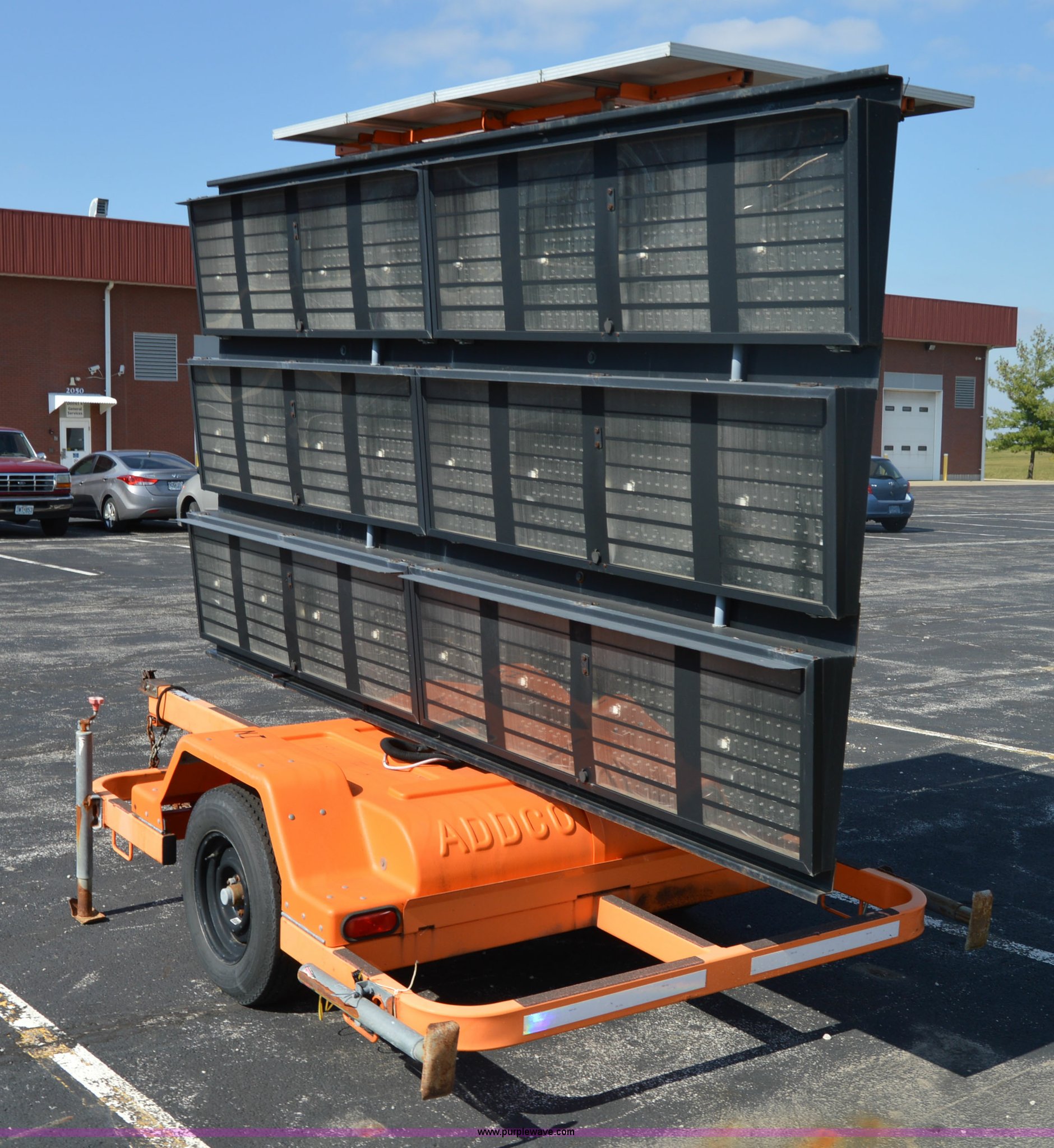 Purple Wave is selling a used Road Safety Equip. in Missouri. This item is a Addco sign board with the following: 11'W x 6'H, Manual outriggers, Battery operated, Manual jack, 2" ball hitch, 7.8-15 tires