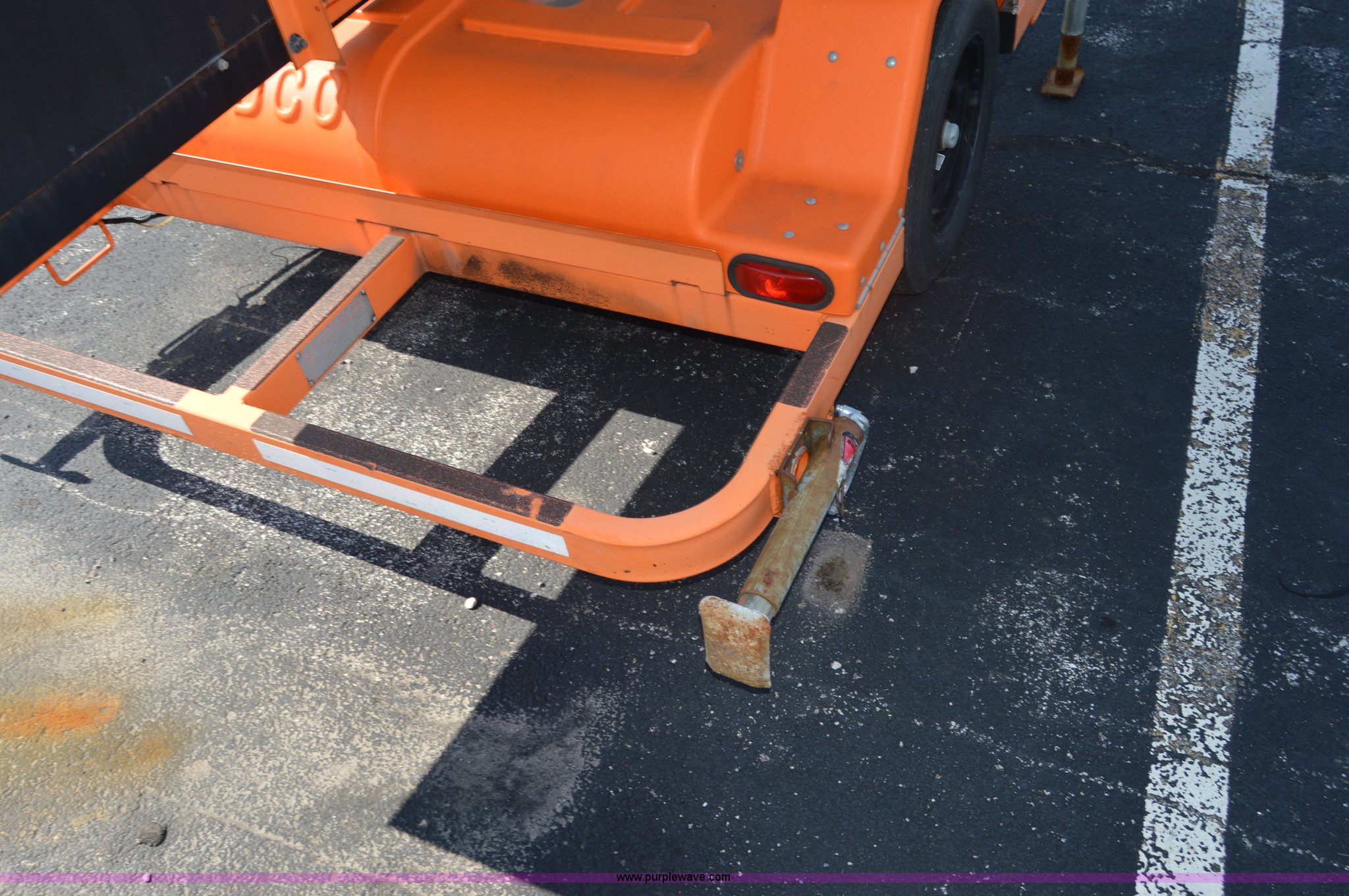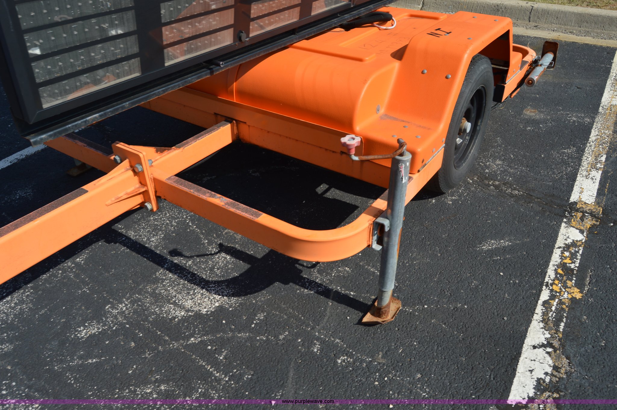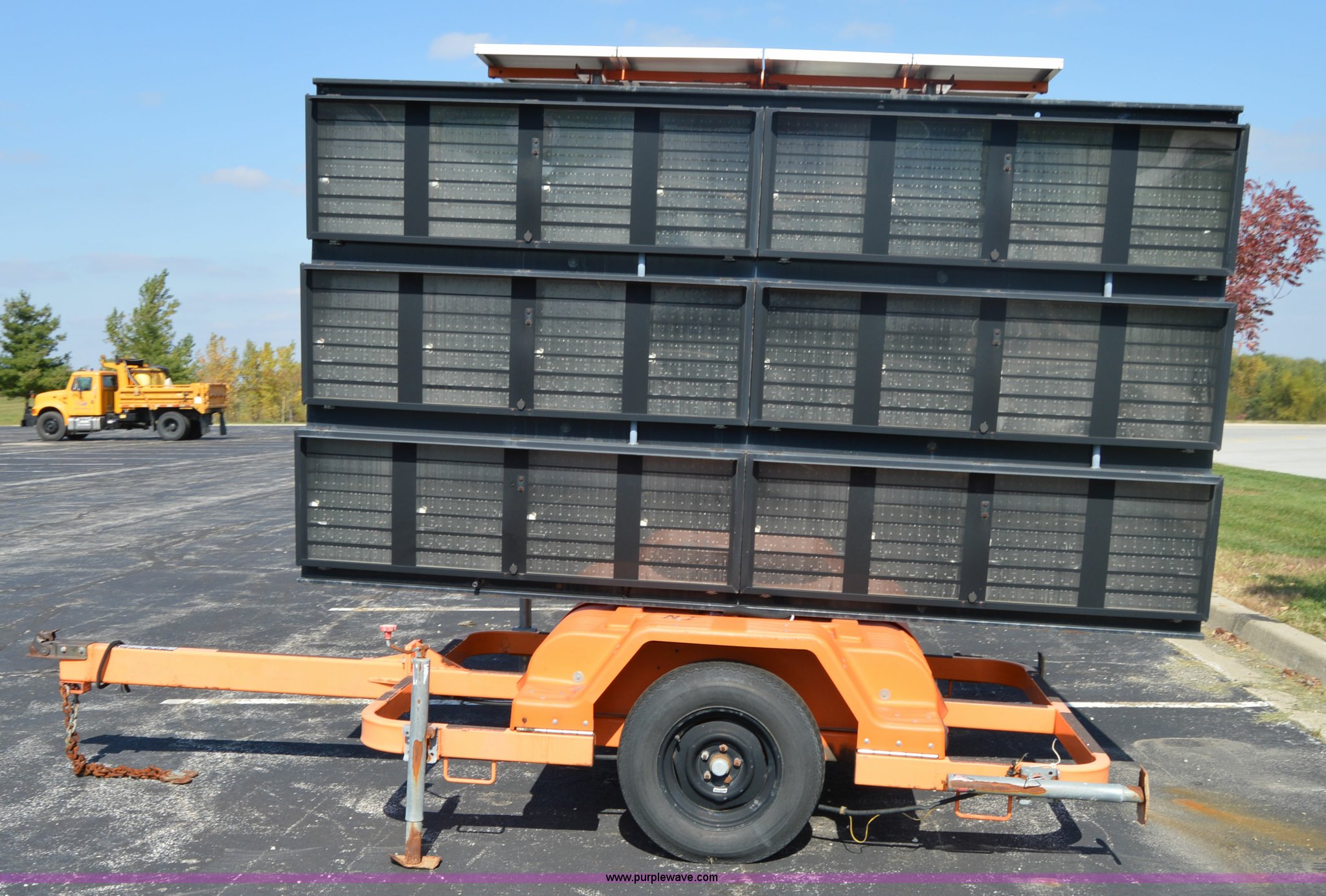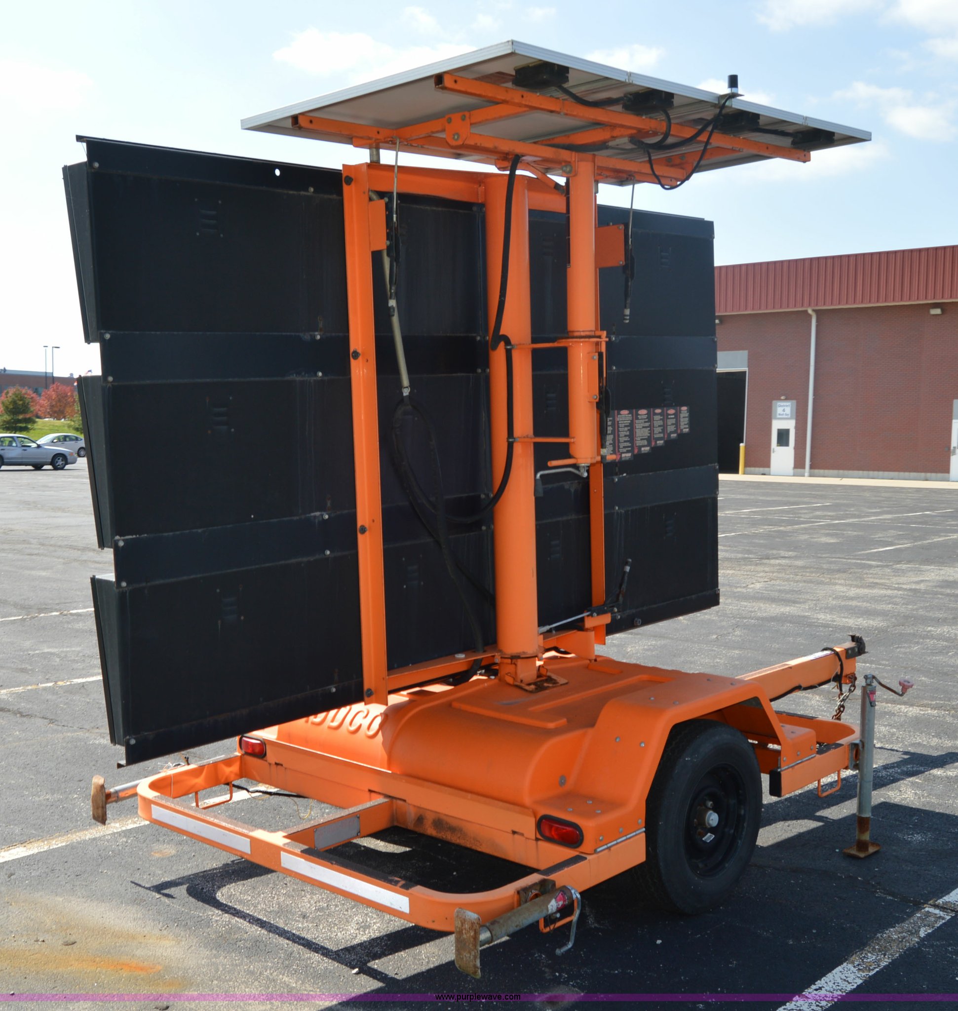 Purple Wave is selling a used Road Safety Equip. in Missouri. This item is a Addco sign board with the following: 11'W x 6'H, Manual outriggers, Battery operated, Manual jack, 2" ball hitch, 7.8-15 tires