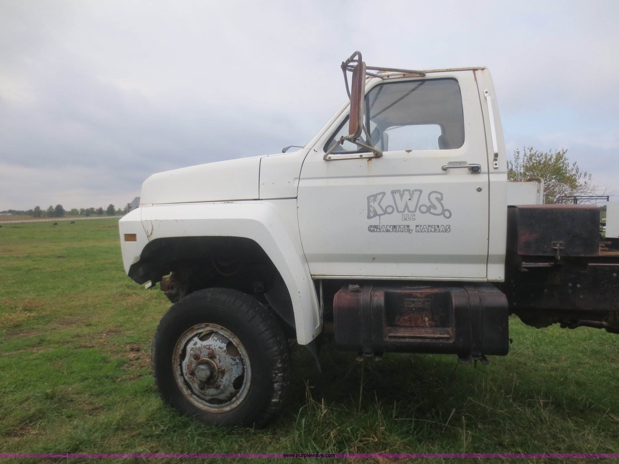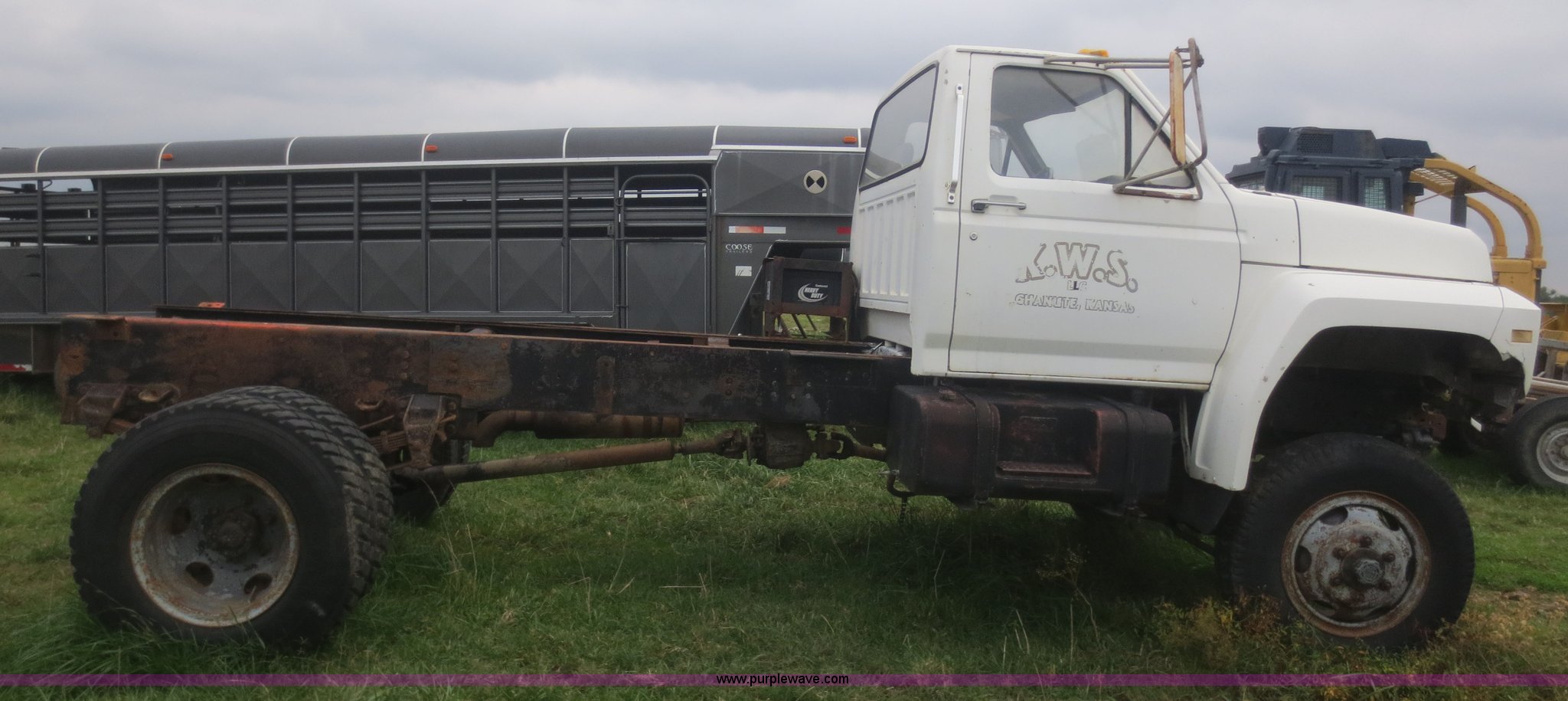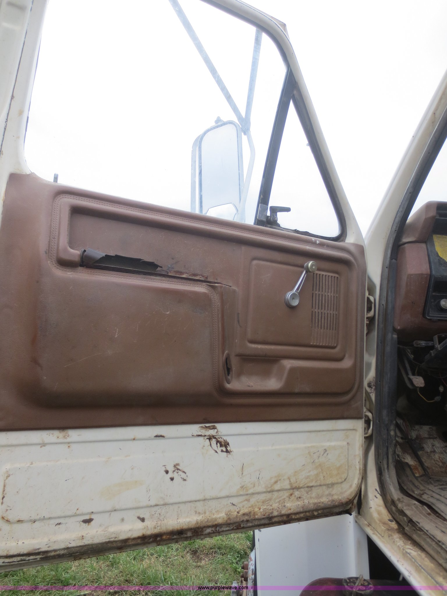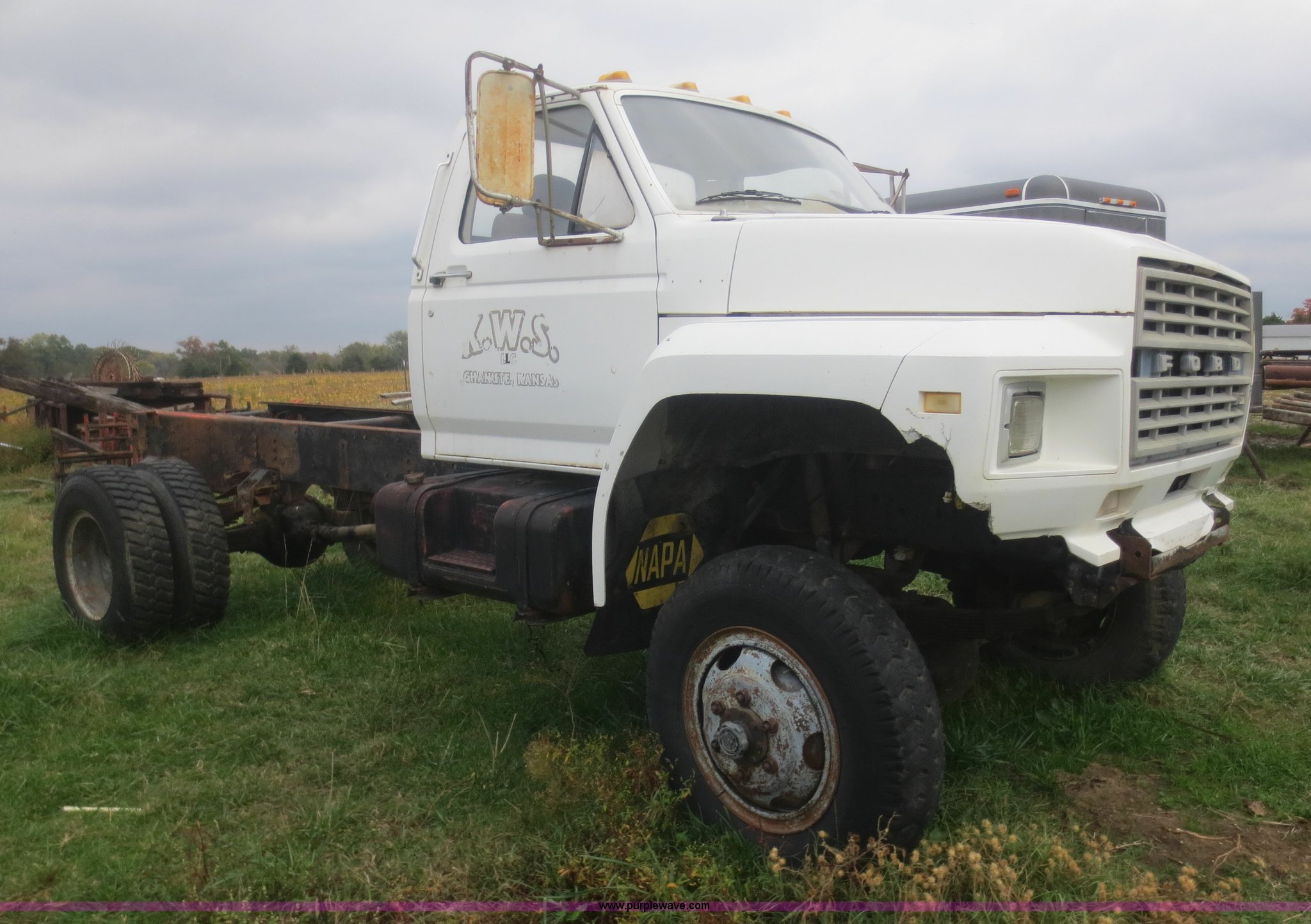 Purple Wave is selling a used Truck Chassis in Kansas. This item is a 1982 Ford F700 cab and chassis with the following: 28,570 miles on odometer, Actual mileage unknown, Detroit Diesel 8.2L V8 diesel engine, Five speed manual transmission, Four wheel drive, Heat, AM/FM/cassette, Cloth interior, Muncie PTO, Double frame, 171" wheelbase, Spring suspension, Hydraulic brakes, 9.00R20 tires, Wing window cracked, Batteries dead