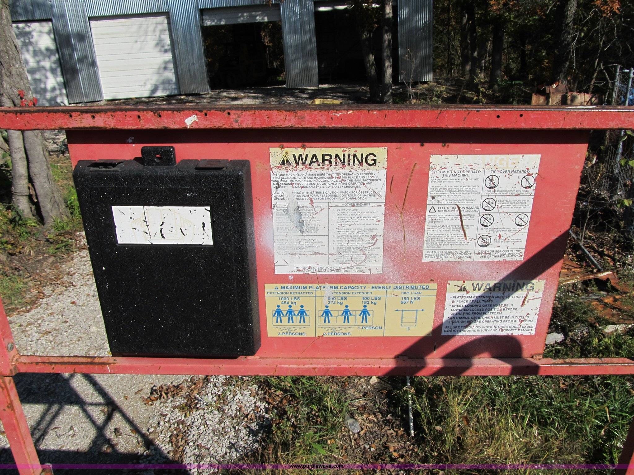 1999 Mec 3068ES scissor lift. 4,650 hours on meter, 30' maximum lift height, 1,000 lbs maximum lift capacity, 102" x 52"W platform, 48" slide out platform extension, 48V system, On-board charger, Platform power, Upper and lower controls, 7.50-10 solid non-marking tires, Cosmetic damage, Serial 089002984. 845 S.E. 350 Road. Knob Noster, MO 65336