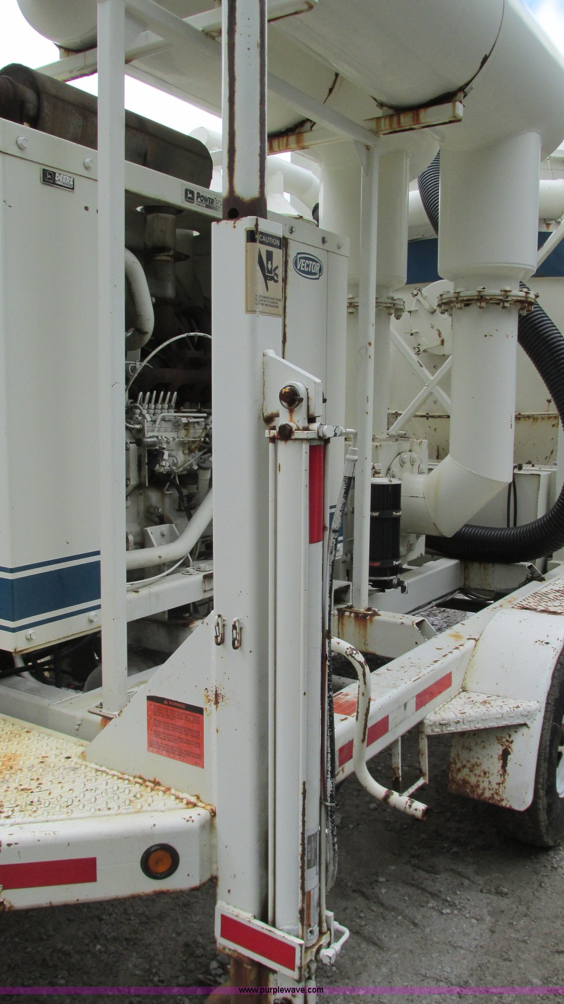 1999 Vector 07019 vacuum trailer. John Deere Titan 721 six cylinder diesel engine 235 HP, 2,006 hours on meter, Roots/dresser blower Serial RV62224-3, 3,660 CFM, 15 to 20 tons maximum bulk performance per hour, 425 gallons per minute liquid maximum performance, (4) hydraulic outriggers, 20'8" overall length, 8'3" overall width, 11.5' overall height, Pintle hitch, Electric brakes, LT235/85R16 tires, Approximately 13,950 lbs empty weight, Rear boom will not raise, Possible electric or hydraulic issue, Serial T0606SH777913. 1V9FTZT31W1090143. Buschman Brothers Inc.. 2817 County Road S 50 East. Winamac, IN 46996