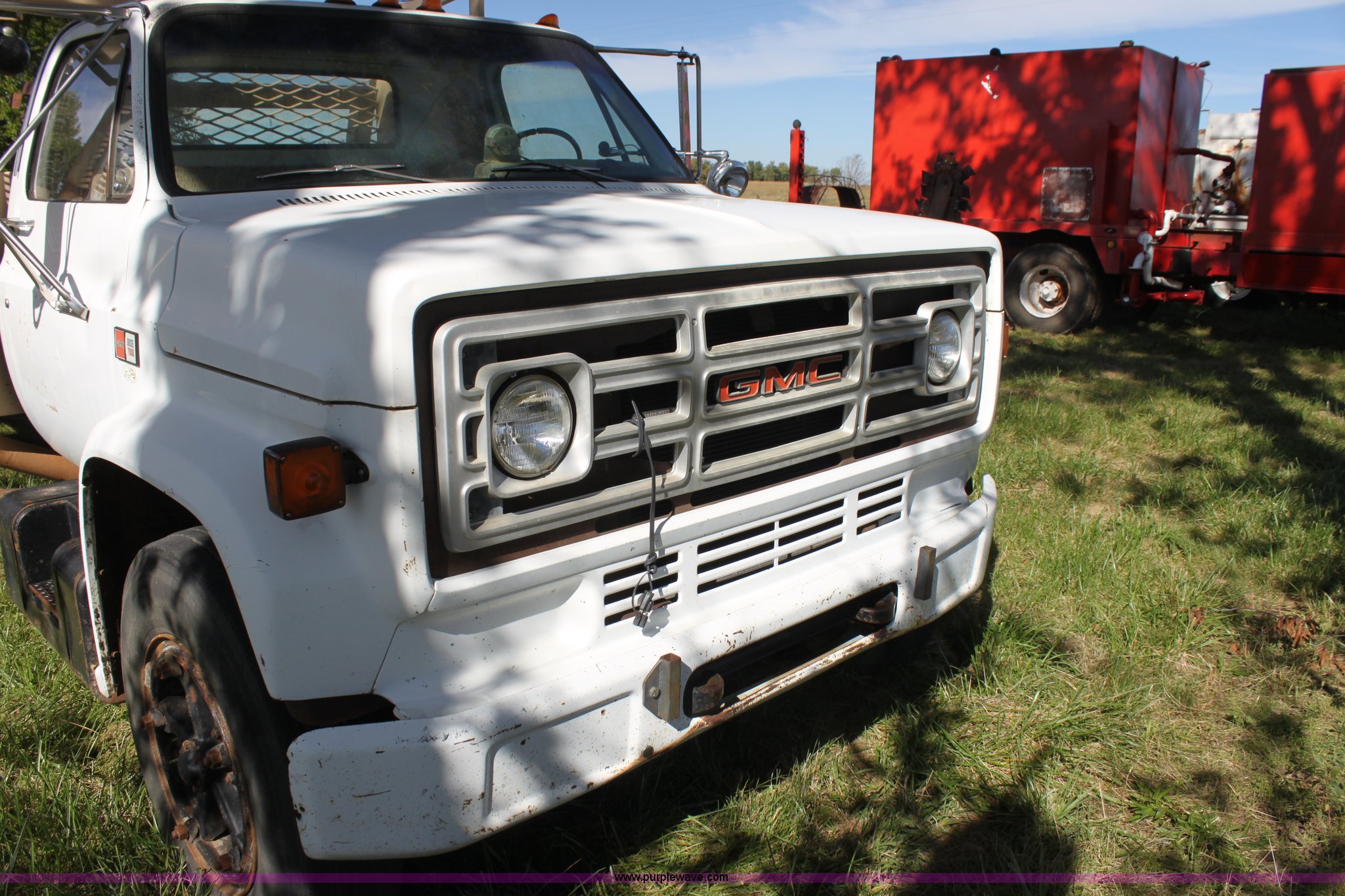 1985 GMC TopKick 7000 winch truck. 459 miles on odometer Actual mileage unknown, 8.2L V8 diesel engine, Five speed manual transmission, Two speed rear end, Micro brake lock, PTO, Hoist, Rolling tail board, 12' gin poles, 42"H grain side boards, Spring suspension, Hydraulic brakes, 9.00R20 tires. 1GDJ7D1F2FV504499. Trimble & Maclaskey Oil LLC. Gridley, KS 66852