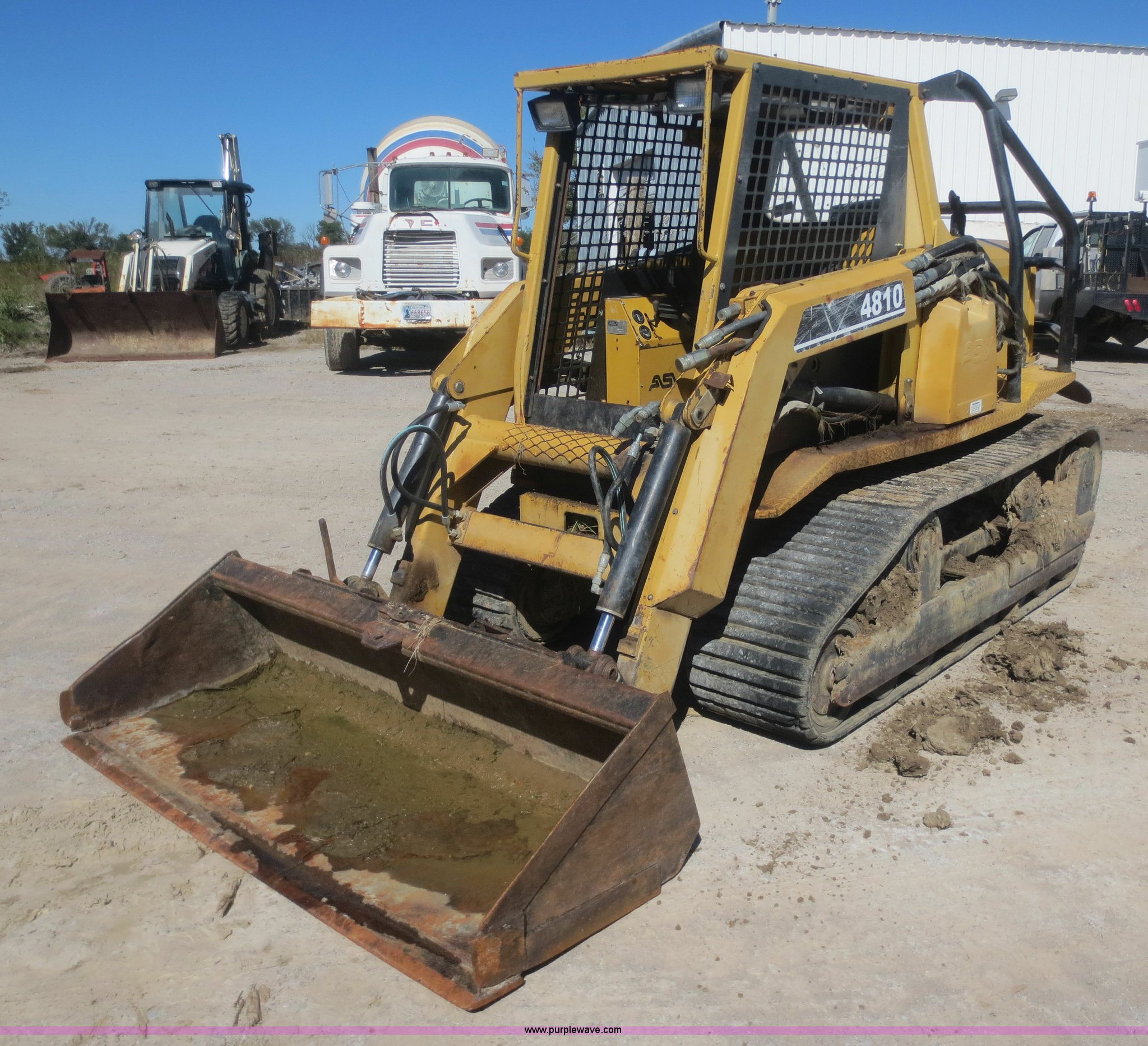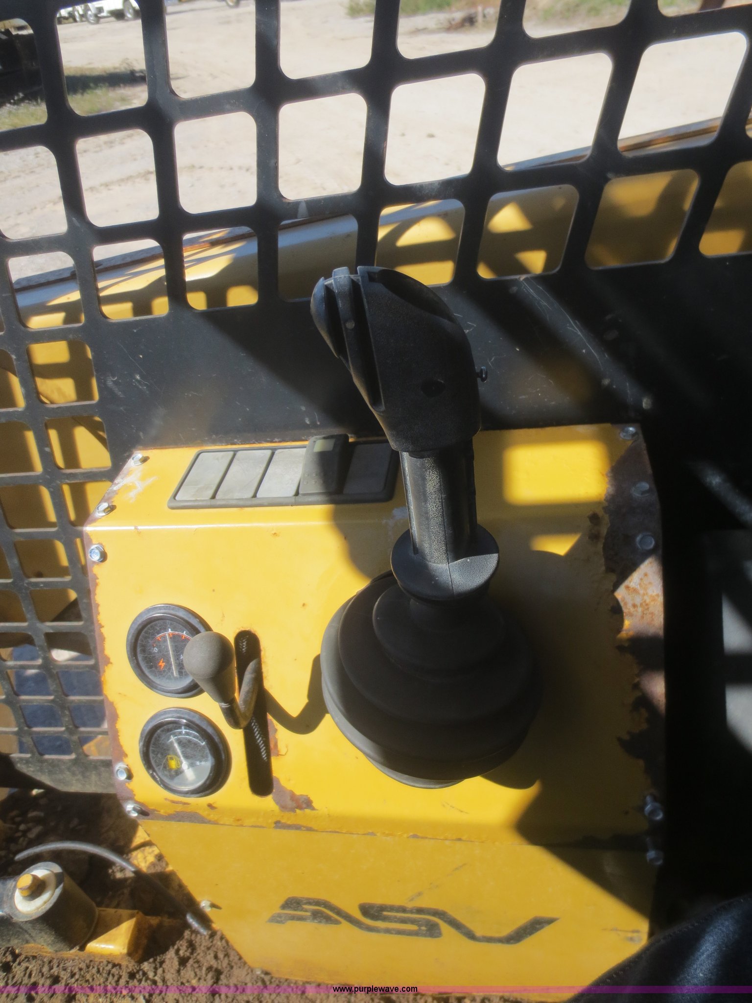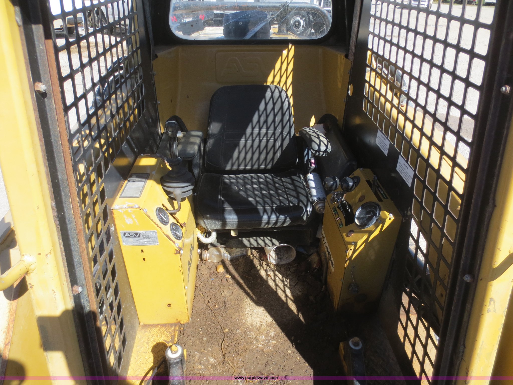 Purple Wave is selling a used Tracked Skid Steer Loader in Oklahoma. This item is a ASV 4810 skid steer with the following: 1,288 hours on meter, Perkins four cylinder turbo diesel engine, Hydrostatic transmission, Joystick controls, 72"W low profile bucket, Weld-on cutting edge, Manual quick coupler, High flow auxiliary hydraulics, Front and rear work lights, Eight bottom rollers, 17"W tracks, Rear window cracked, Serial ANC0020