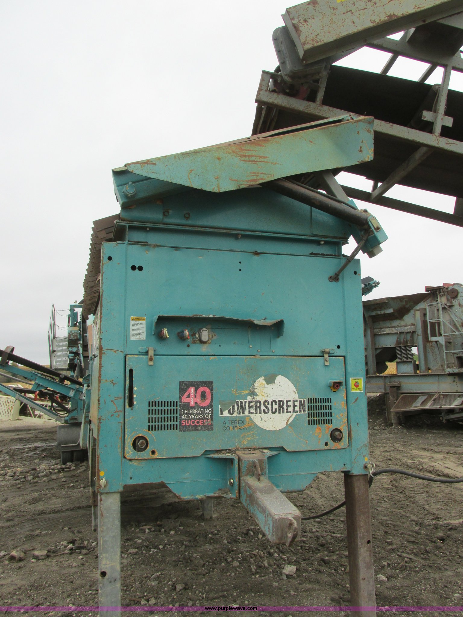 Purple Wave is selling a used Screen or Screening Plant in Minnesota. This item is a 2006 Powerscreen Turbo Chieftain dual deck screen with the following: 4,770 hours on meter, Deutz four cylinder diesel engine, 14' x 5' primary intake hopper, 14' x 42" main hopper belt, Approximately 35' x 42" primary belt, (2) side discharge conveyors, Hydraulic adjustment, 25", 48" rear discharge conveyor, Hydraulic adjustment, Work platforms, 10' x 5' dual rear screen, Trailer wiring, Spring suspension, Air brakes, 235/75R17.5 tires, Cosmetic damage, Serial 6618730