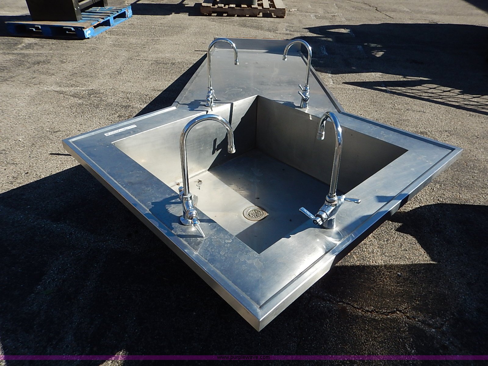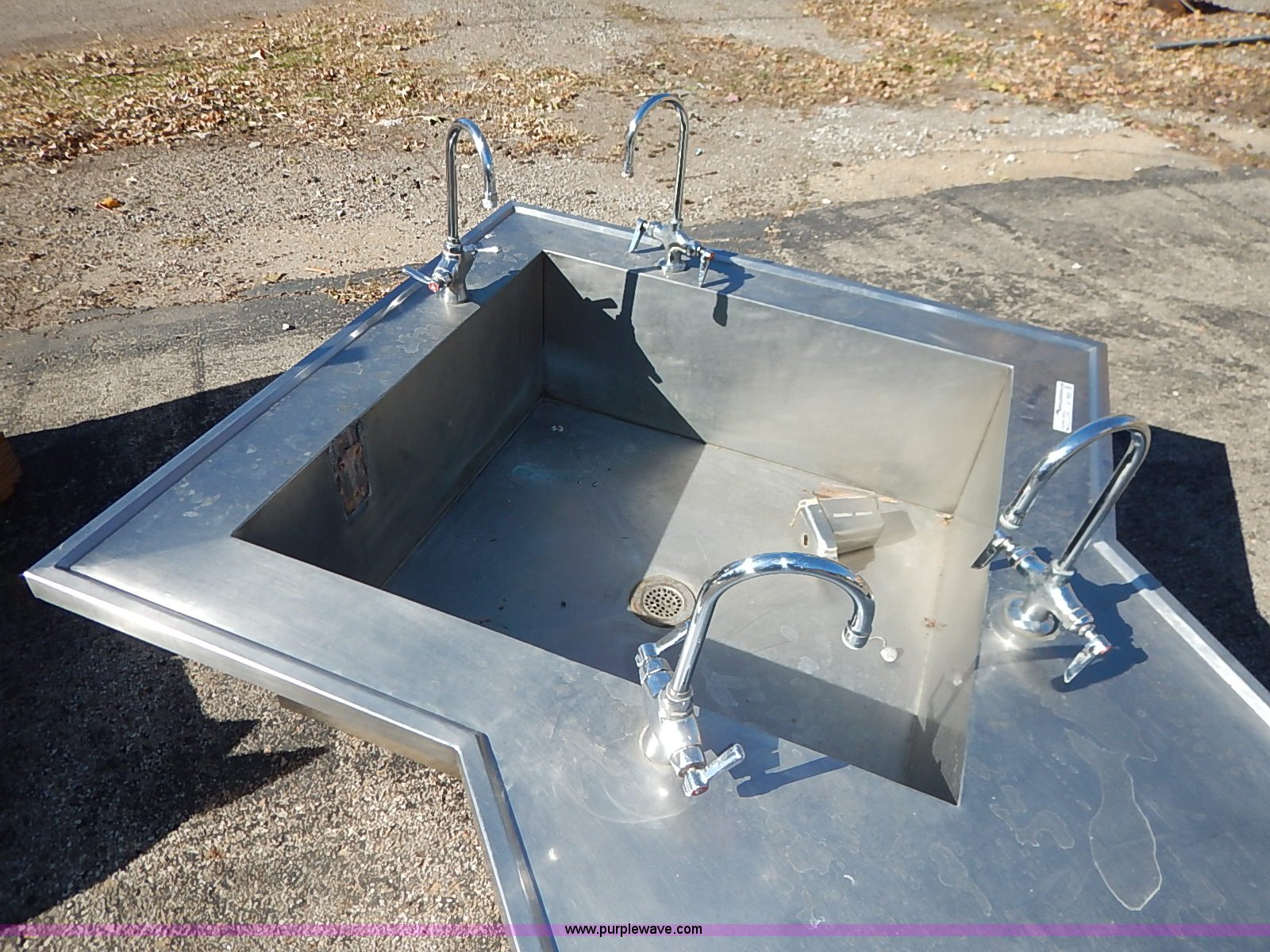 Purple Wave is selling a used Restaurant Equip. in Kansas. This item is a Stainless steel sink/counter top with the following: (4) faucets, 35.5" x 35.5" x 16" sink, 76" x 3'W counter top, 134"L overall