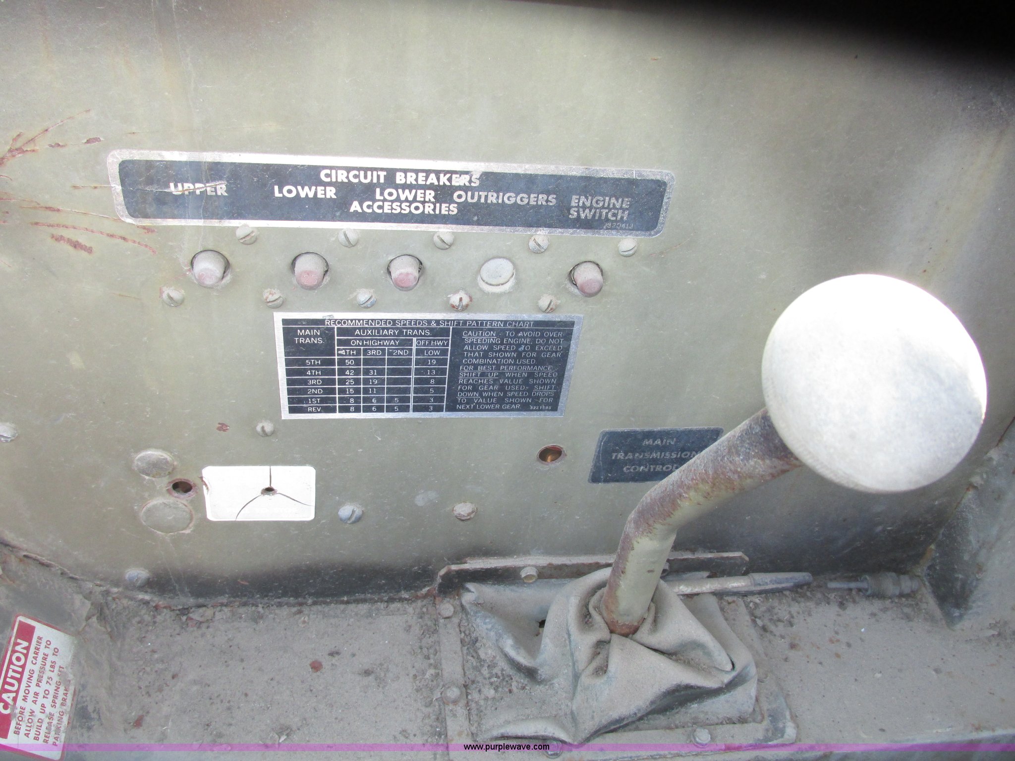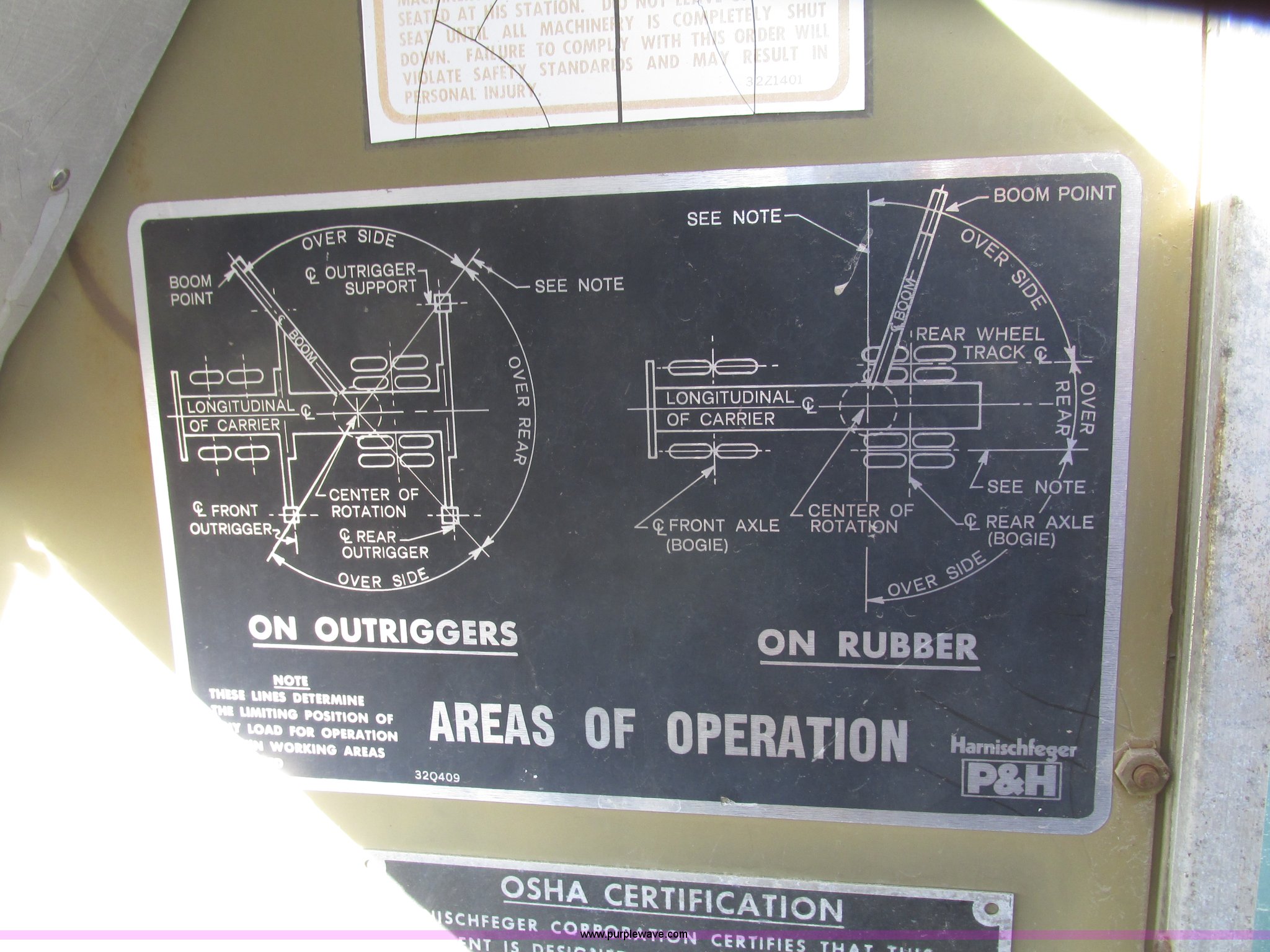 1975 P & H MT-250 hydraulic crane. 6,305 miles on odometer, Detroit Diesel 6V53N 210 HP, Dana Spicer transmission Five speed with four speed splitter, Locking differential, Enclosed cab, Heat, 25 ton maximum lift capacity, 80' maximum lift height, 75' maximum reach, Three boom sections, Hydraulic outriggers 36" x 36" outrigger pads, Weight load indicator, Class 1,290 rated, Approximately 37.5'L x 96"W overall dimensions, Fire extinguisher, 11.00-20 tires, Operator, parts, and service manuals, Non-operational pitch guage, Last used December 2009, Last ran 2011, Main lift cylinder leaks, Non-operational unit, Unit# 59. Seward County. 3427 Waverly Road. Seward, NE 68434