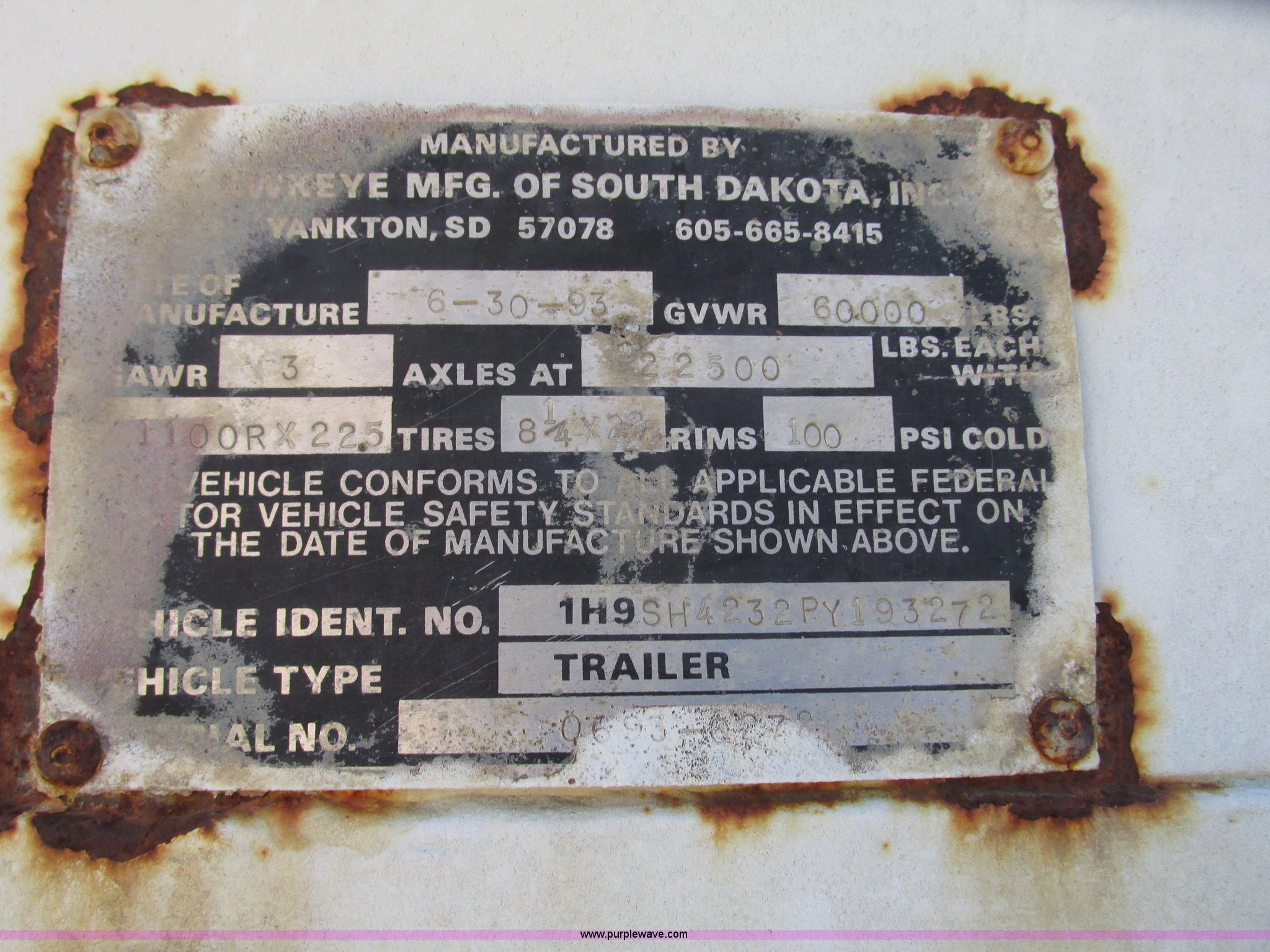 1993 Dakota DB4200 belly dump trailer. 42'L x 95"W, 11'7.5"L hopper bottom, 19'3"L hopper bottom, Tarp tie downs, 44"W x 16"D push bumper, 102"H form ground to top of side board, Hopper mounted jack, Mud flaps, Gland hand and trailer wiring, Spring suspension, Air brakes, 11R22.5 tires, GVWR 60,000 lbs, GAWR 22,500 lbs, One owner , Hoppers rusted, Unit has not moved in more than three years, Unknown operating condition, One tire low. 1H9SH4232PY193272. Seward County. 3427 Waverly Road. Seward, NE 68434