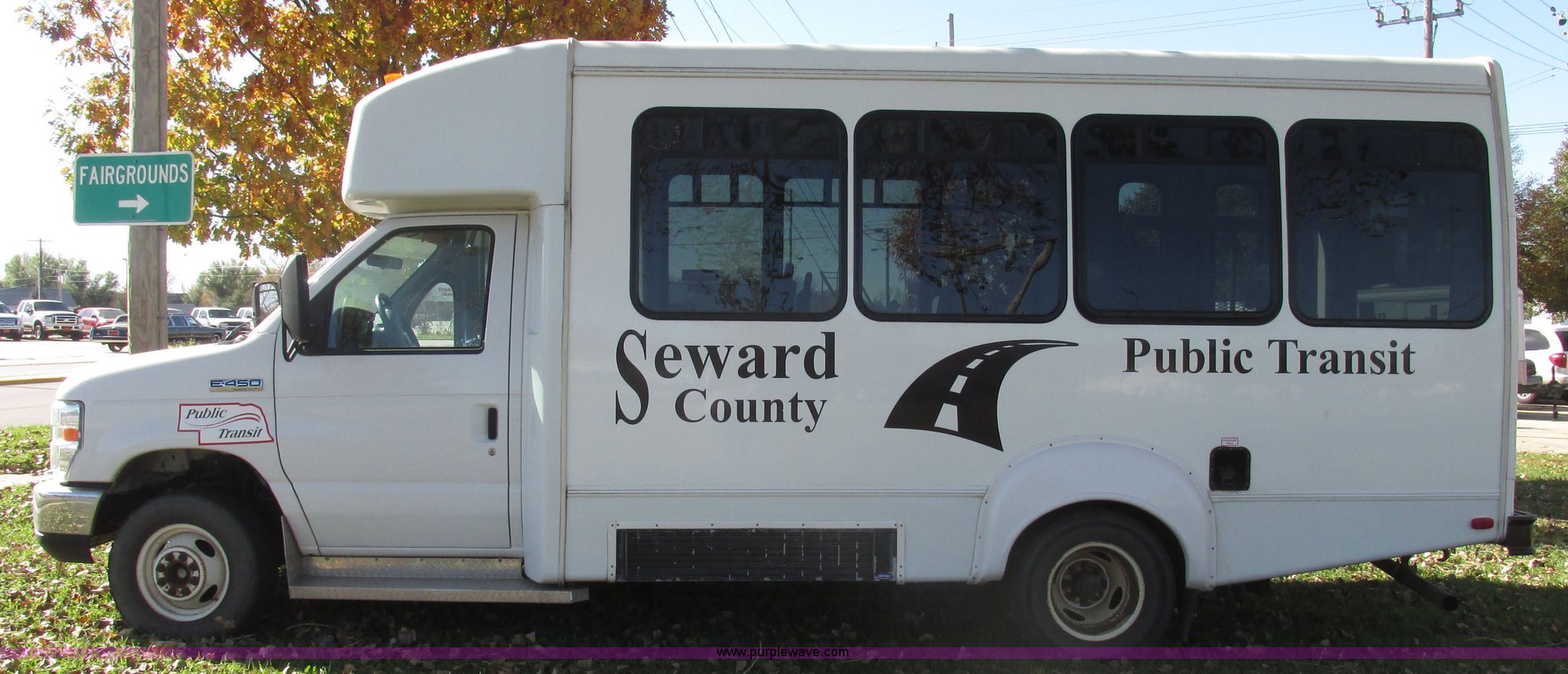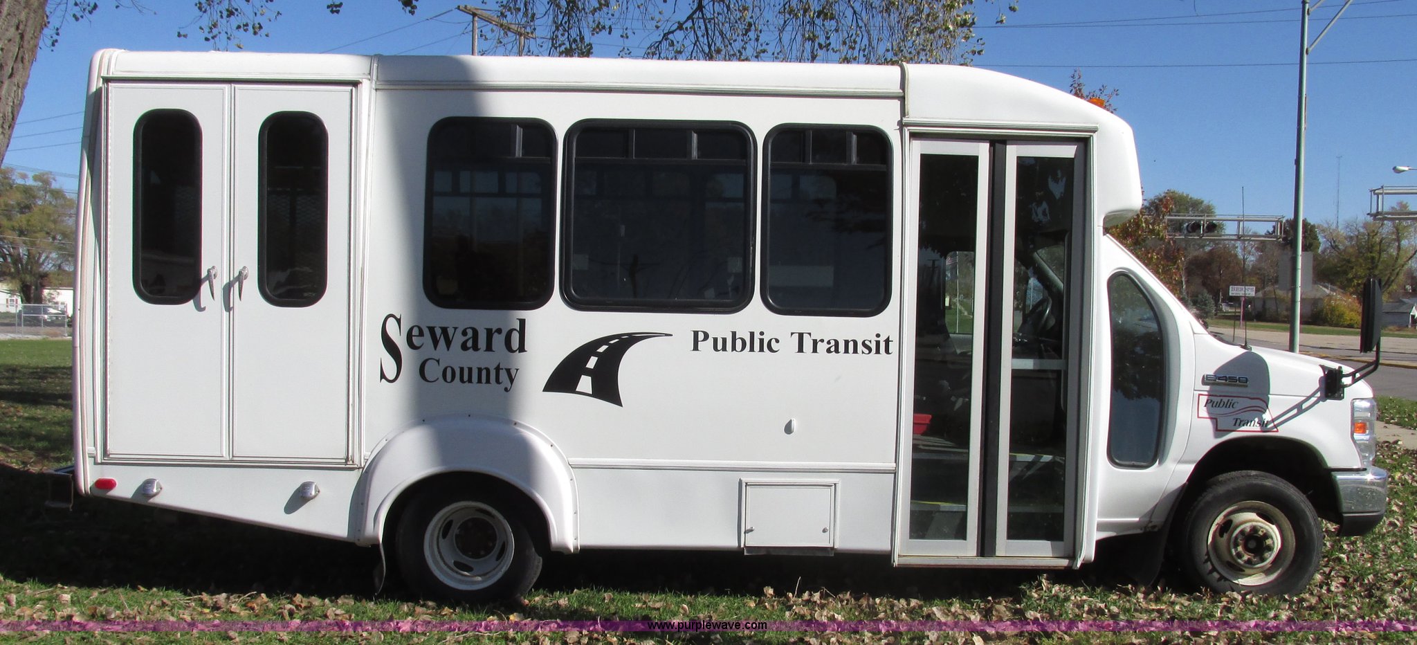 2008 Ford E450 Super Duty Goeshen coach bus. 157,099 miles on odometer, 7,602 hours on meter, 6.8L V10 SOHC 20V gas engine, Automatic transmission, AC and heat, Tilt, Cruise, AM/FM Overhead speakers, Manual windows and locks, Front and rear fan controls, Intermotive advanced fast idle system, Intermotive Intelligent lift system, 13 passenger capacity, Carrier rear air conditioner, Braun Millenium Series wheel chair lift 2008 Model NL919F1B-2, 51"L x 34"W, 9" fold down ramp, 800 lbs maximum lift capacity, Inoperable remote control, Manual lift operable, Sure Lok wheelchair accessories, Block heater, Mud flaps, Highway triangles, Backup alarm, 158" wheelbase, Firestone LT225/75R16 tires, GVWR 14,500 lbs, FAWR 5,000 lbs, RAWR 9,500 lbs. 1FD4E45S38DB51628. View equipment video. Seward County. 320 S 14th St. Seward, NE 68434