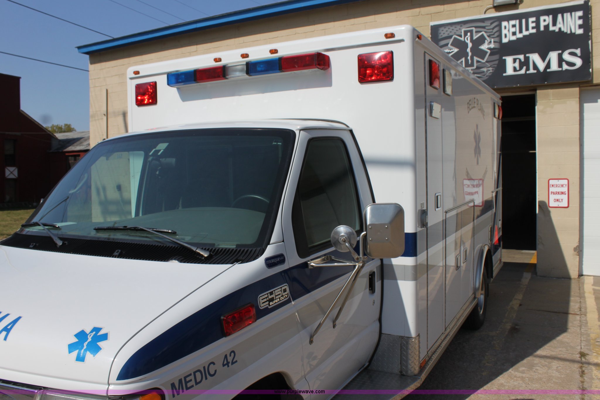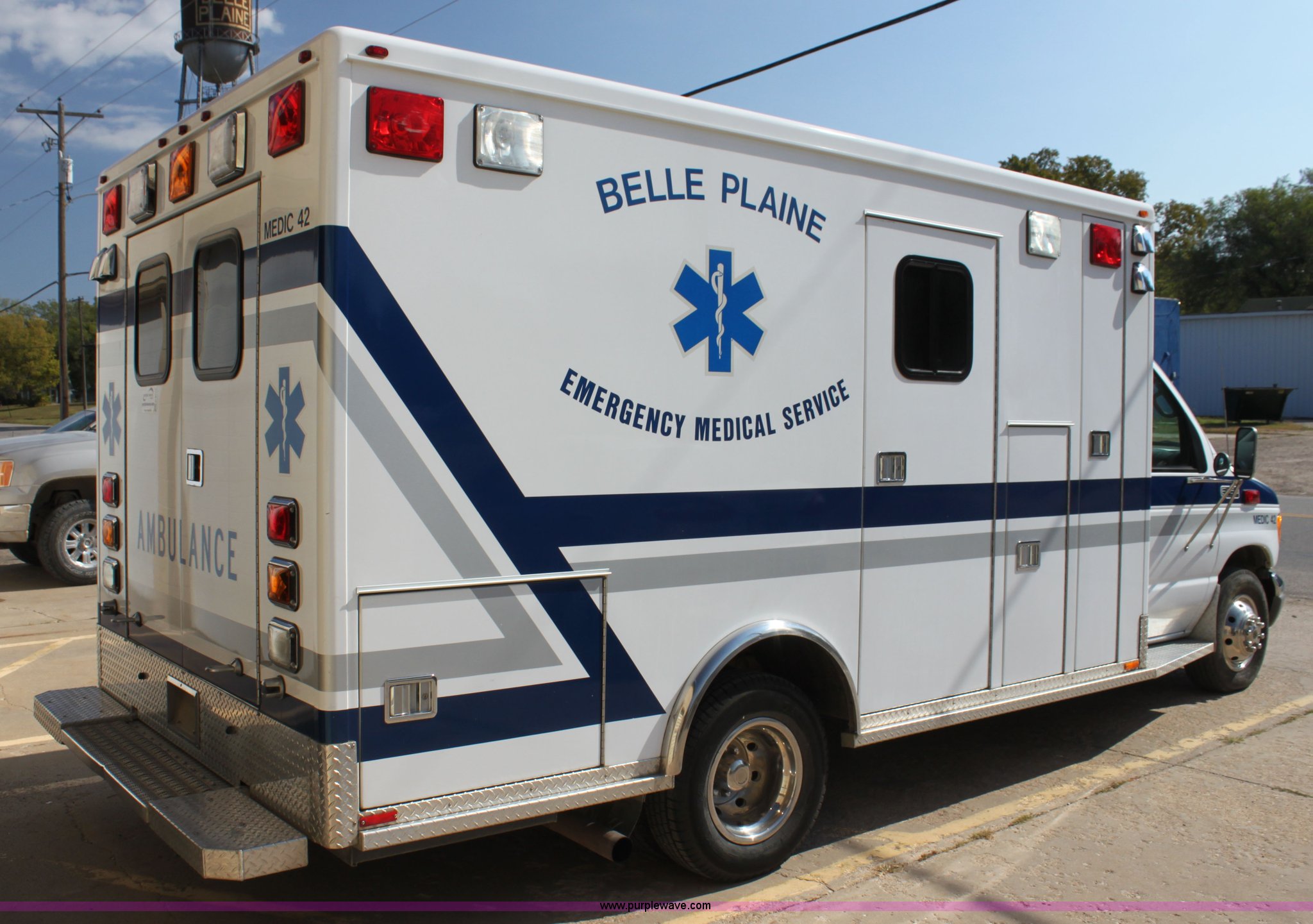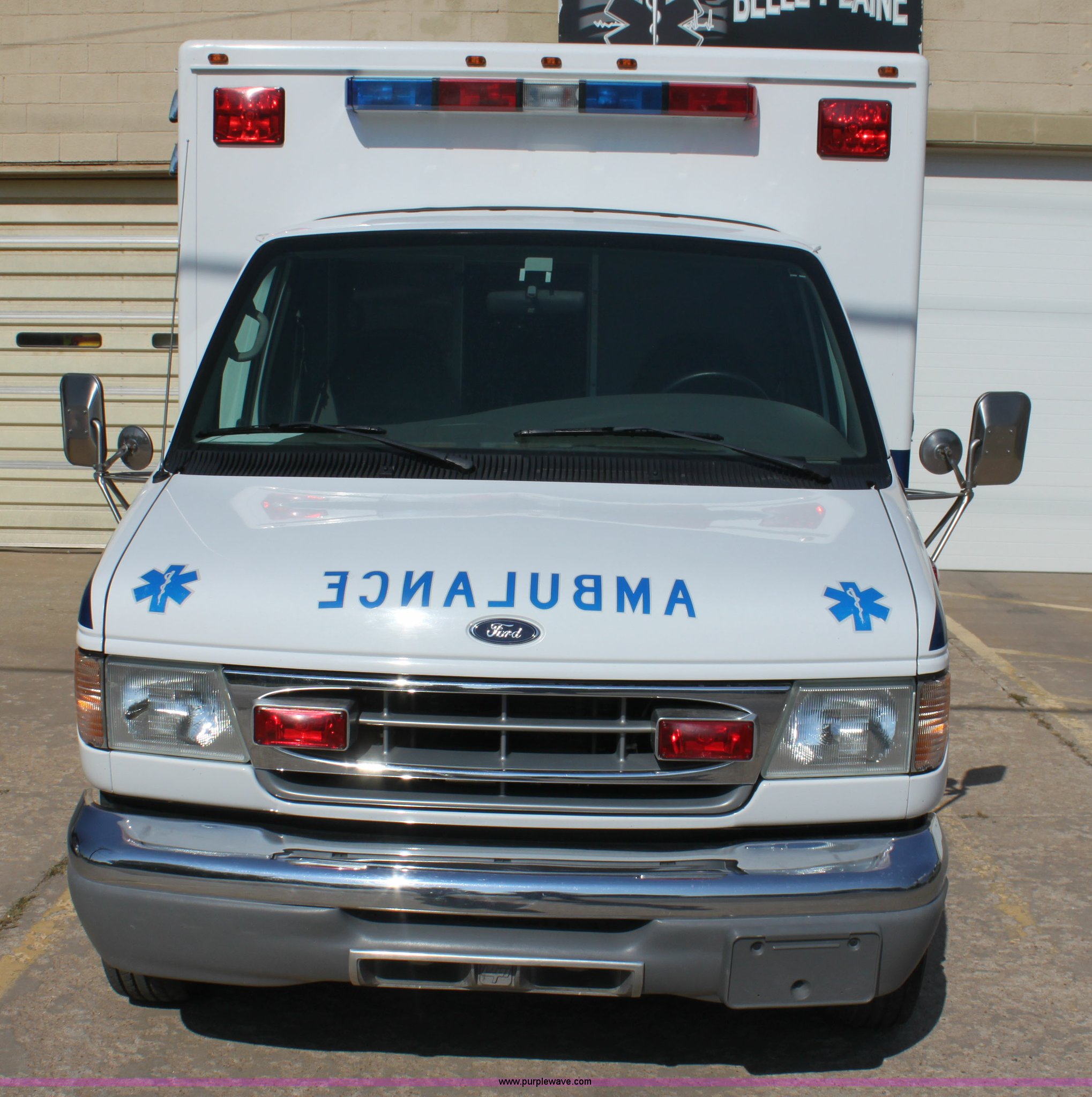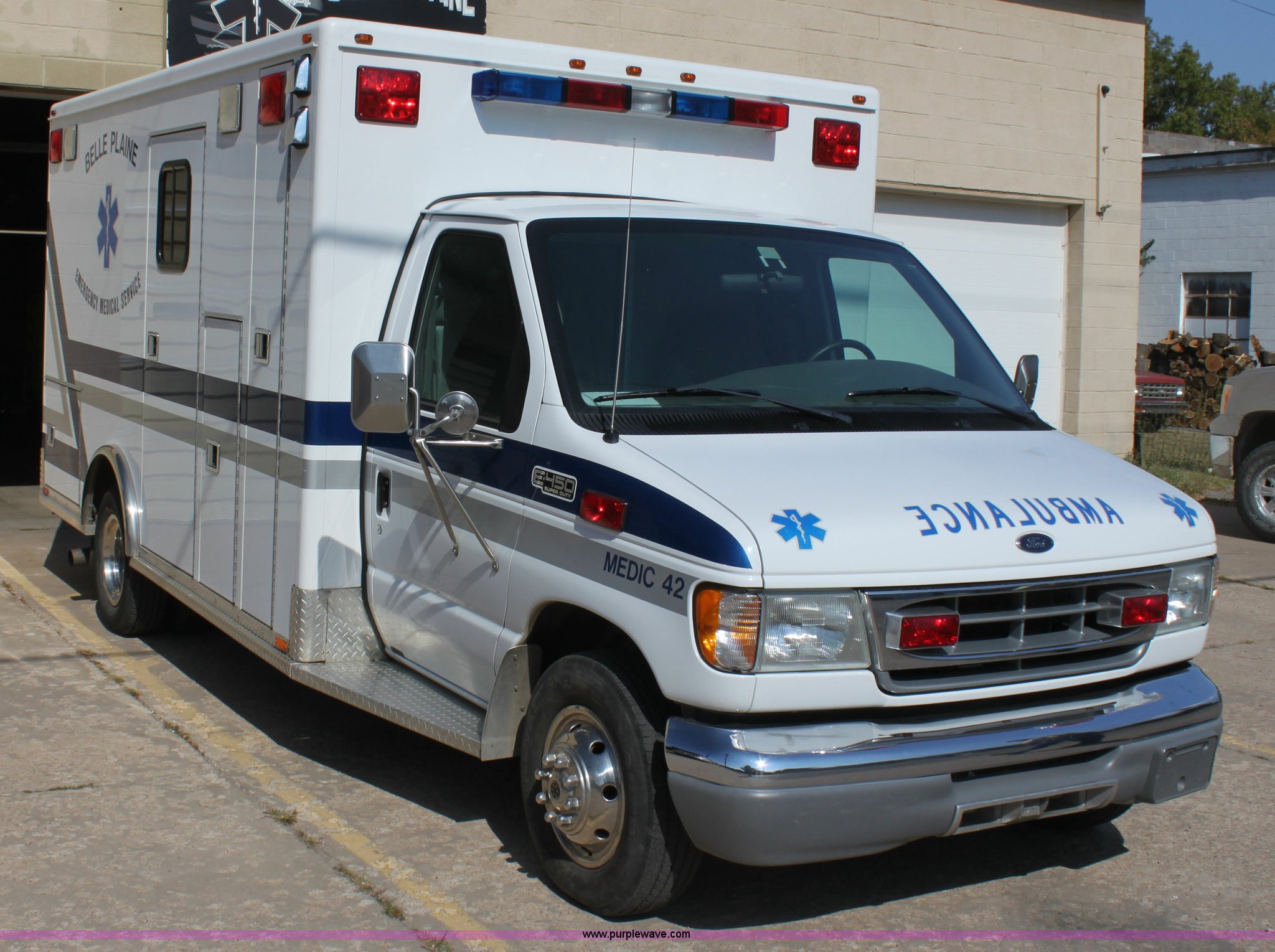 Purple Wave is selling a used Fire Truck or Emergency Vehicle in Kansas. This item is a 2002 Ford 801 ambulance with the following: 41,605 miles on odometer, 2,934 hours on meter, 7.3L V8 OHV 16V diesel engine, Automatic transmission, AC and heat, Tilt, Cruise, AM/FM, Power windows and locks, Emergency lights and sirens, 225/75R16 tires