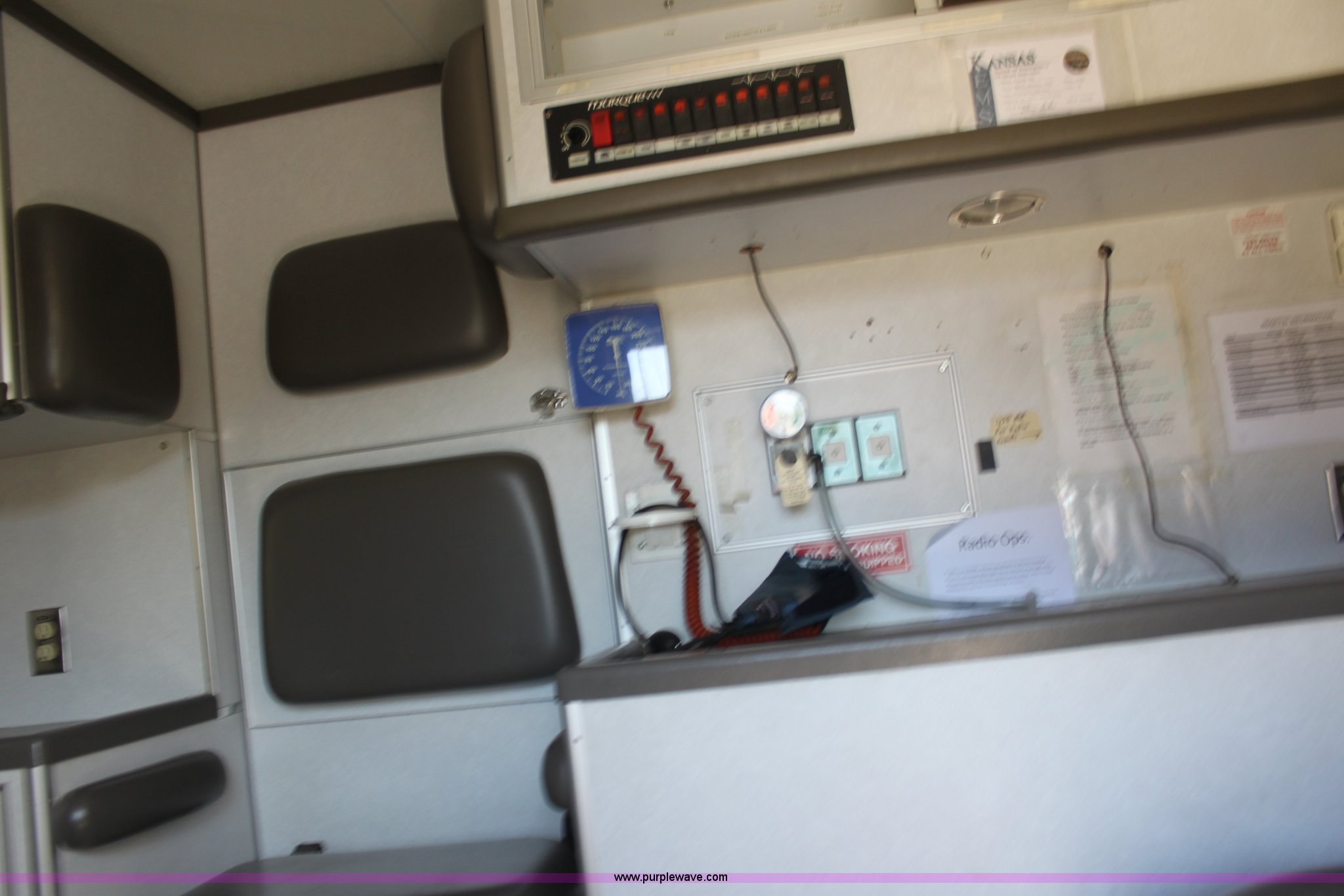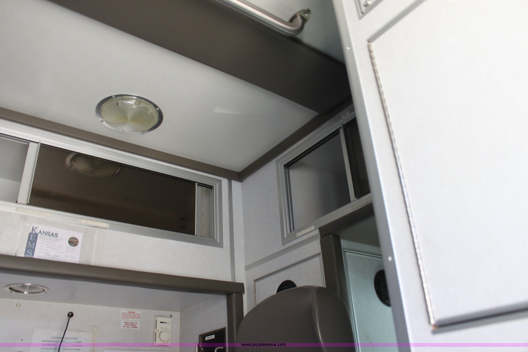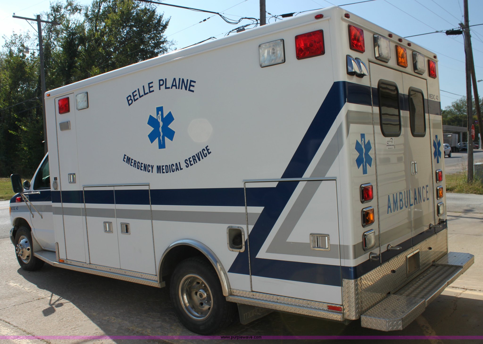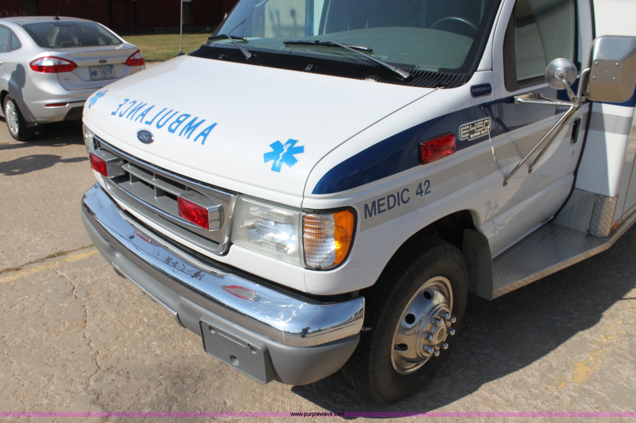 Purple Wave is selling a used Fire Truck or Emergency Vehicle in Kansas. This item is a 2002 Ford 801 ambulance with the following: 41,605 miles on odometer, 2,934 hours on meter, 7.3L V8 OHV 16V diesel engine, Automatic transmission, AC and heat, Tilt, Cruise, AM/FM, Power windows and locks, Emergency lights and sirens, 225/75R16 tires