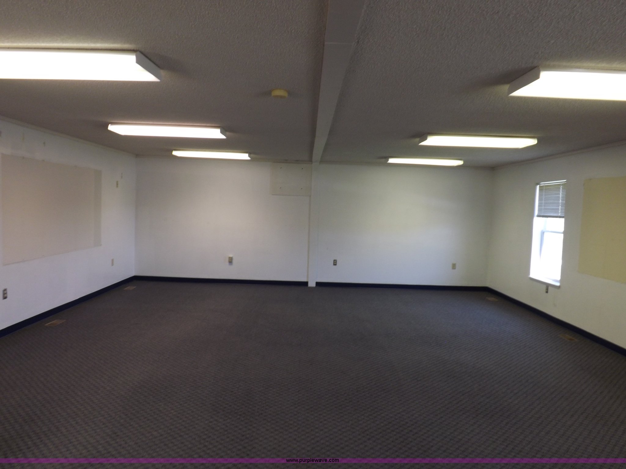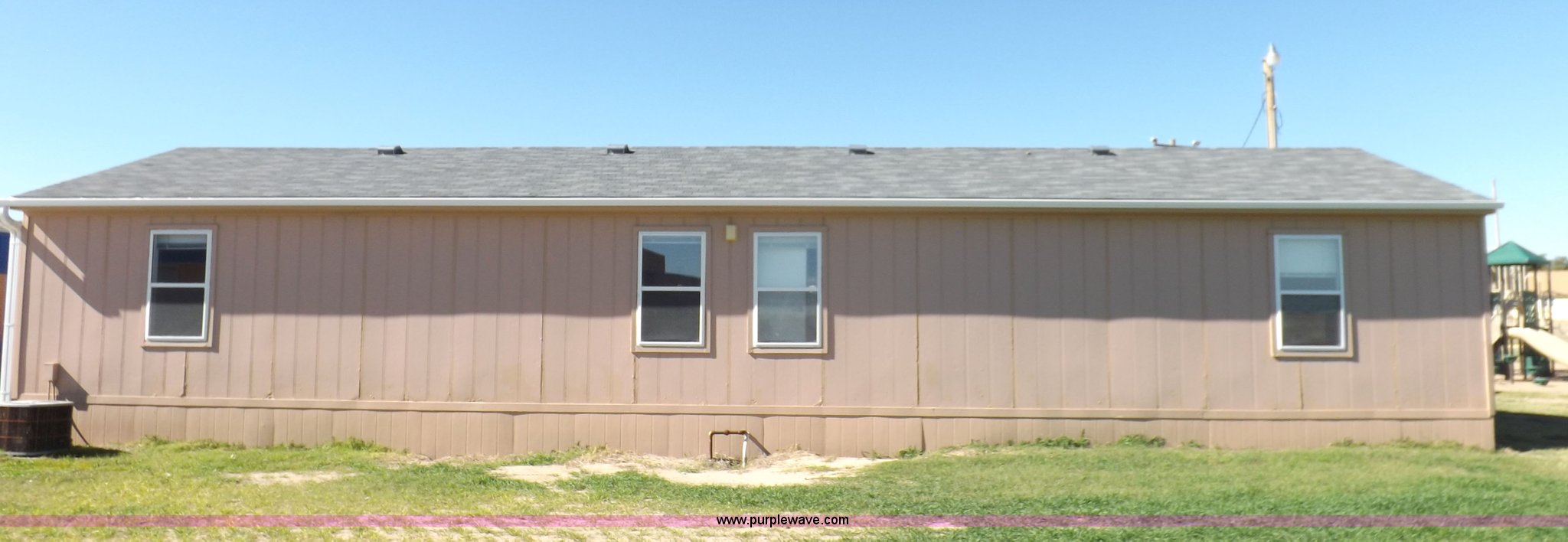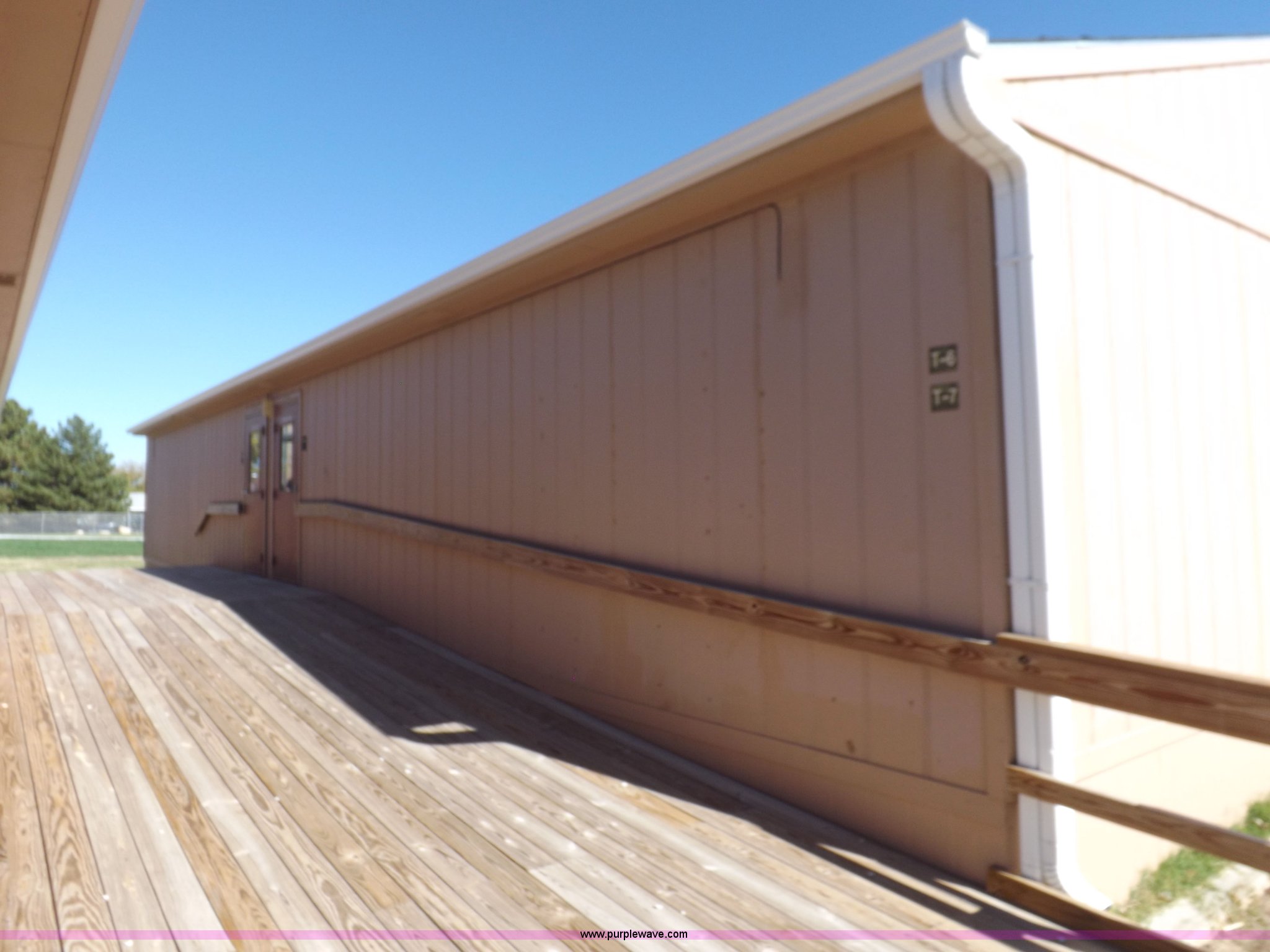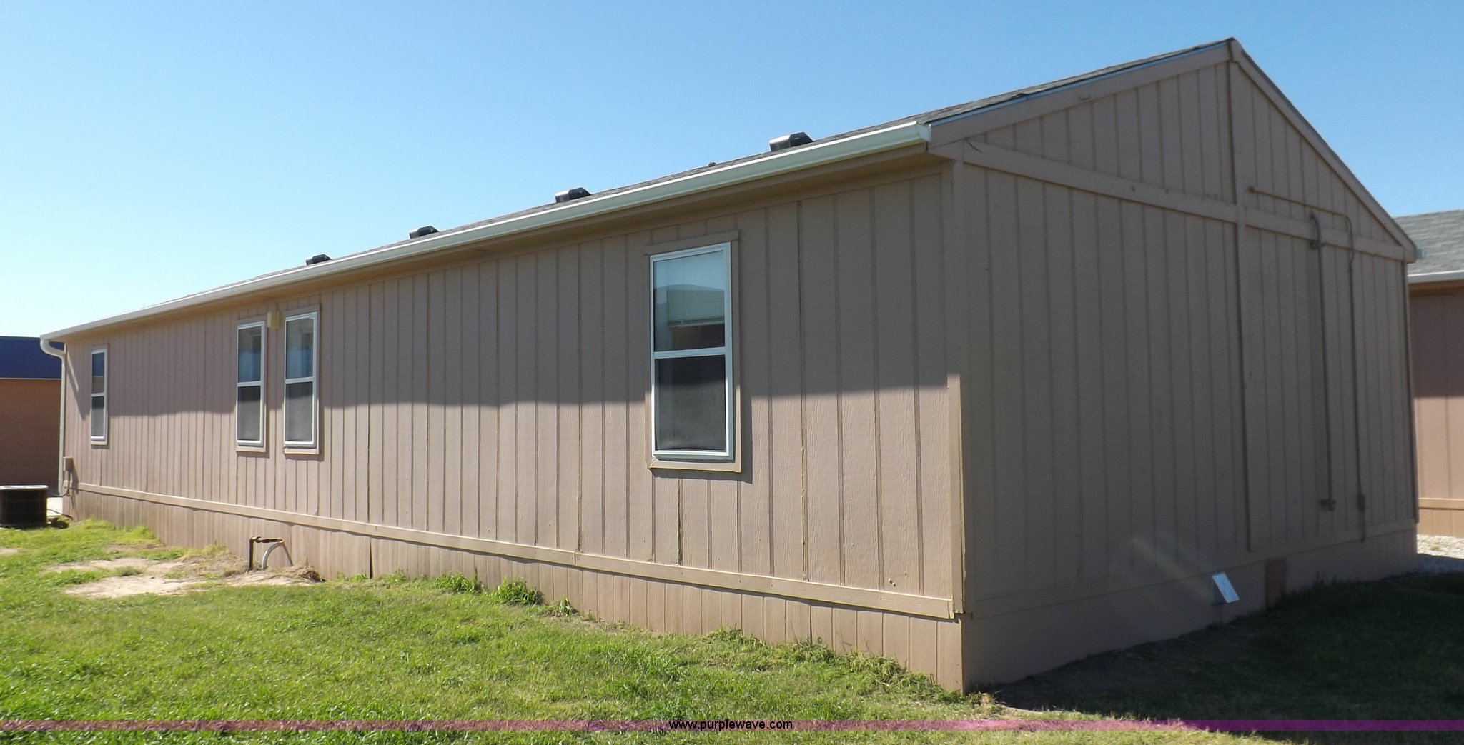 Modular building. 64'L x 24'W, 8'H ceilings, (2) rooms, (2) 36"W x 6'8" steel doors Seargant hardware and keys, (4) 34" x 58" windows, 100 amp electrical service, 4/12 pitch roof, Composition shingles, Lenox heat pump heat and air conditioning, Emergency exit lights and horn, Wired category five cable, Wired phone, Masonite siding and skirting, Guttering on both sides with end drains, Acoustic ceiling, Surface mount fluorescent lighting, Glue down carpet, Soffit and roof vents, 2" x 6" construction, Treat lumber steps, deck, and ramp, No steel frame, beams, or axles, Power and gas service will be disconnected, Building must be removed. USD 102. 314 N 1st St. Cimarron, KS 67835