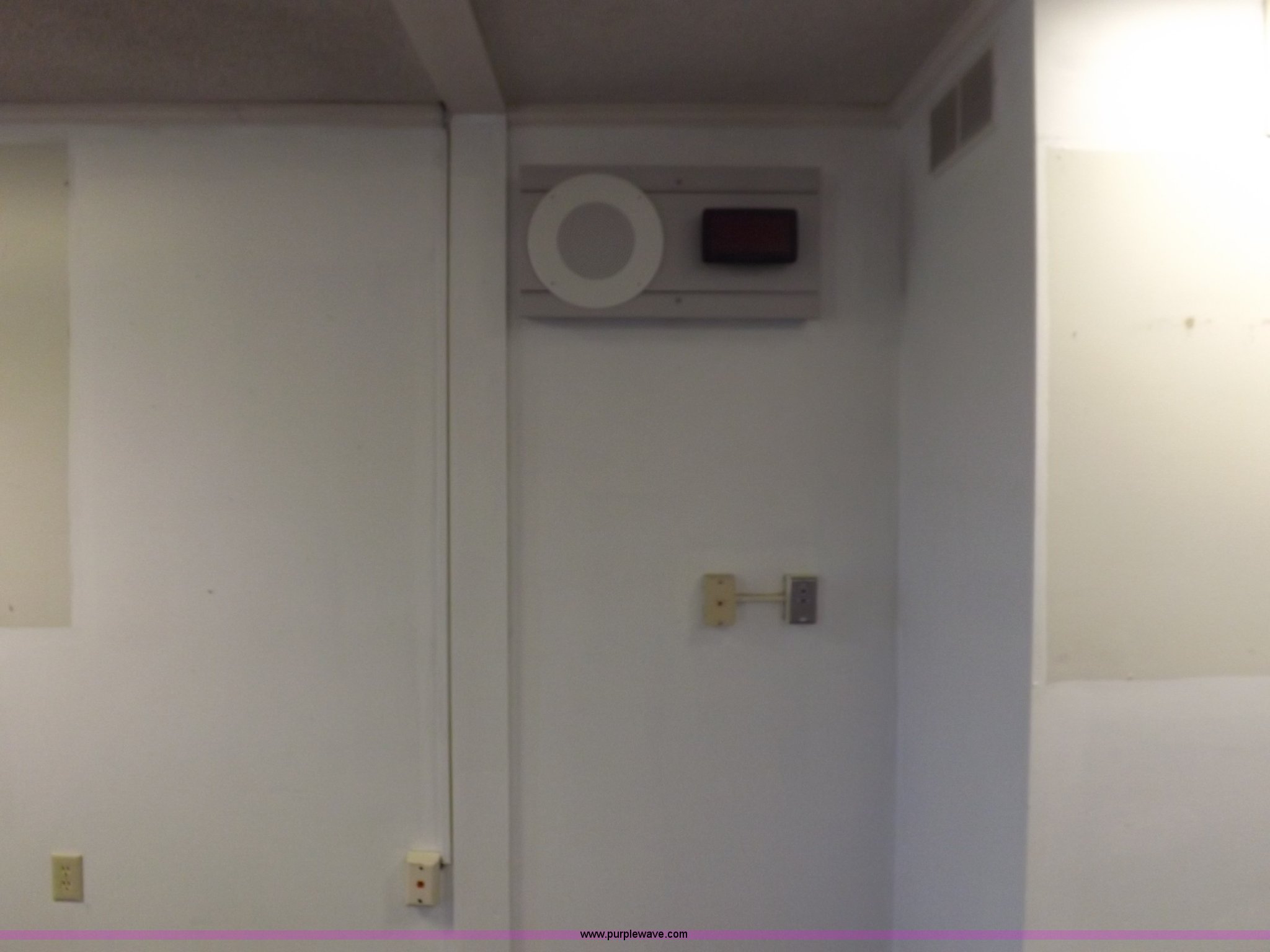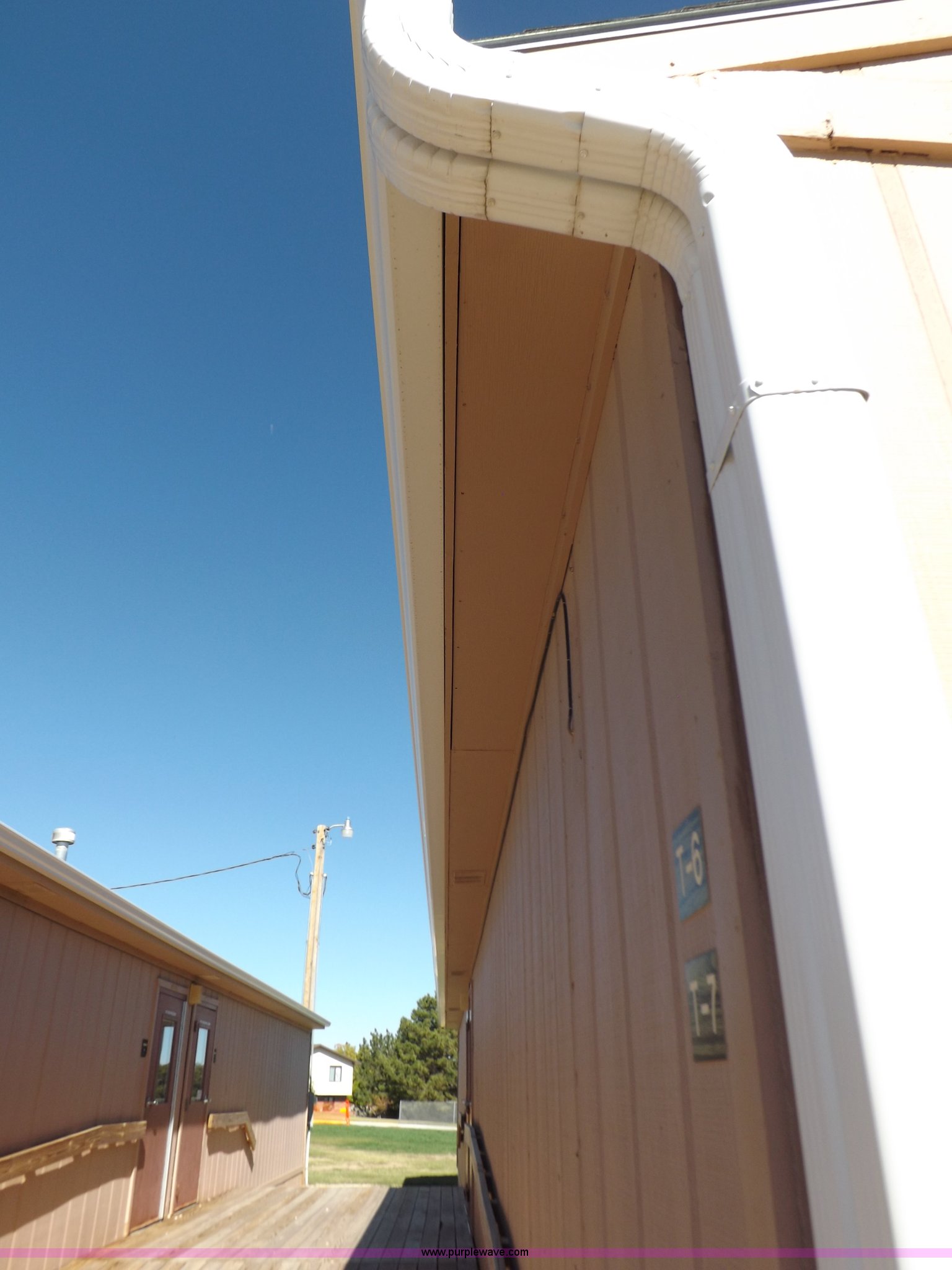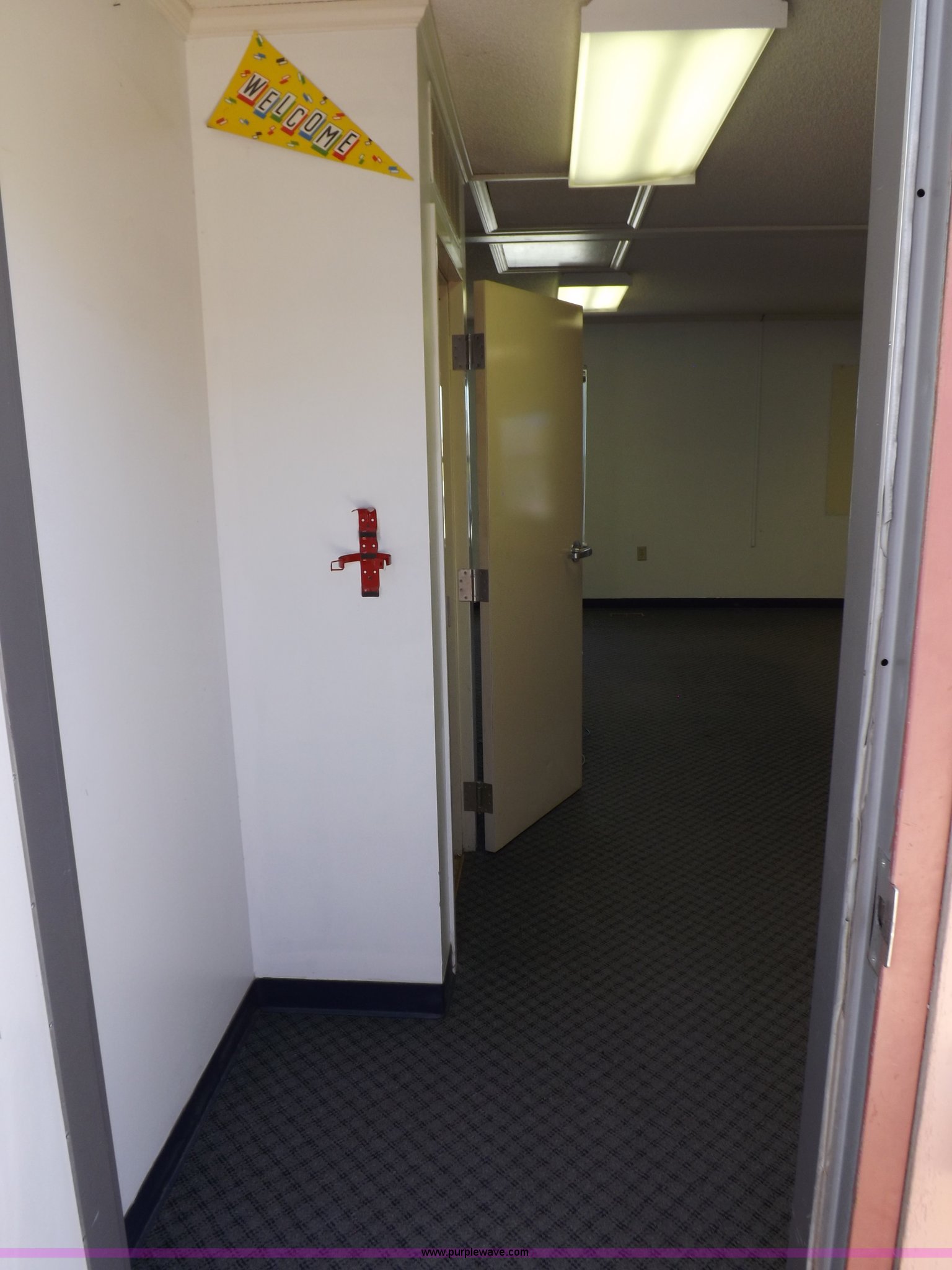 Modular building. 64'L x 24'W, 8'H ceilings, (2) rooms, (2) 36"W x 6'8" steel doors Seargant hardware and keys, (4) 34" x 58" windows, 100 amp electrical service, 4/12 pitch roof, Composition shingles, Lenox heat pump heat and air conditioning, Emergency exit lights and horn, Wired category five cable, Wired phone, Masonite siding and skirting, Guttering on both sides with end drains, Acoustic ceiling, Surface mount fluorescent lighting, Glue down carpet, Soffit and roof vents, 2" x 6" construction, Treat lumber steps, deck, and ramp, No steel frame, beams, or axles, Power and gas service will be disconnected, Building must be removed. USD 102. 314 N 1st St. Cimarron, KS 67835