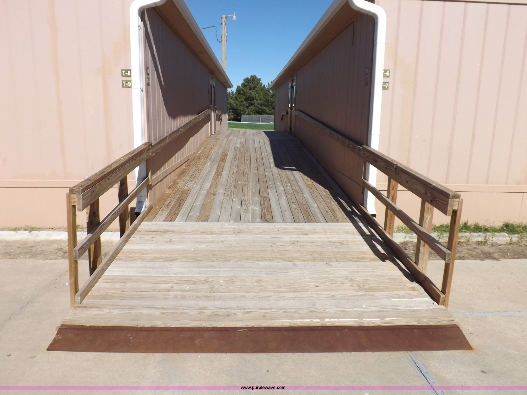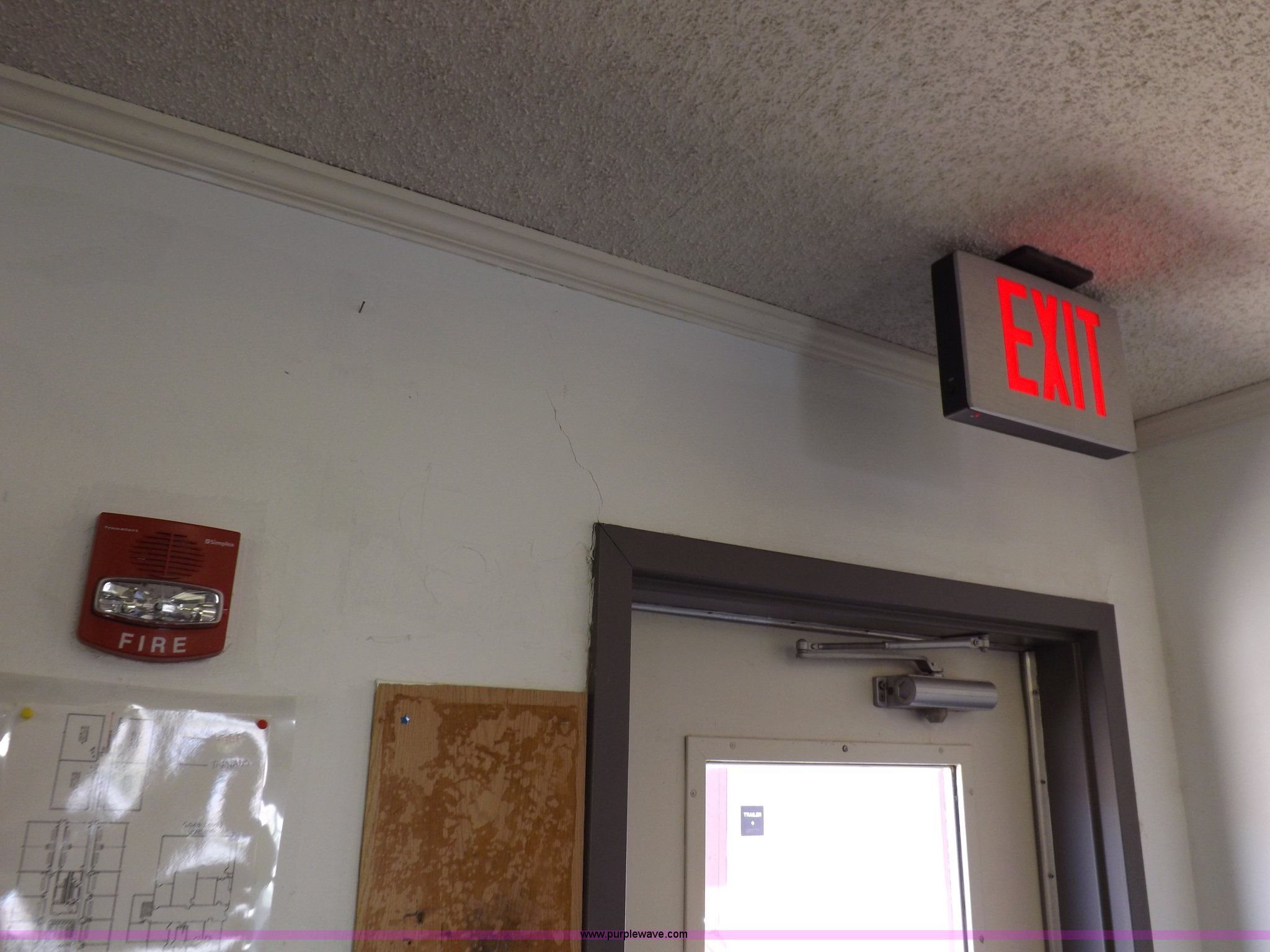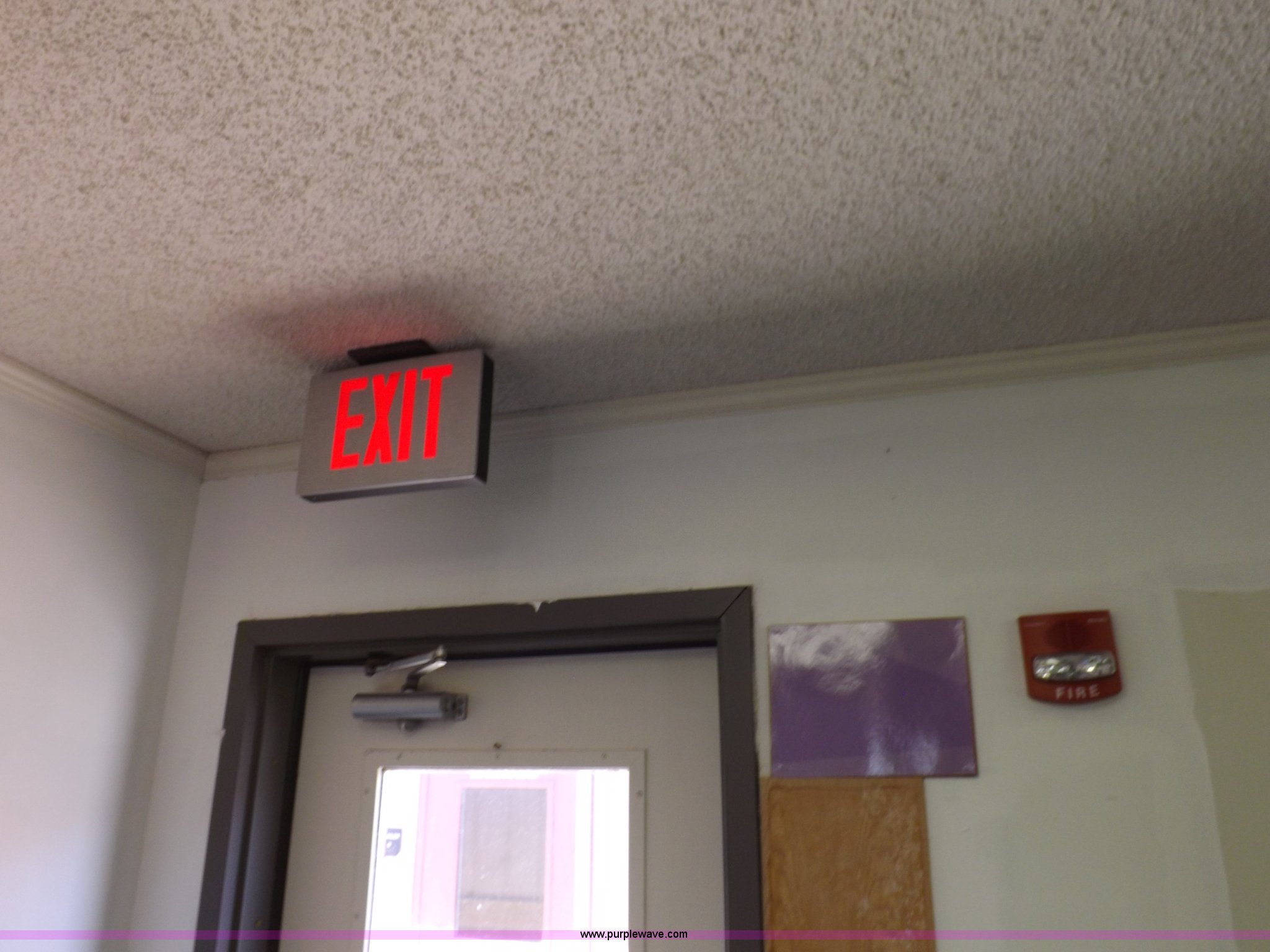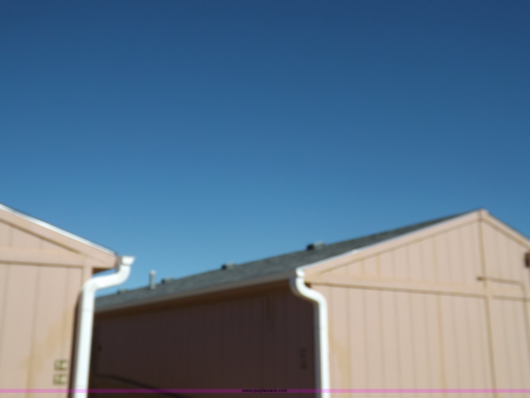 Modular building. 64'L x 24'W, 8'H ceilings, (2) rooms, (2) 36"W x 6'8" steel doors Seargant hardware and keys, (4) 34" x 58" windows, 100 amp electrical service, 4/12 pitch roof, Composition shingles, Lenox heat pump heat and air conditioning, Emergency exit lights and horn, Wired category five cable, Wired phone, Masonite siding and skirting, Guttering on both sides with end drains, Acoustic ceiling, Surface mount fluorescent lighting, Glue down carpet, Soffit and roof vents, 2" x 6" construction, Treat lumber steps, deck, and ramp, No steel frame, beams, or axles, Power and gas service will be disconnected, Building must be removed. USD 102. 314 N 1st St. Cimarron, KS 67835