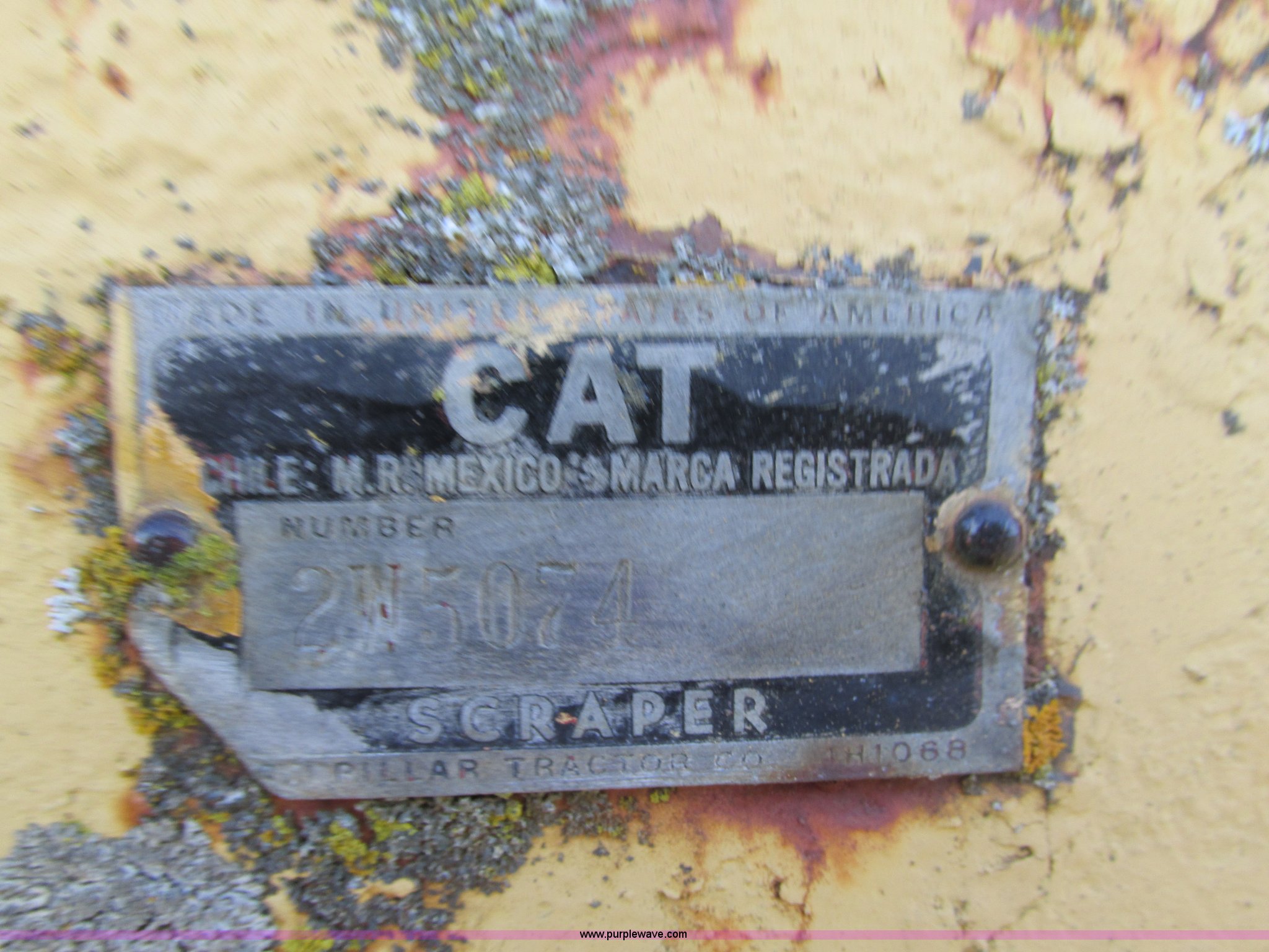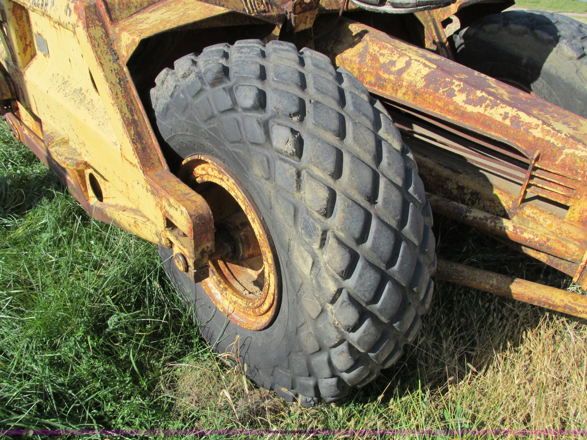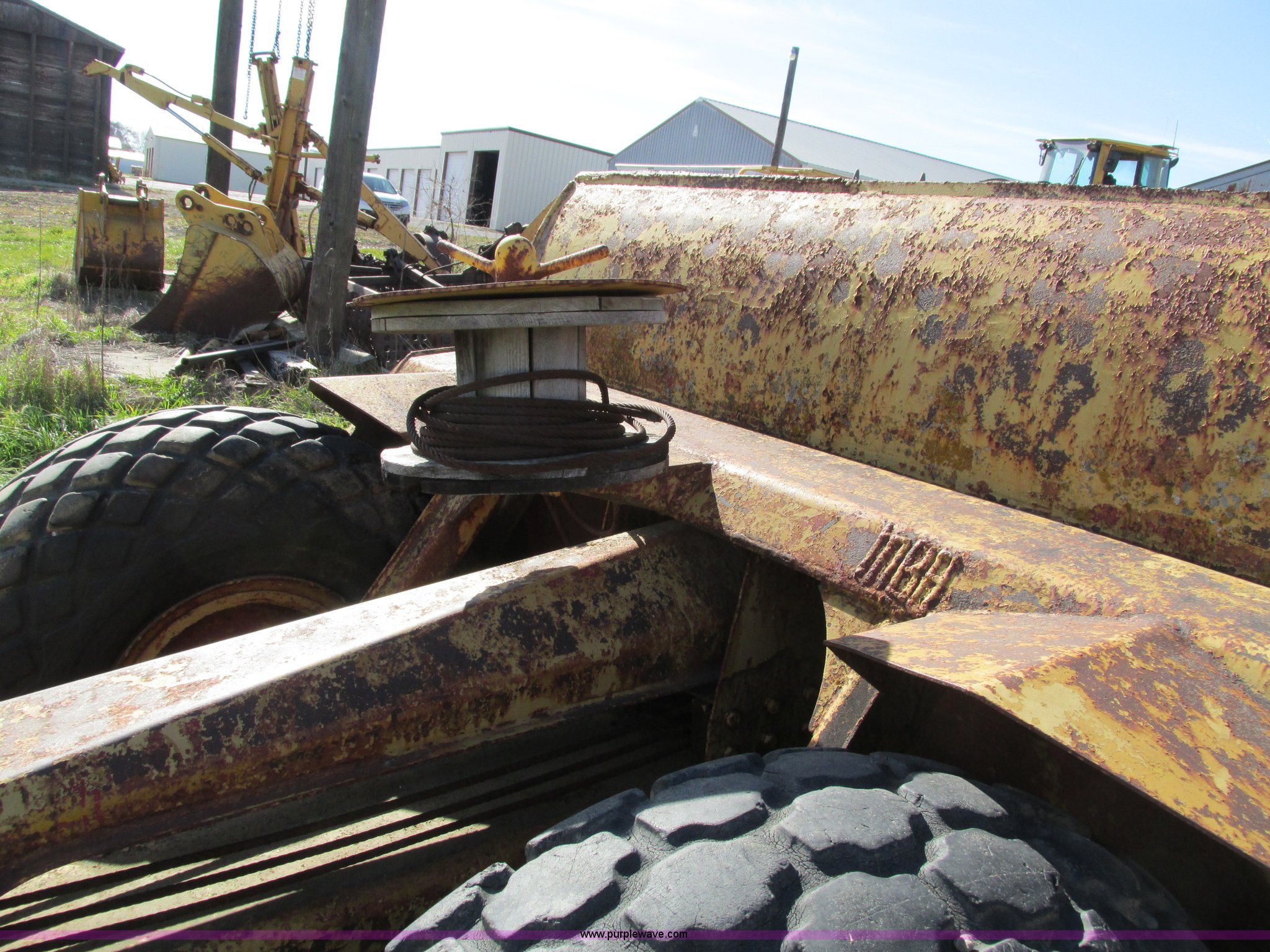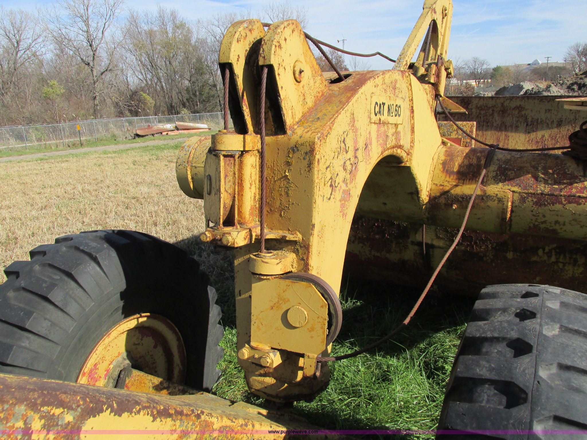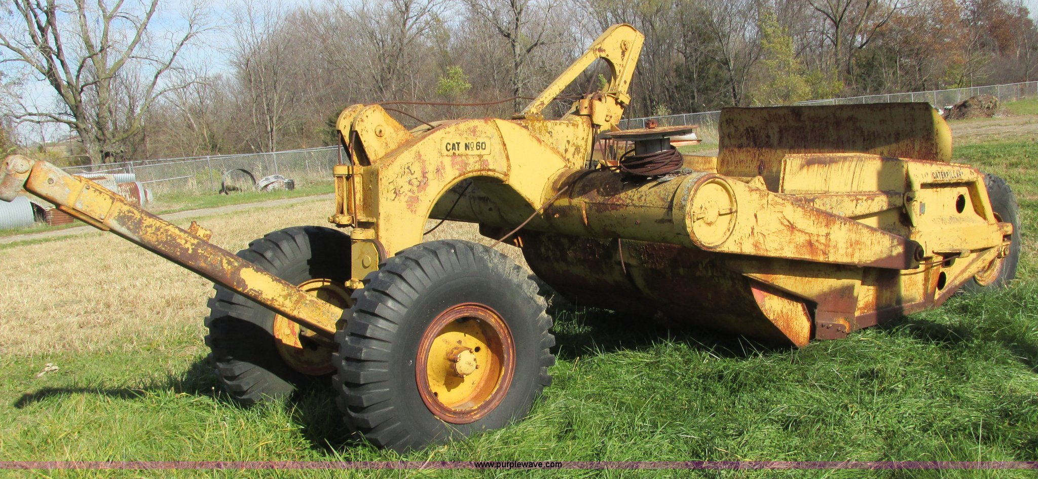 Purple Wave is selling a used Pull Type Scraper in Iowa. This item is a Caterpillar 60 pull scraper with the following: Seven cubic yard leveled capacity, Nine cubic yard heaped capacity, Cable controls, Three piece bolt-on cutting edge, 14.00-20 front tires, 16.00-20 rear tires, Parts manual included, Serial 2W5074