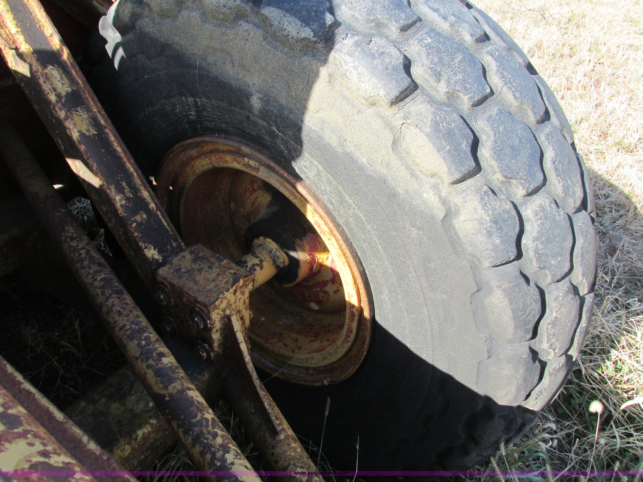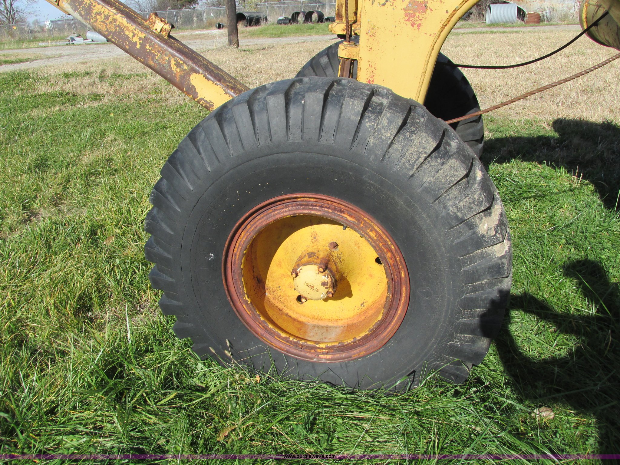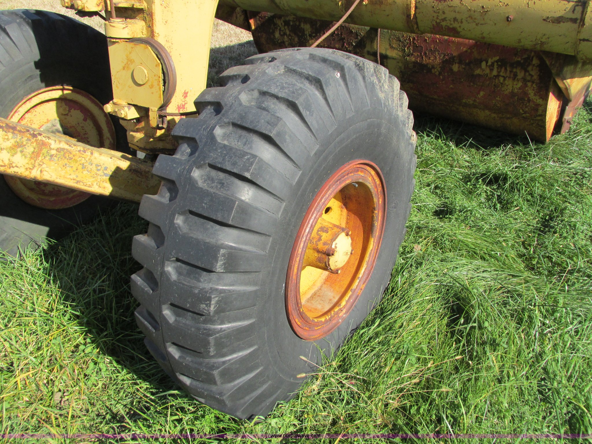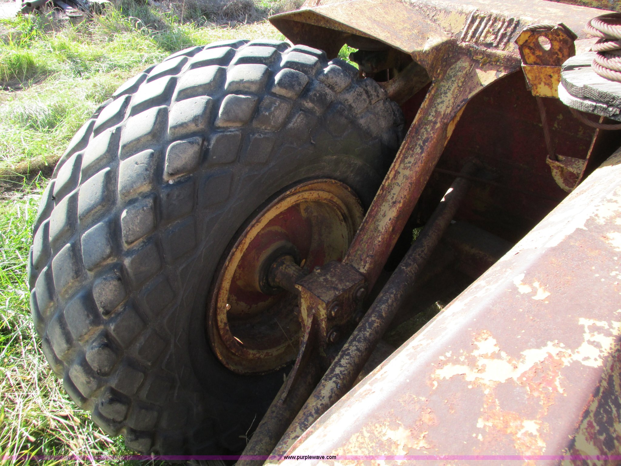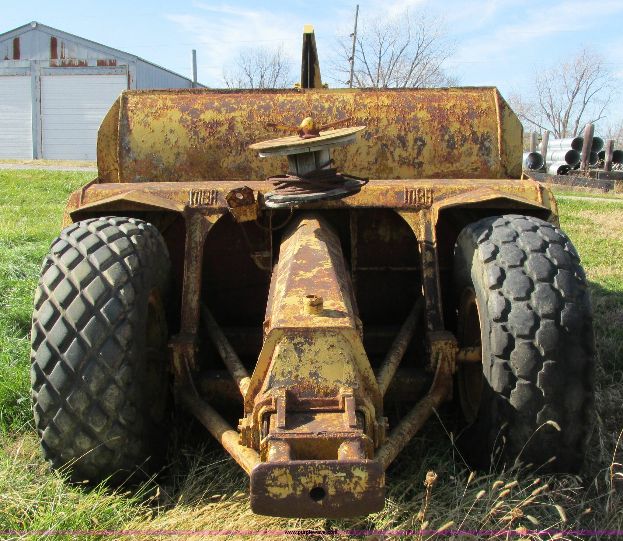 Purple Wave is selling a used Pull Type Scraper in Iowa. This item is a Caterpillar 60 pull scraper with the following: Seven cubic yard leveled capacity, Nine cubic yard heaped capacity, Cable controls, Three piece bolt-on cutting edge, 14.00-20 front tires, 16.00-20 rear tires, Parts manual included, Serial 2W5074