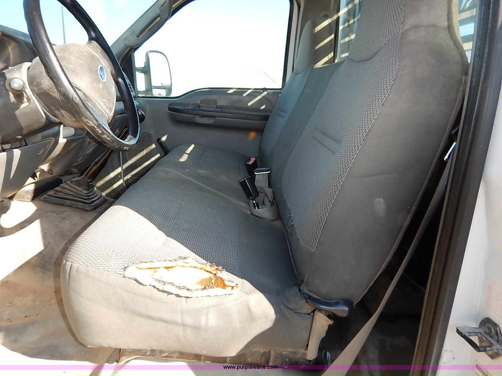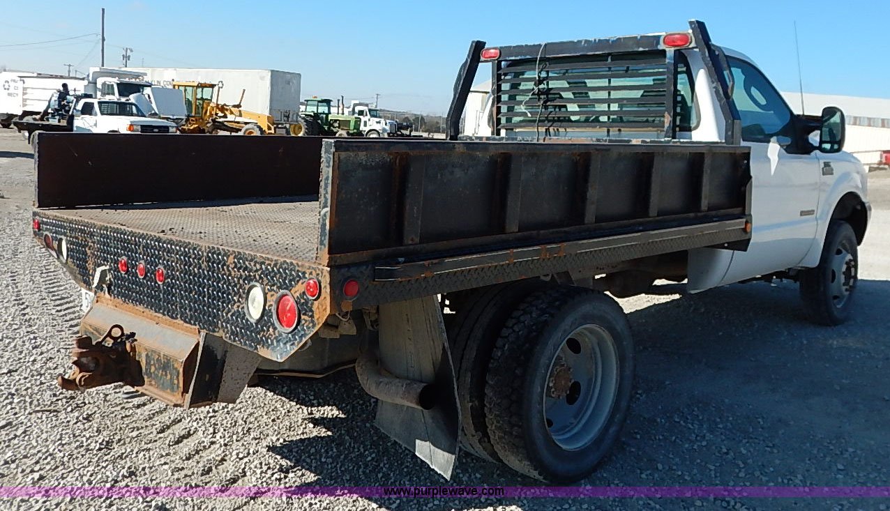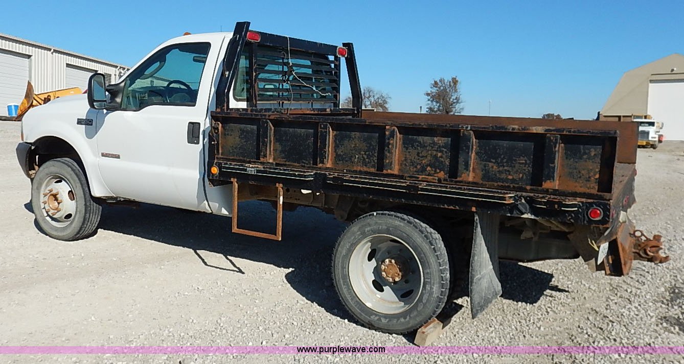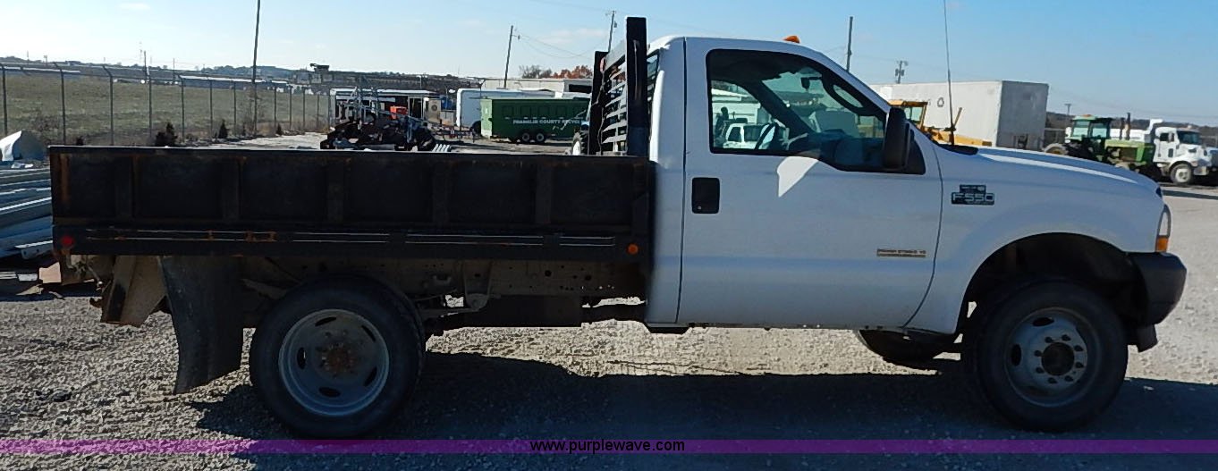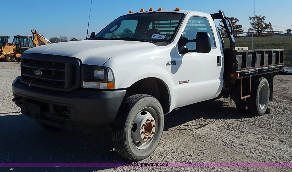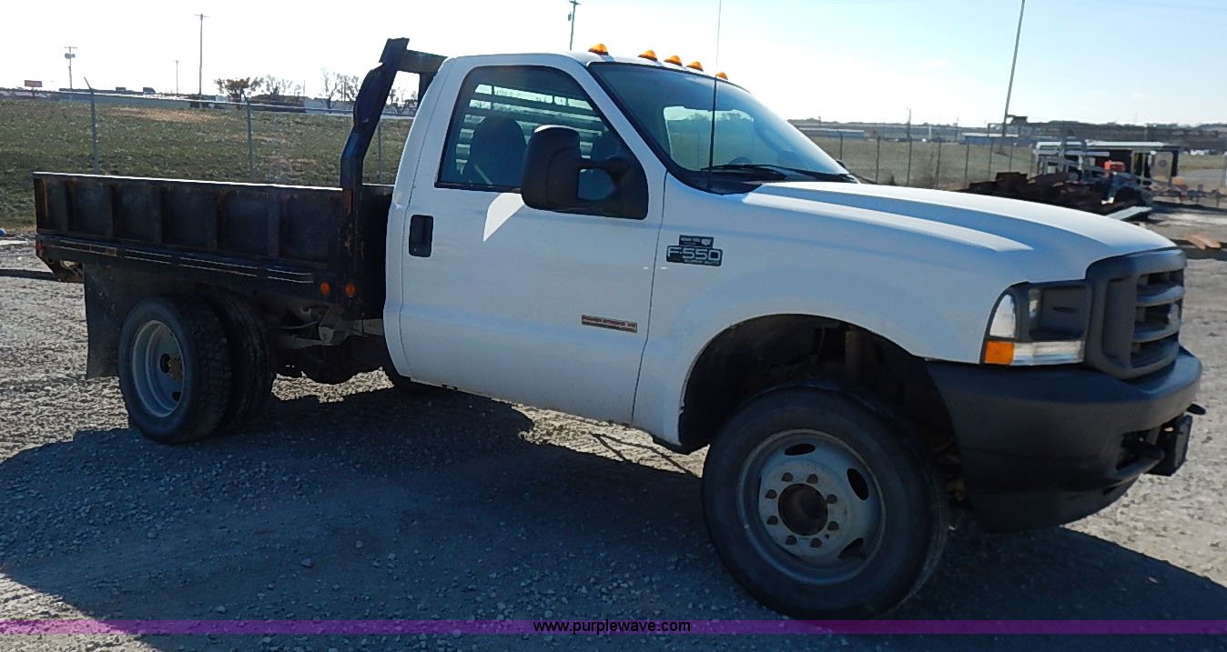 Purple Wave is selling a used Flat Bed Truck in Kansas. This item is a 2003 Ford F550 Super Duty XL flatbed truck with the following: 81,752 miles on odometer, 6.0L V8 OHV 32V turbo diesel engine, Six speed manual transmission, AC and heat, AM/FM, Manual windows and locks, Cloth interior, 9' x 94" flatbed, 15" sides, Steel construction, Turnover gooseneck ball, Tow hooks, Block heater, Pintle hitch, Trailer wiring, 225/70R19.5 tires, Interior/exterior cosmetic damage, AC needs charged once a month, Check engine light is on, Clutch bearing needs replaced