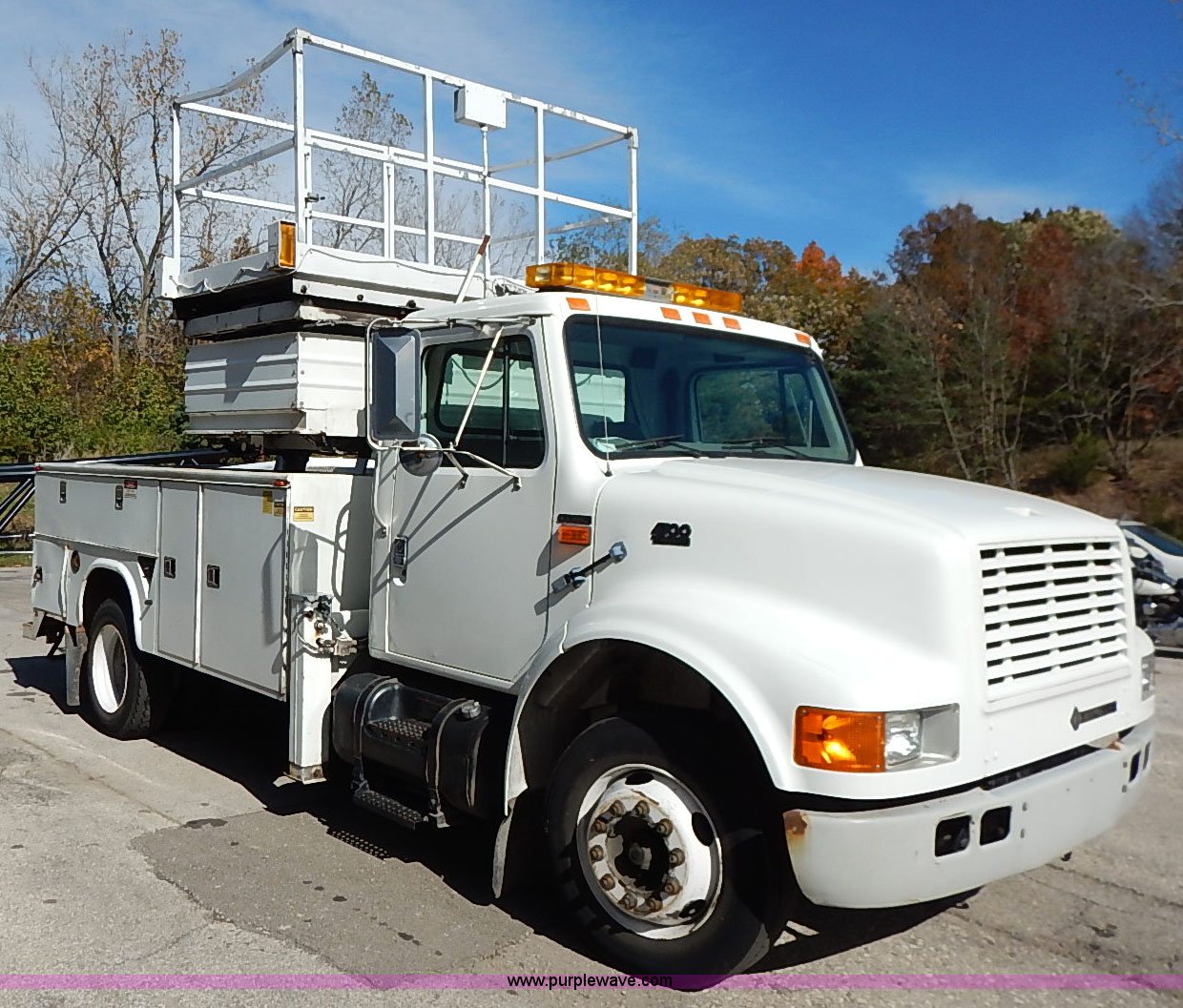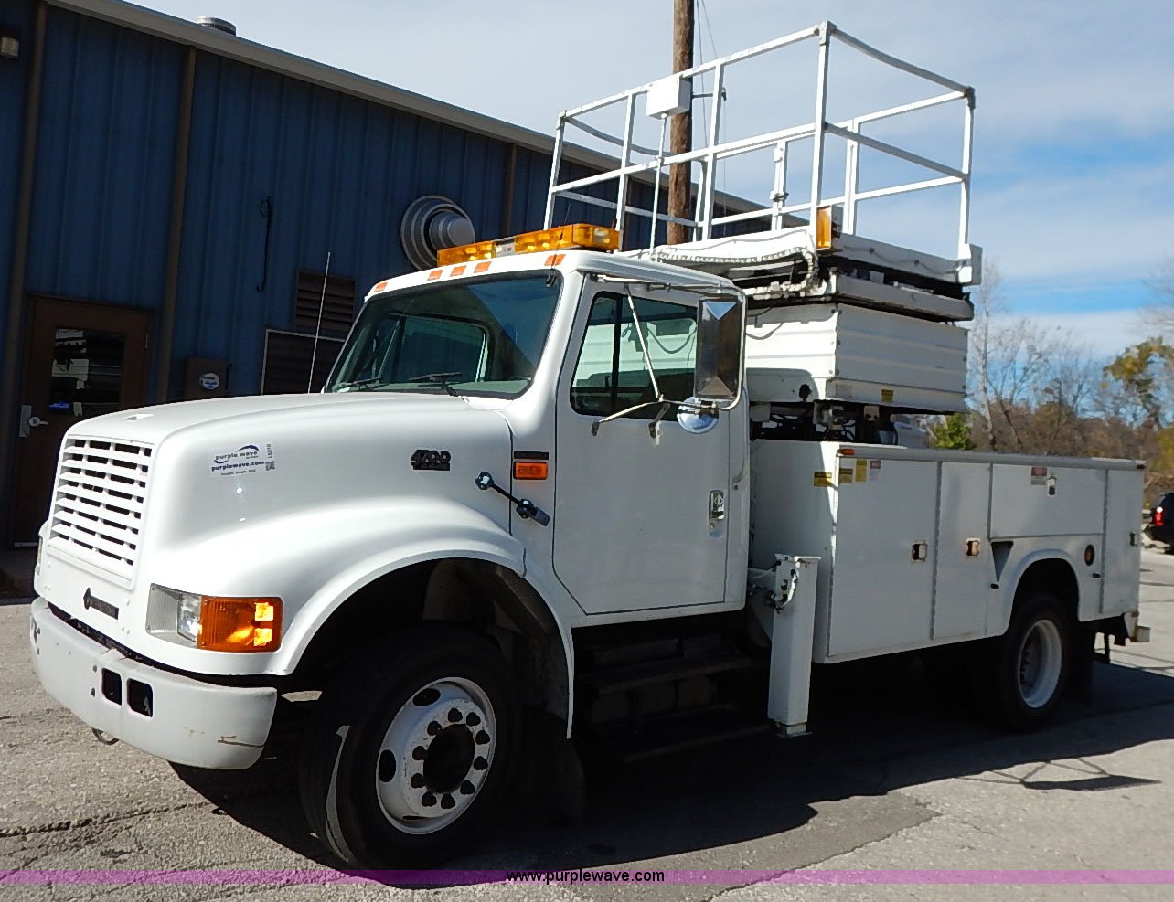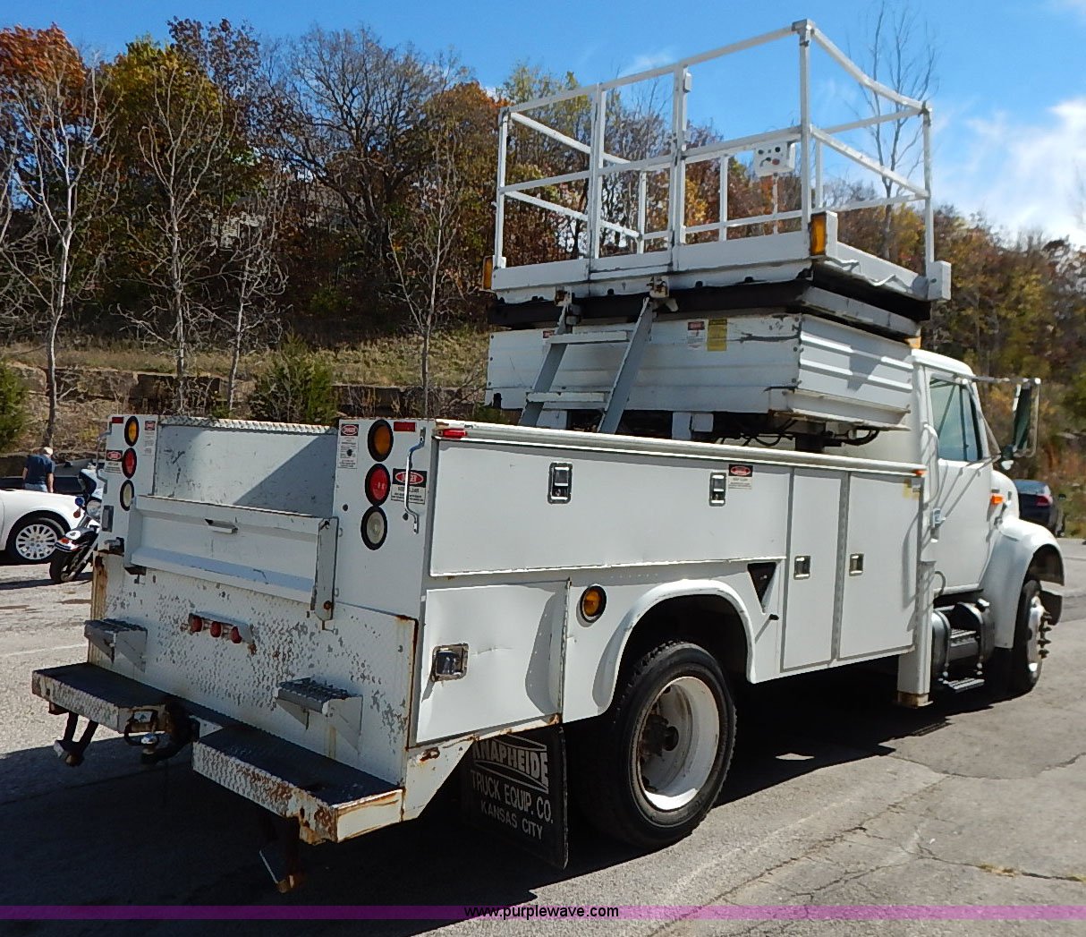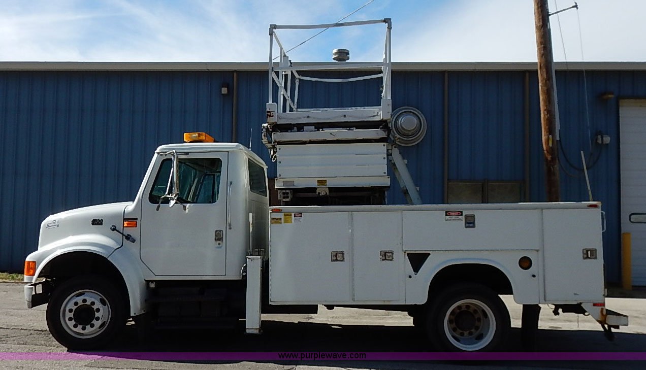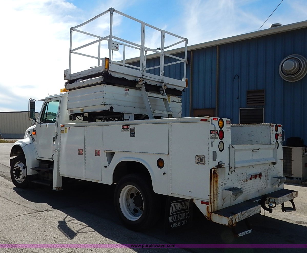 Purple Wave is selling a used Service Truck in Kansas. This item is a 2000 International 4700 scissor lift truck with the following: 93,307 miles on odometer, 7,286 hours on meter, International T444 7.3L diesel engine, 175 HP, Automatic transmission, AC and heat, Cruise, AM/FM, Air suspension seat, Vinyl interior, PTO, Knapheide utility bed, 11'L, Outriggers, Tesco Hi-lift scissor lift, 88"W x 52"D, 550 lbs maximum lift capacity, 28' maximum lift height, Serial 99-11-7177-K-01, 245/70R19.5 tires, ABS light is on, Seat torn