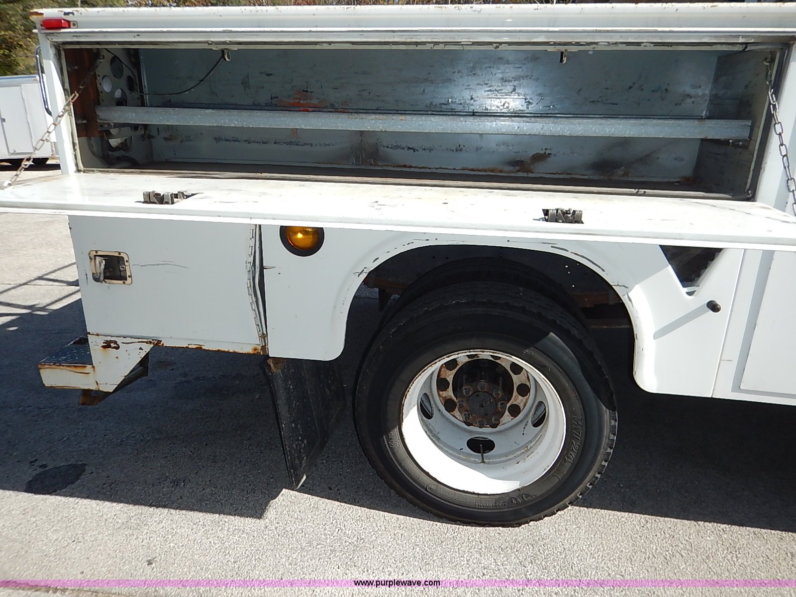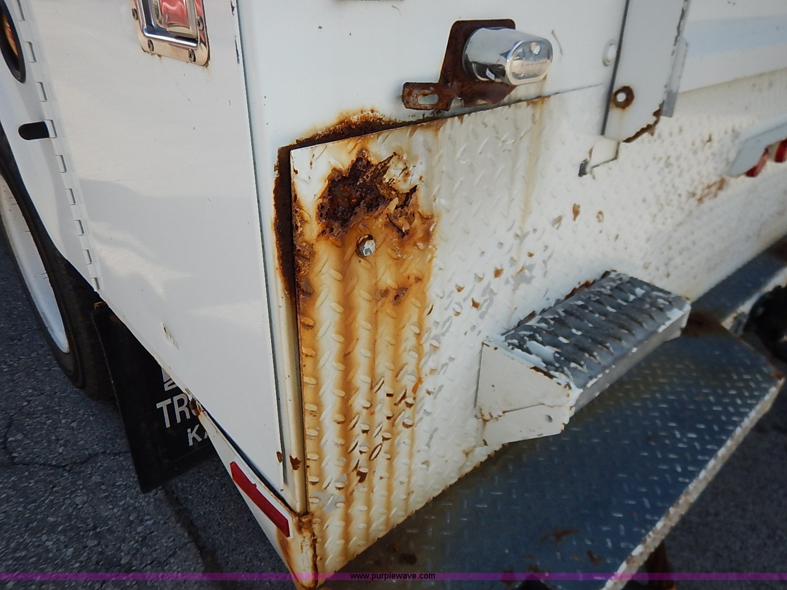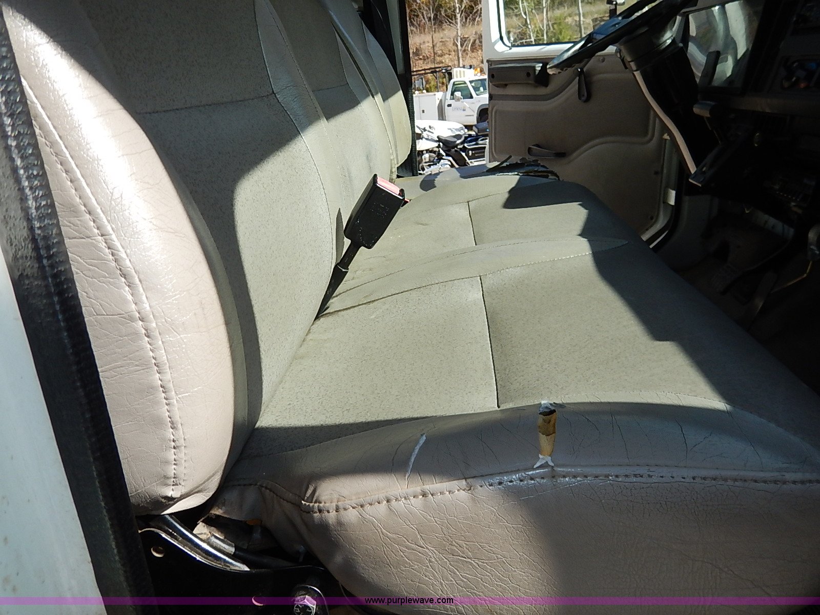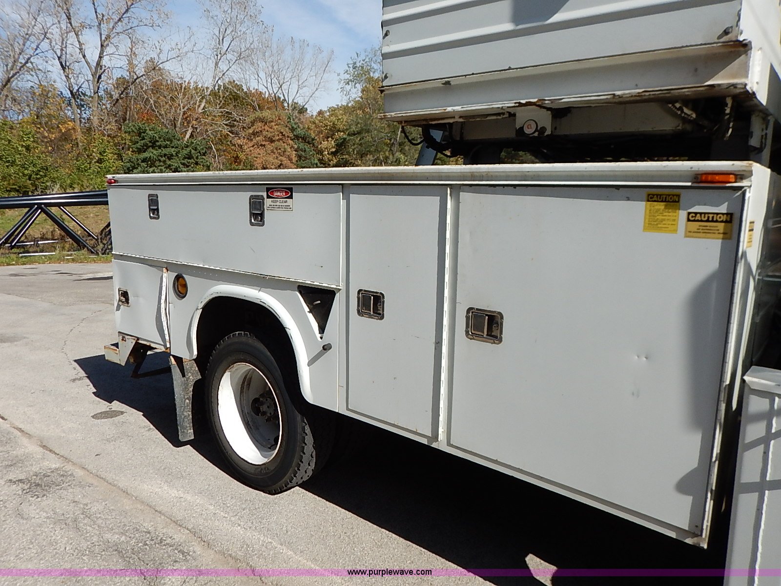 Purple Wave is selling a used Service Truck in Kansas. This item is a 2000 International 4700 scissor lift truck with the following: 93,307 miles on odometer, 7,286 hours on meter, International T444 7.3L diesel engine, 175 HP, Automatic transmission, AC and heat, Cruise, AM/FM, Air suspension seat, Vinyl interior, PTO, Knapheide utility bed, 11'L, Outriggers, Tesco Hi-lift scissor lift, 88"W x 52"D, 550 lbs maximum lift capacity, 28' maximum lift height, Serial 99-11-7177-K-01, 245/70R19.5 tires, ABS light is on, Seat torn