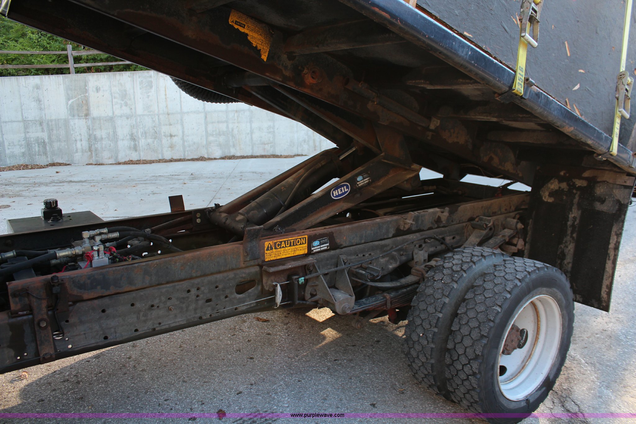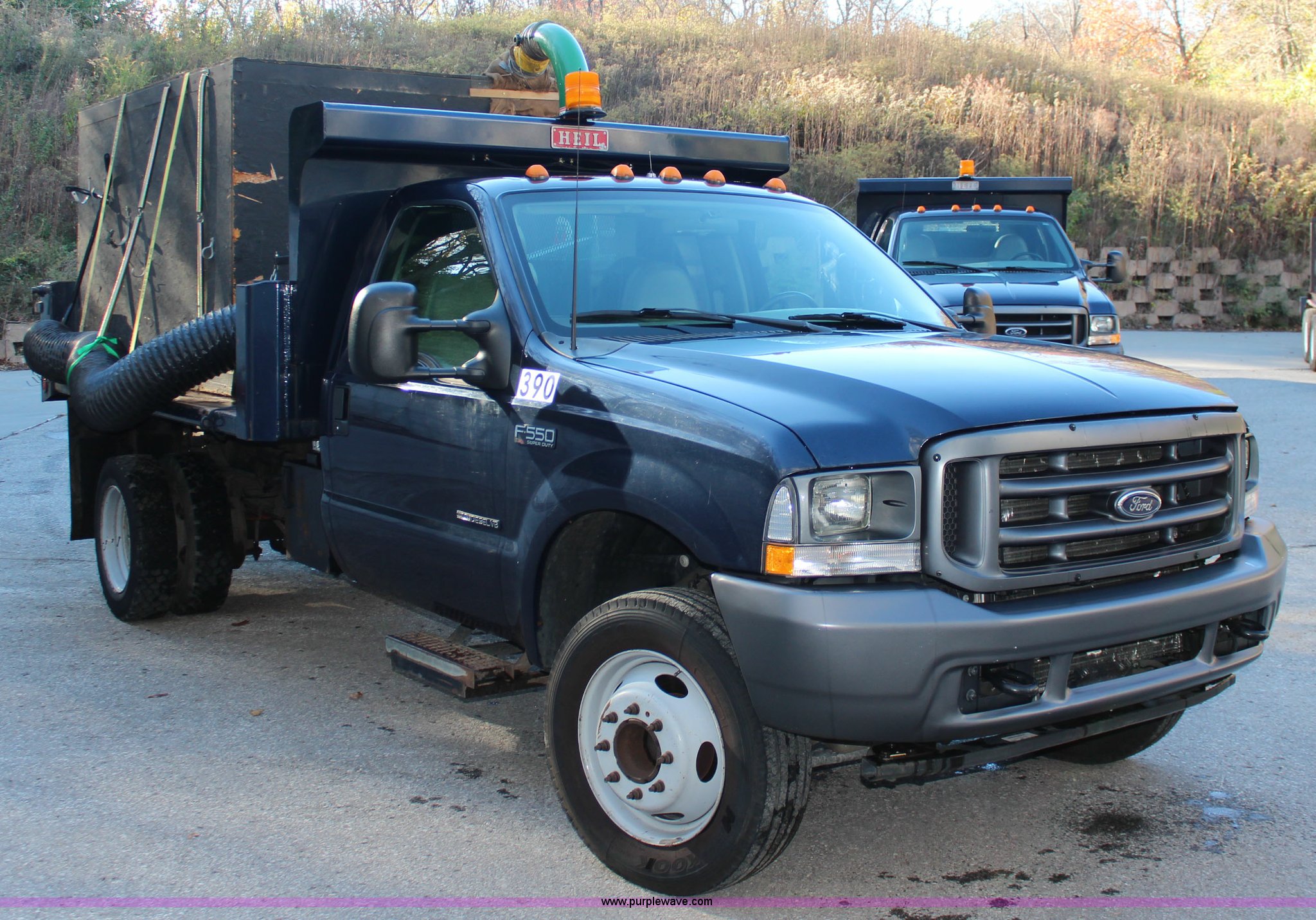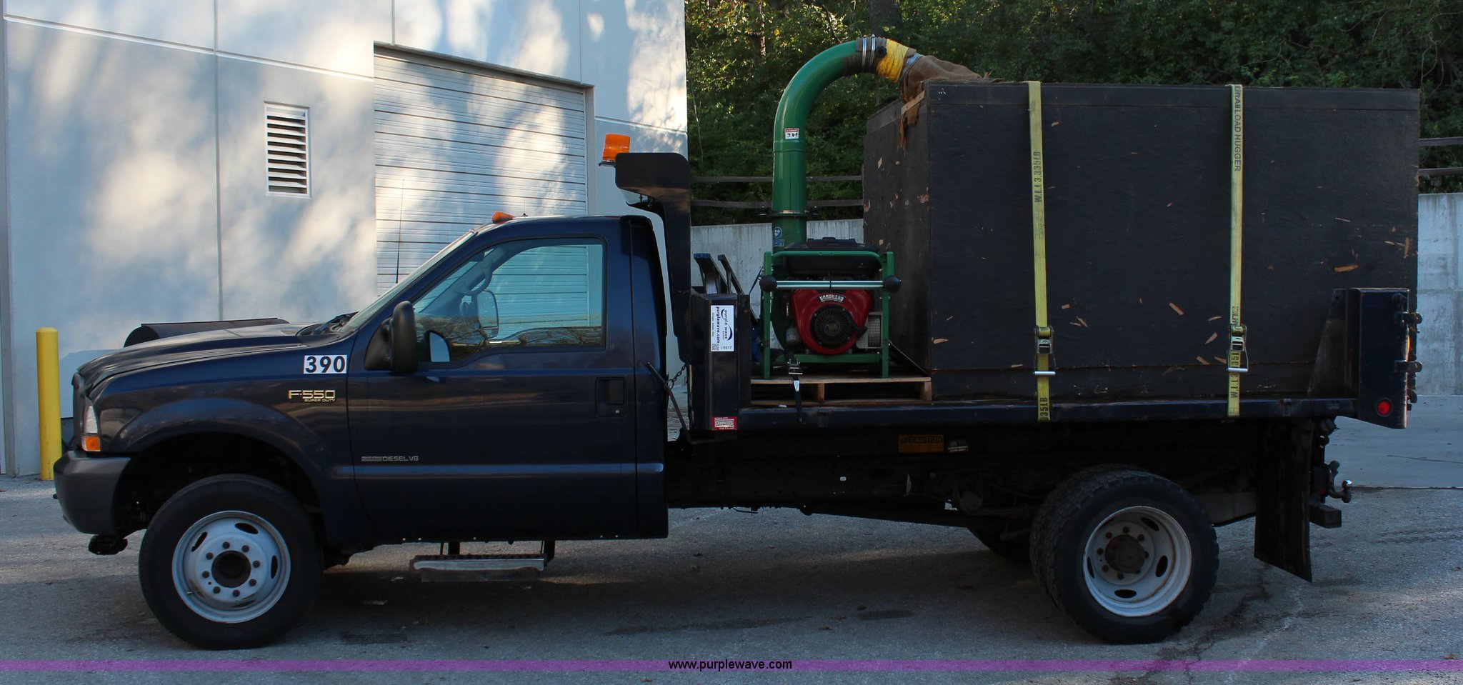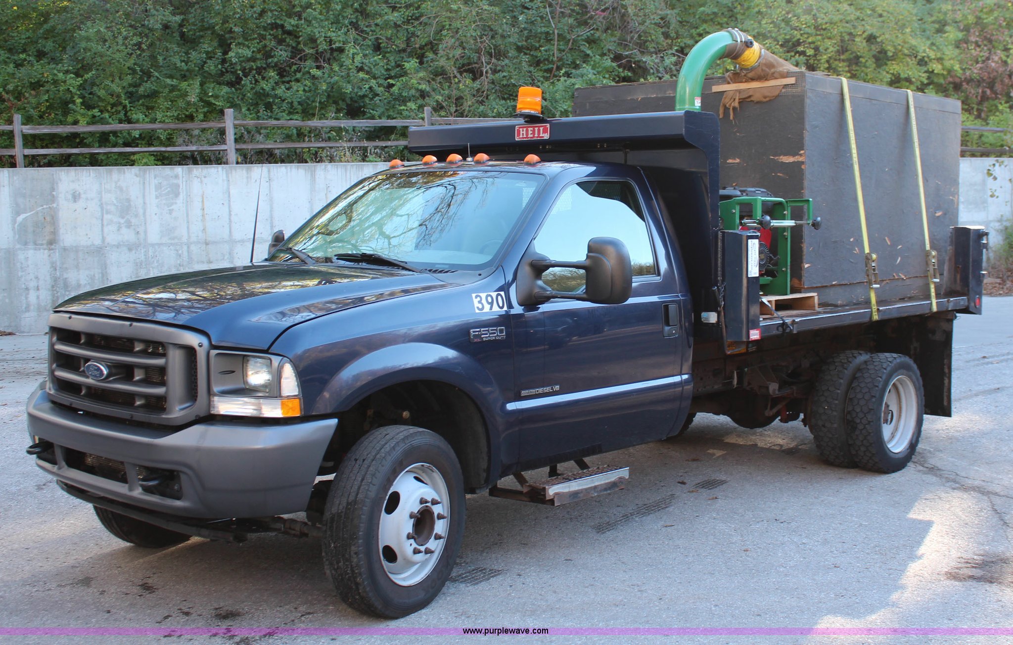 Purple Wave is selling a used Flat Bed Truck in Kansas. This item is a 2002 Ford F550 flatbed dump truck with the following: 74,821 miles on odometer, 7.3L V8 OHV 16V turbo diesel engine, Automatic transmission, AC and heat, AM/FM, Manual windows and locks, Vinyl interior, 11'L x 8'W dump flatbed, Engine driven hydraulics pump with electric clutch, Power up and down on dump, Strobe lights, Light bars, Receiver hitch, 225/70R19.5 tires, Leaf vacuum not included, Service records available