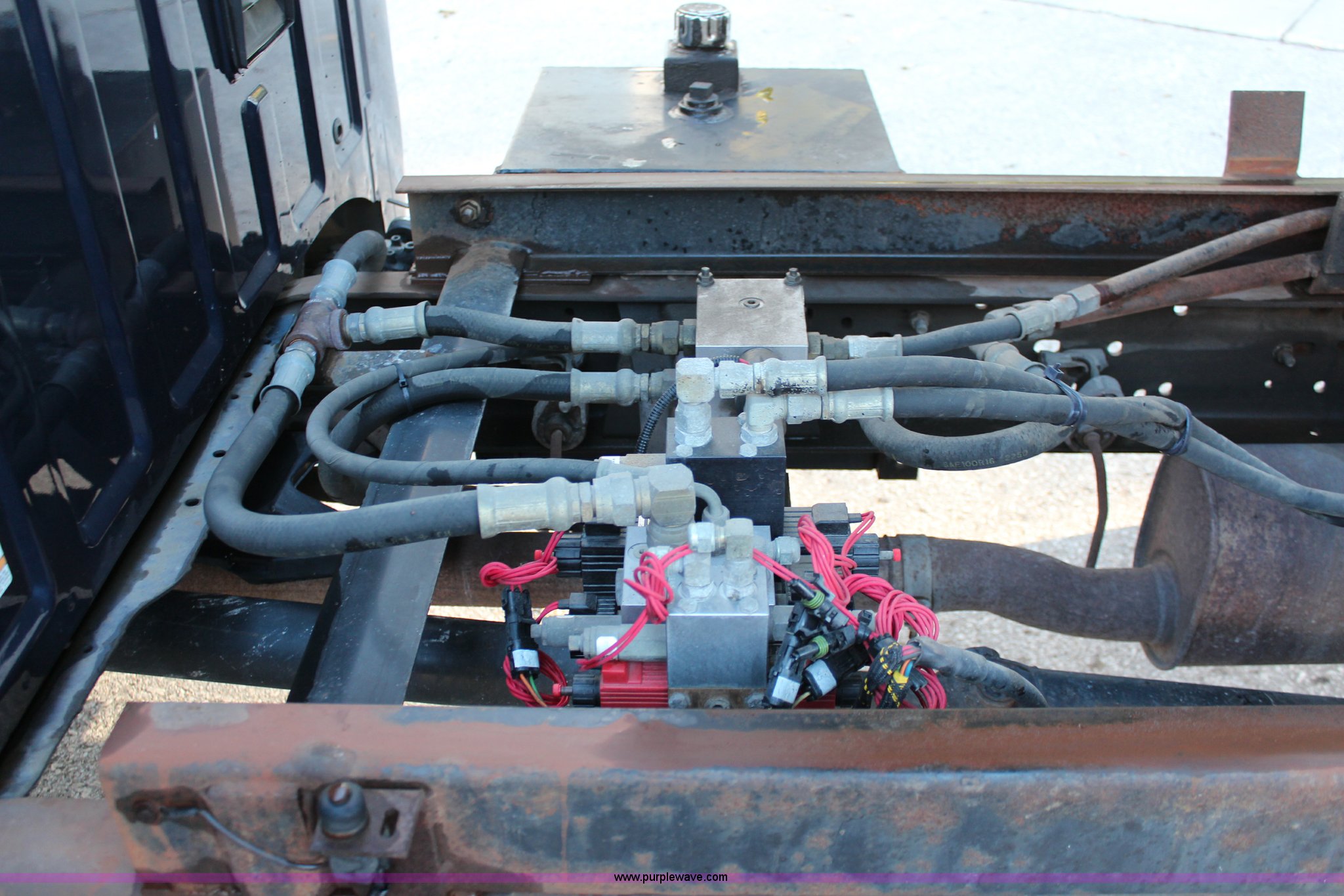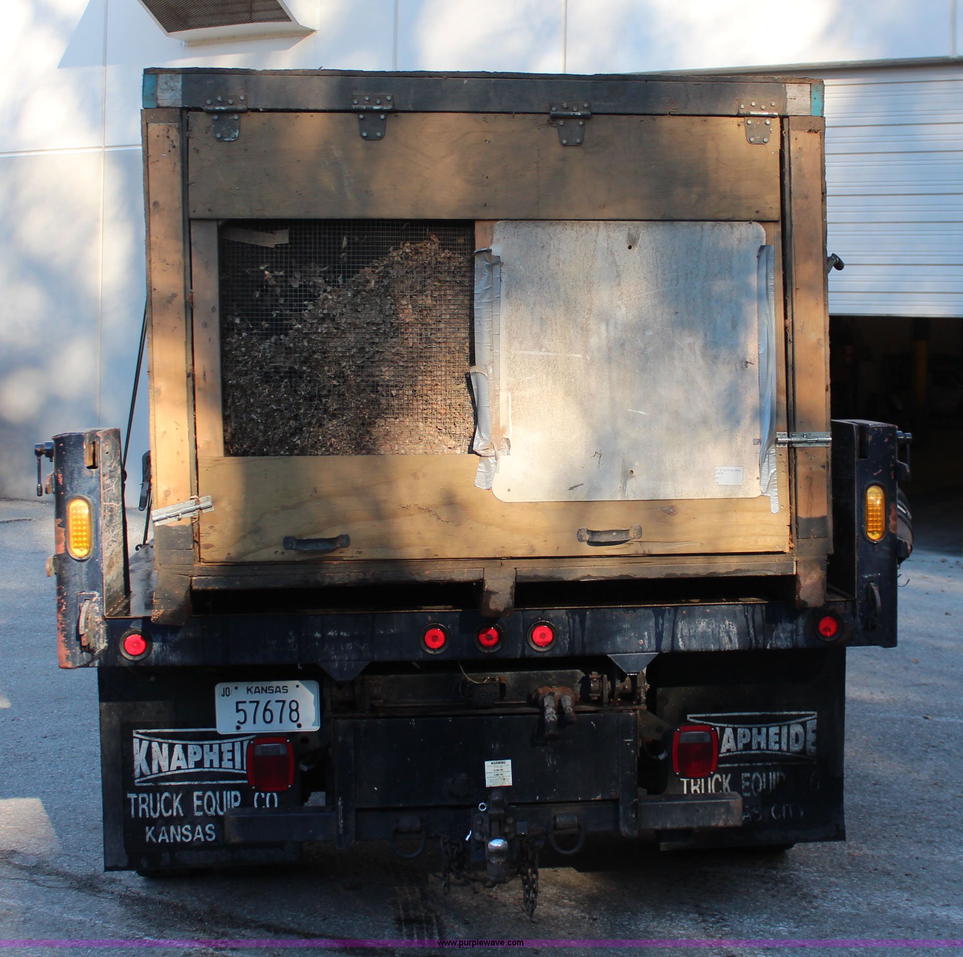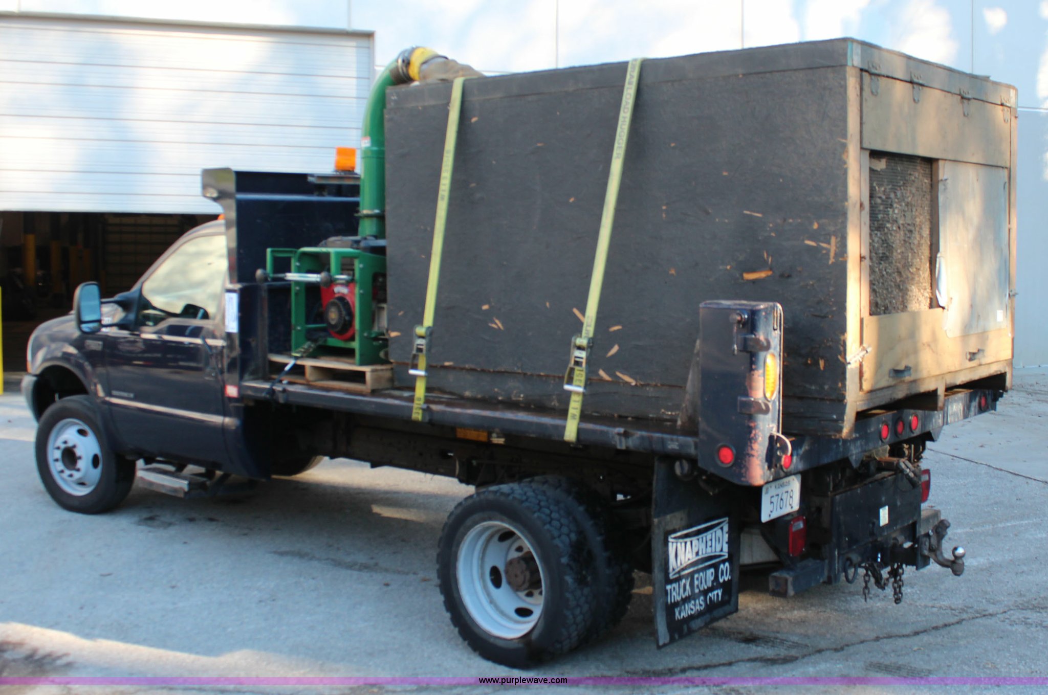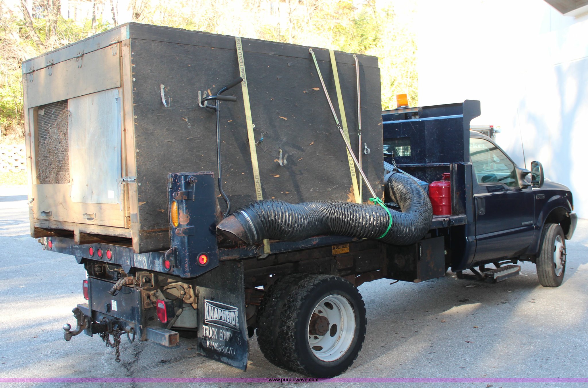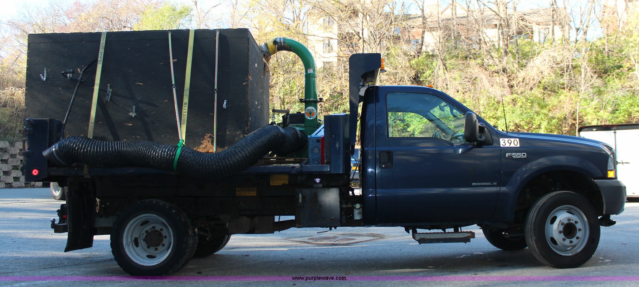 Purple Wave is selling a used Flat Bed Truck in Kansas. This item is a 2002 Ford F550 flatbed dump truck with the following: 74,821 miles on odometer, 7.3L V8 OHV 16V turbo diesel engine, Automatic transmission, AC and heat, AM/FM, Manual windows and locks, Vinyl interior, 11'L x 8'W dump flatbed, Engine driven hydraulics pump with electric clutch, Power up and down on dump, Strobe lights, Light bars, Receiver hitch, 225/70R19.5 tires, Leaf vacuum not included, Service records available