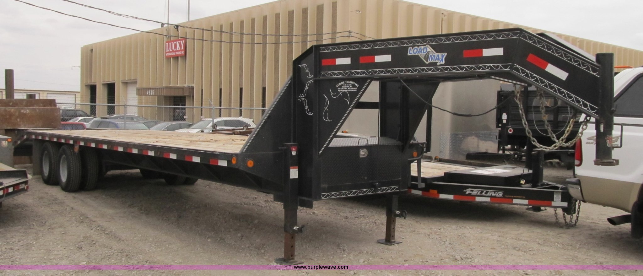 Purple Wave is selling a used Equip. Trailer in Missouri. This item is a 2008 Load Max flatbed trailer with the following: 26'L deck, 6'L dove tail, 5'L folding ramps, 32' overall length, Stake side pockets, Rub rails, Driver's side storage box, Neck storage, Dual leg landing gear, Safety break-away system, Electric brakes, Recently replaced 235/80R16 tires, 10 ply, GAWR 10,000 lbs per axle