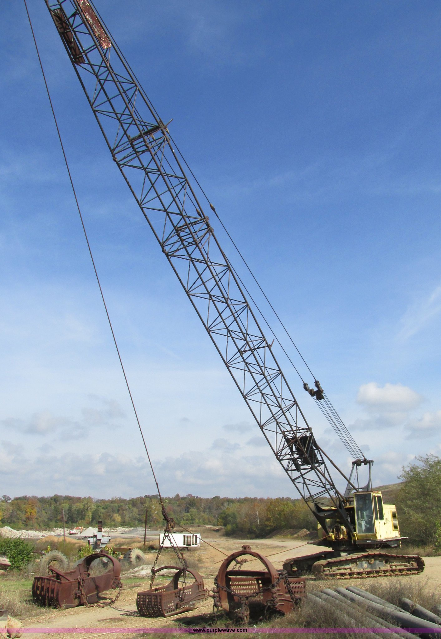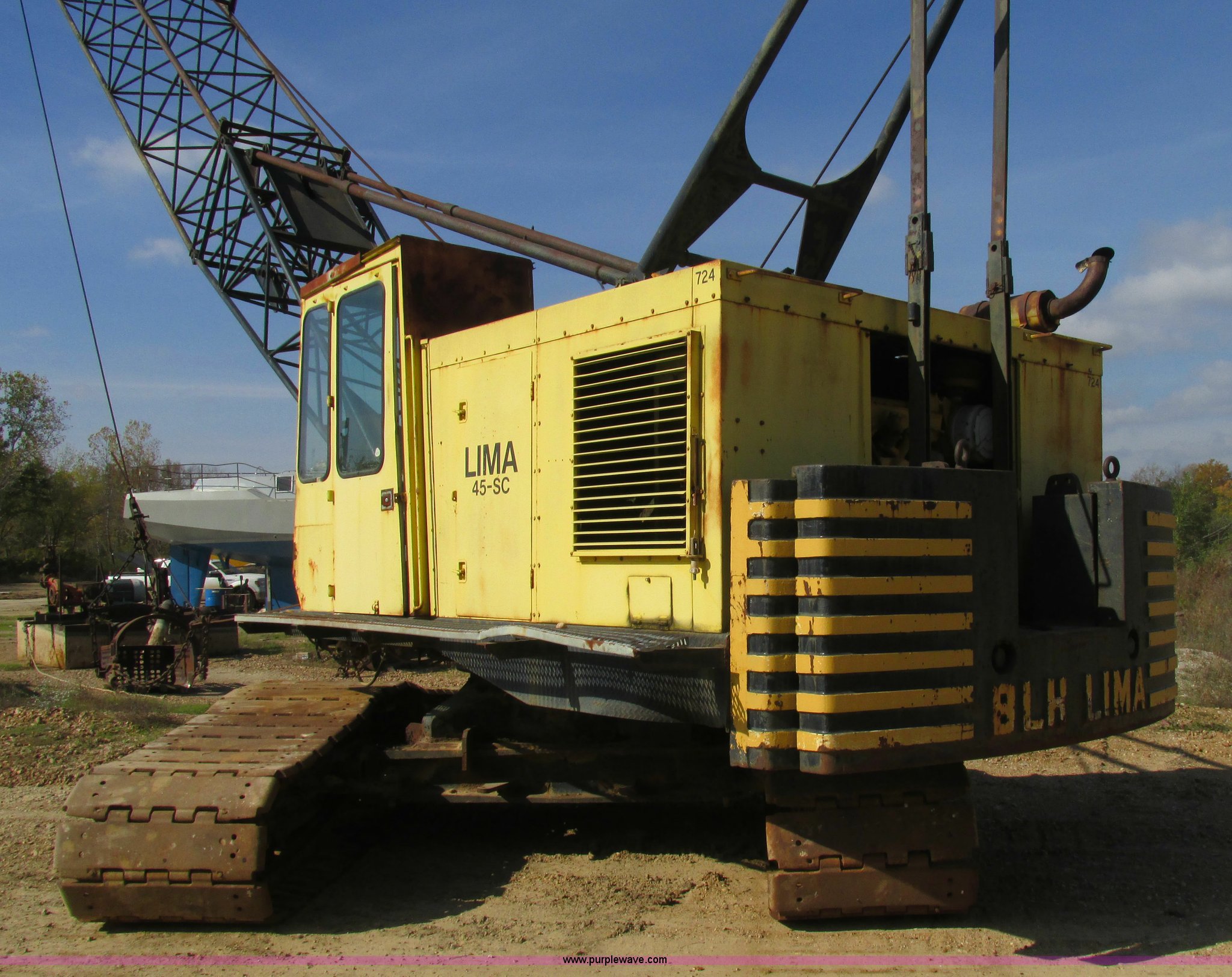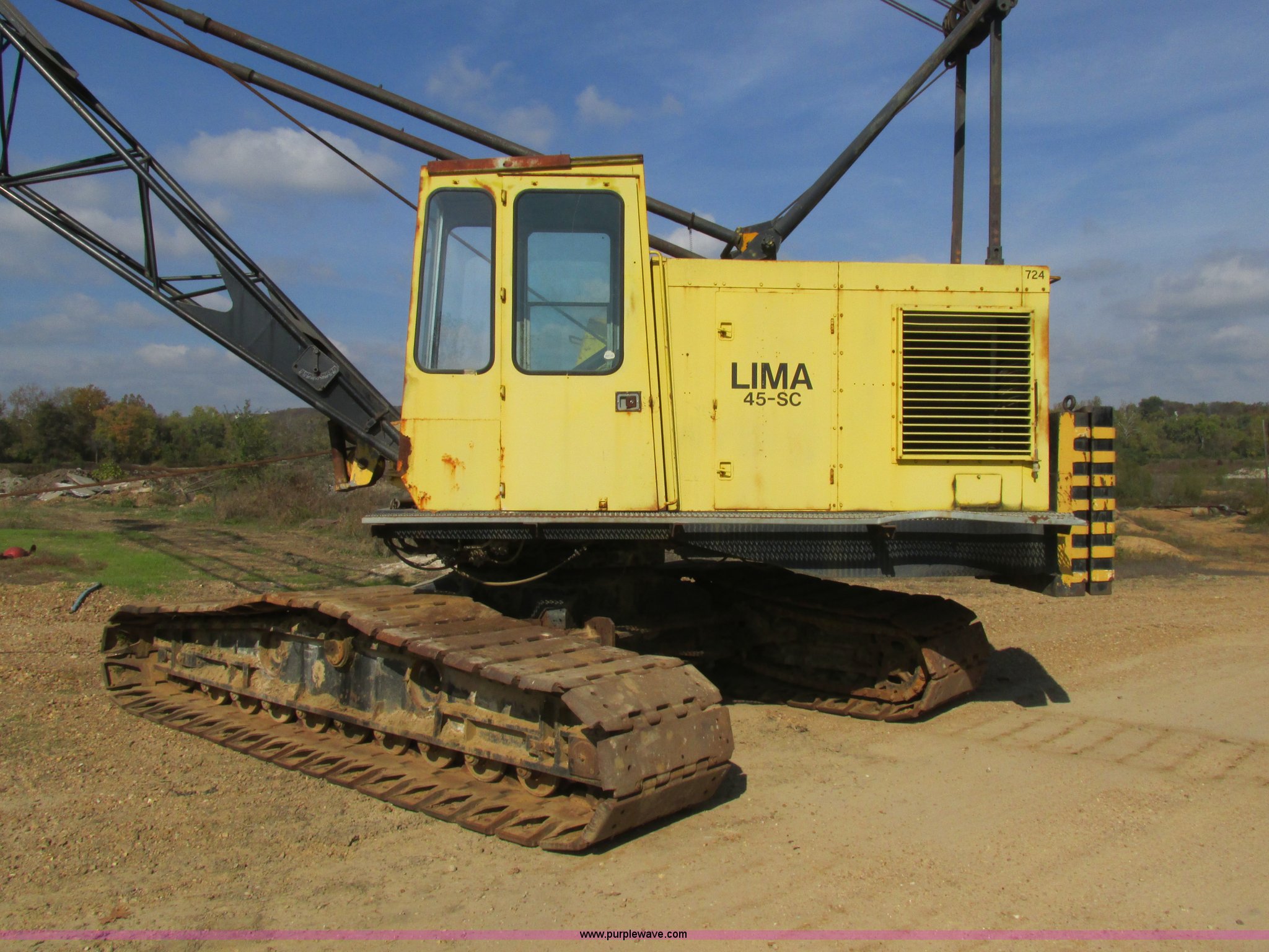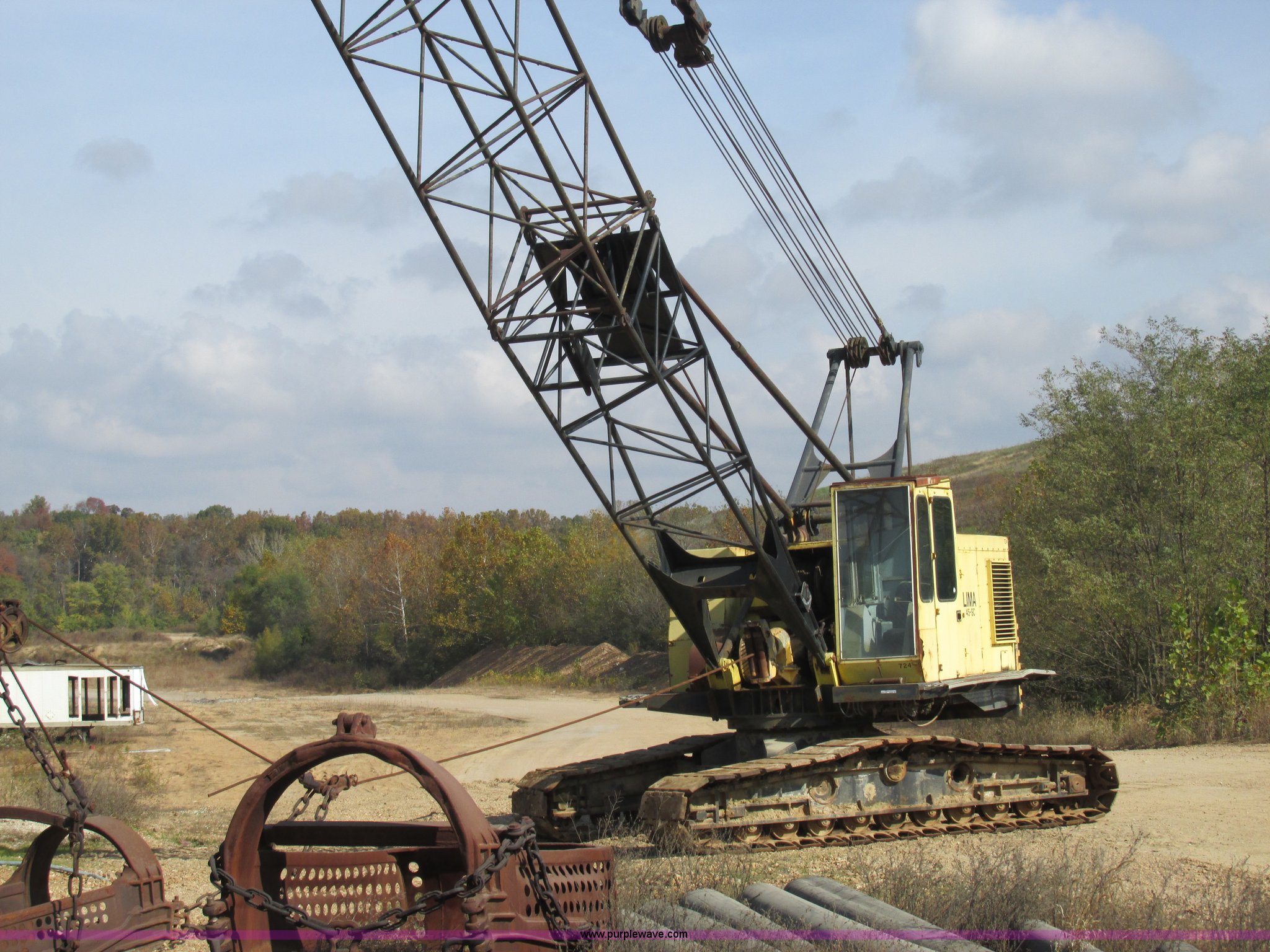 Purple Wave is selling a used Crawler Crane in Missouri. This item is a Lima 45-SC crane with the following: Caterpillar 333 six cylinder diesel engine, 45 ton capacity, 80' tube boom, Double drum winch, Page Automatic rock drag line bucket, 1.5 cubic yard capacity, Pulleys and chains, (4) shanks, (3) teeth, 91"L x 63"W x 32"H side wall, 56" from rear to cutting edge, Serial 63593, Hendrix sand and gravel drag line bucket, Two cubic yard capacity, Chains and pulley, Four teeth/shanks, 7'L x 56"W x 32"D, Serial 6360, Hendrix 3/4T/S drag line bucket, 3/4 cubic yard capacity, 5'L x 40"W x 24"D, 50 ton four line lifting block, 200 lbs cast hook block, Swing brake and lock, Battery cut off switch, Detachable counter weight, Nine bottom rollers, Two top carriers, 37"W smooth track pads, Tracks will manually collapse for transport width reduction, Hydraulic cylinder included for collapse, Interior/exterior cosmetic damage, Clutch air cylinder needs rebuilt, Serial 3543-17