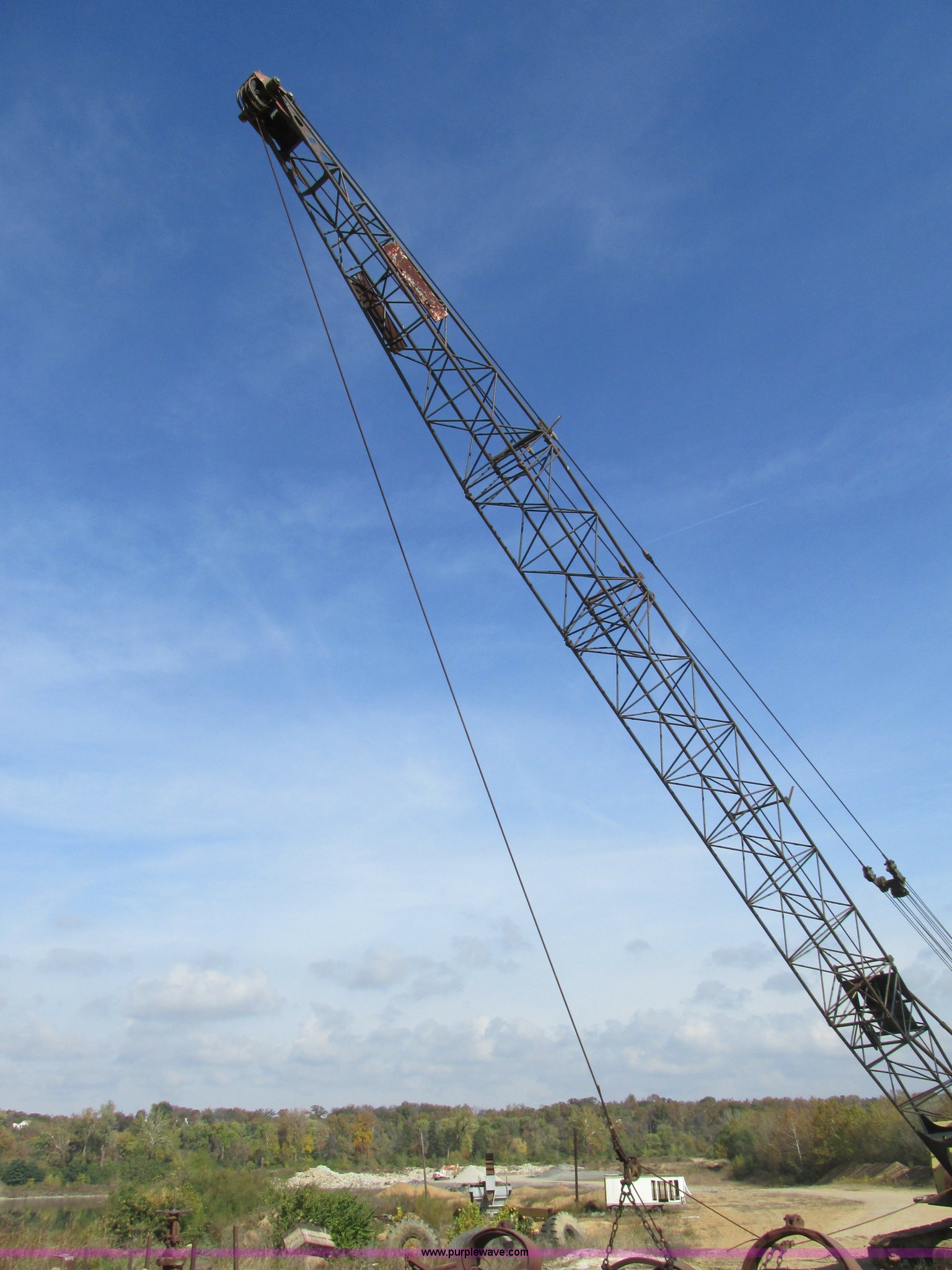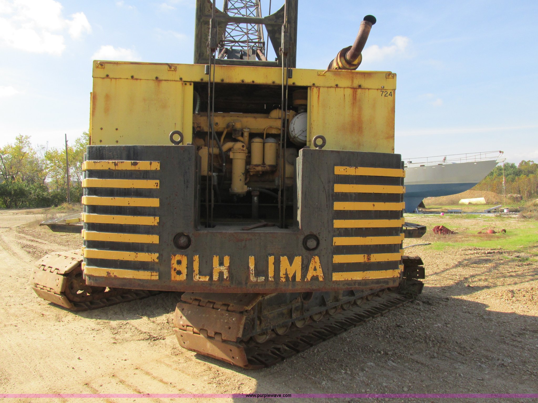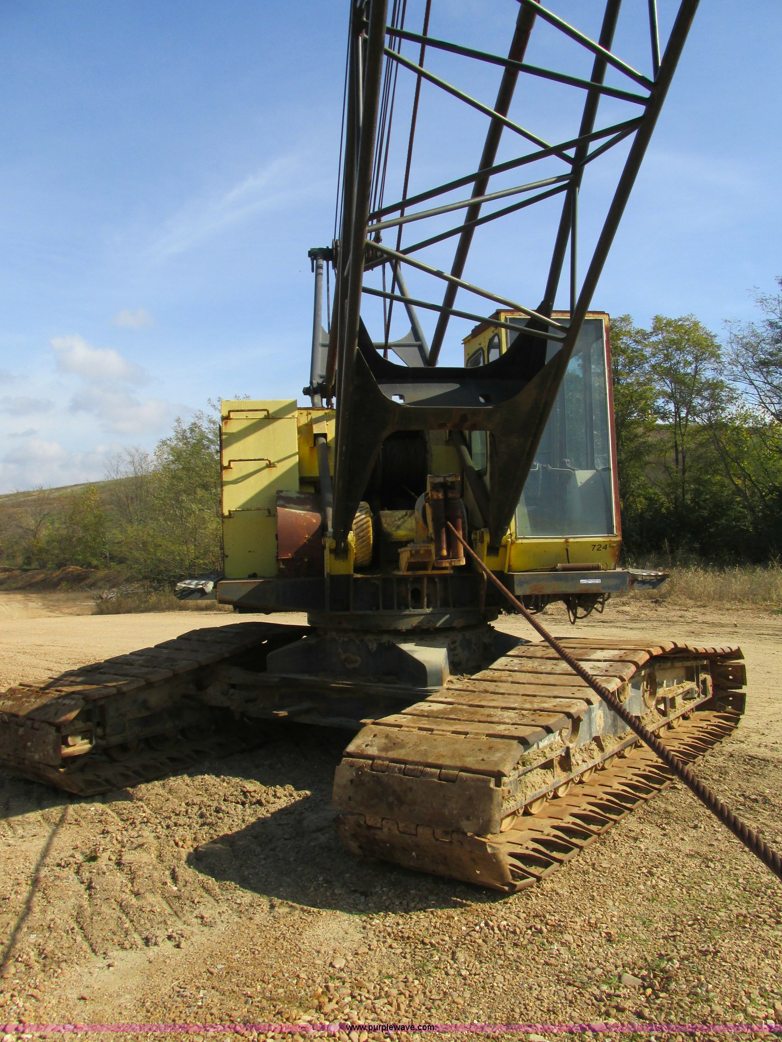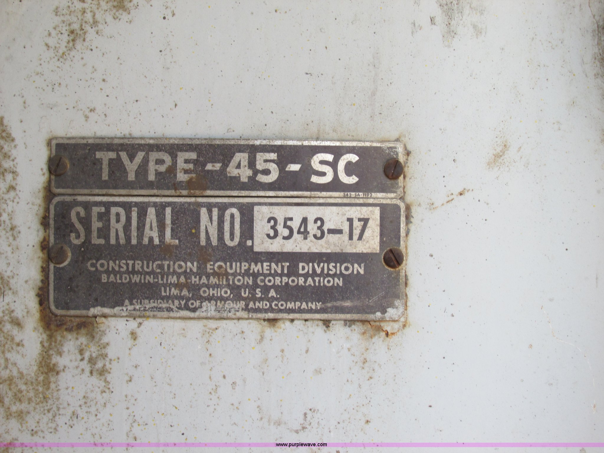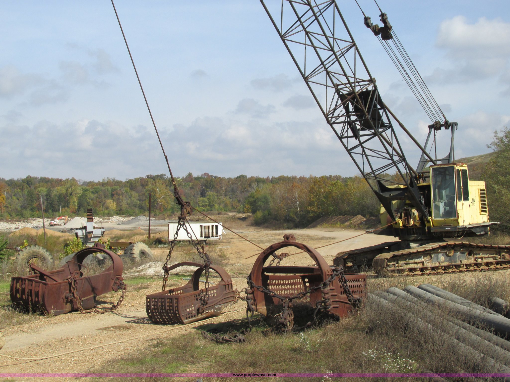 Purple Wave is selling a used Crawler Crane in Missouri. This item is a Lima 45-SC crane with the following: Caterpillar 333 six cylinder diesel engine, 45 ton capacity, 80' tube boom, Double drum winch, Page Automatic rock drag line bucket, 1.5 cubic yard capacity, Pulleys and chains, (4) shanks, (3) teeth, 91"L x 63"W x 32"H side wall, 56" from rear to cutting edge, Serial 63593, Hendrix sand and gravel drag line bucket, Two cubic yard capacity, Chains and pulley, Four teeth/shanks, 7'L x 56"W x 32"D, Serial 6360, Hendrix 3/4T/S drag line bucket, 3/4 cubic yard capacity, 5'L x 40"W x 24"D, 50 ton four line lifting block, 200 lbs cast hook block, Swing brake and lock, Battery cut off switch, Detachable counter weight, Nine bottom rollers, Two top carriers, 37"W smooth track pads, Tracks will manually collapse for transport width reduction, Hydraulic cylinder included for collapse, Interior/exterior cosmetic damage, Clutch air cylinder needs rebuilt, Serial 3543-17