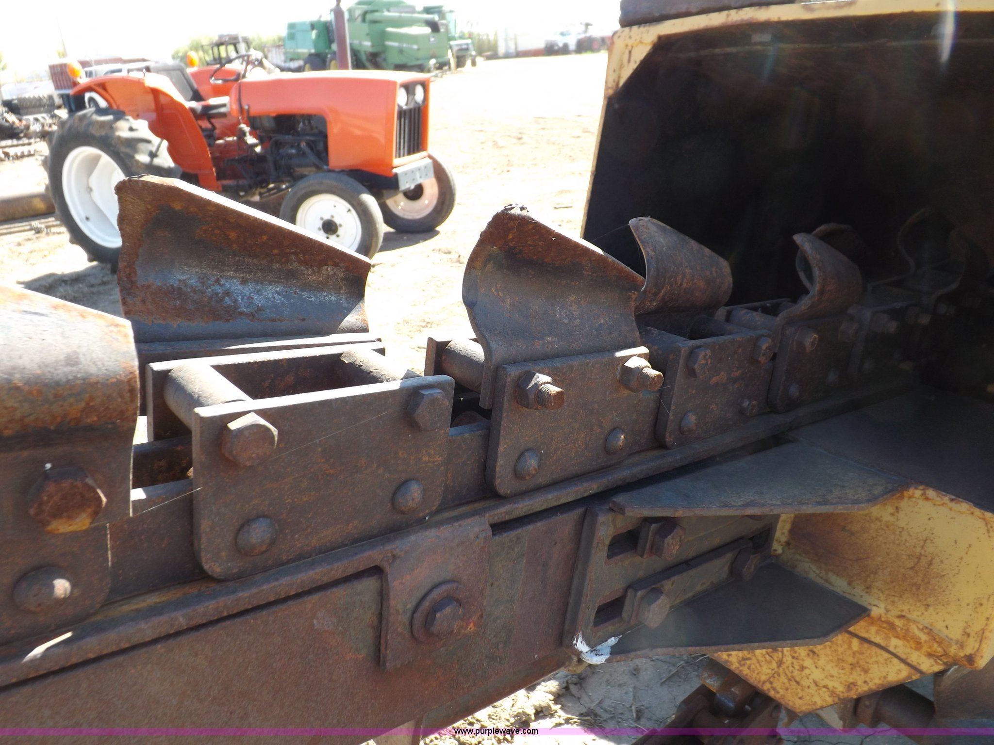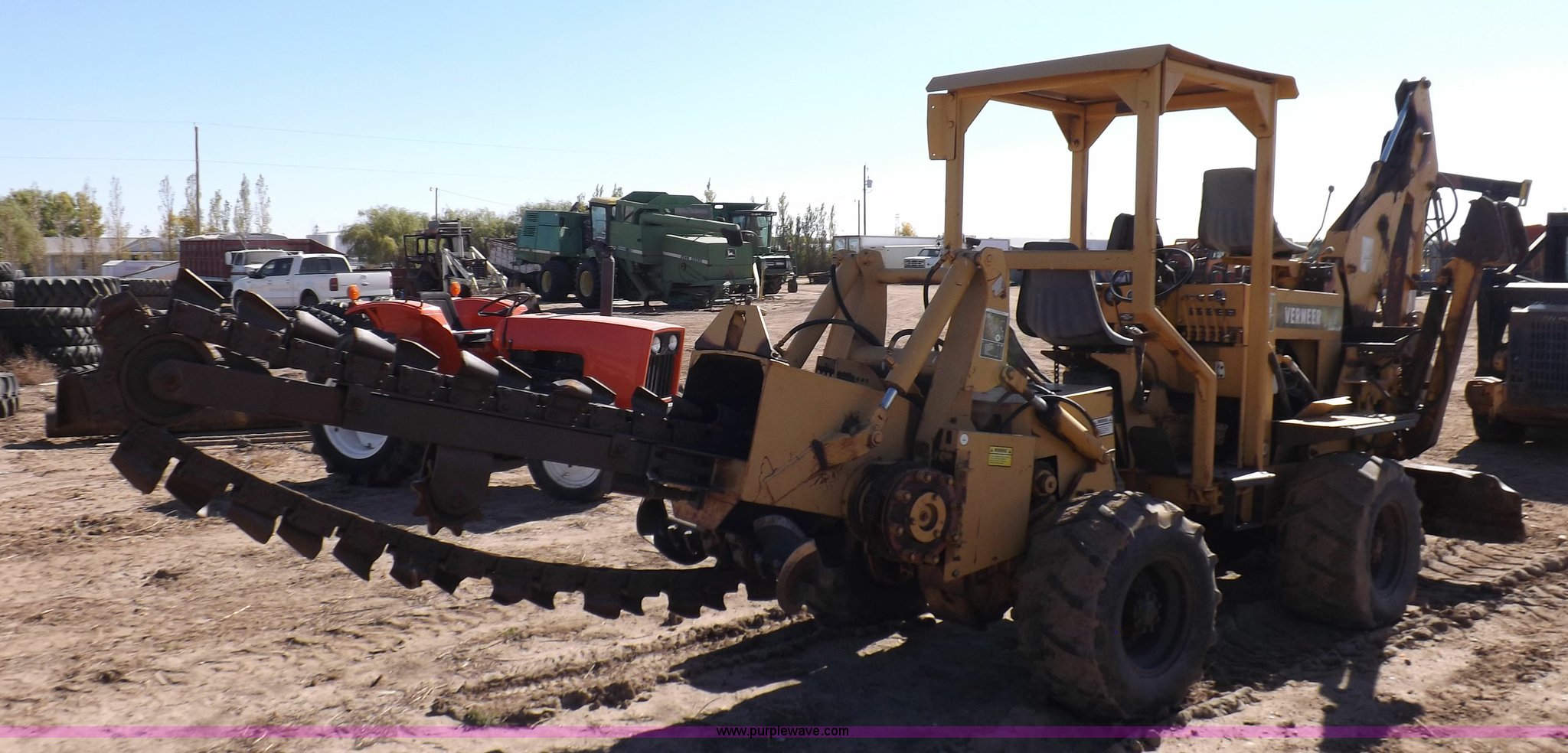 Purple Wave is selling a used Trencher or Rock Saw in Kansas. This item is a Vermeer M-70 trencher with the following: 4,197 hours on meter, Ford four cylinder gas engine, 4F-1R gears, Four wheel drive, ROPS, Crowd travel control, 7.5'L trencher boom, 6"W trench, 18" backhoe bucket, Dual backhoe controls, Dual stabilizers, 6'8" six way back fill blade, Bolt-on cutting edge, 31 x 15.5-15 tires, Hydraulic leaks, Serial 170