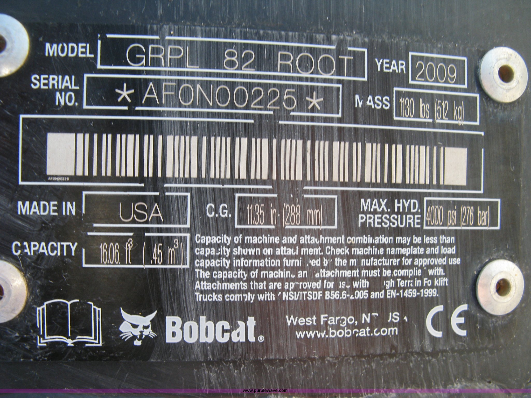 2009 Bobcat root grapple bucket has sold in Valley Center, Kansas for $2365. Item H9377 sold on December 4th, 2014.