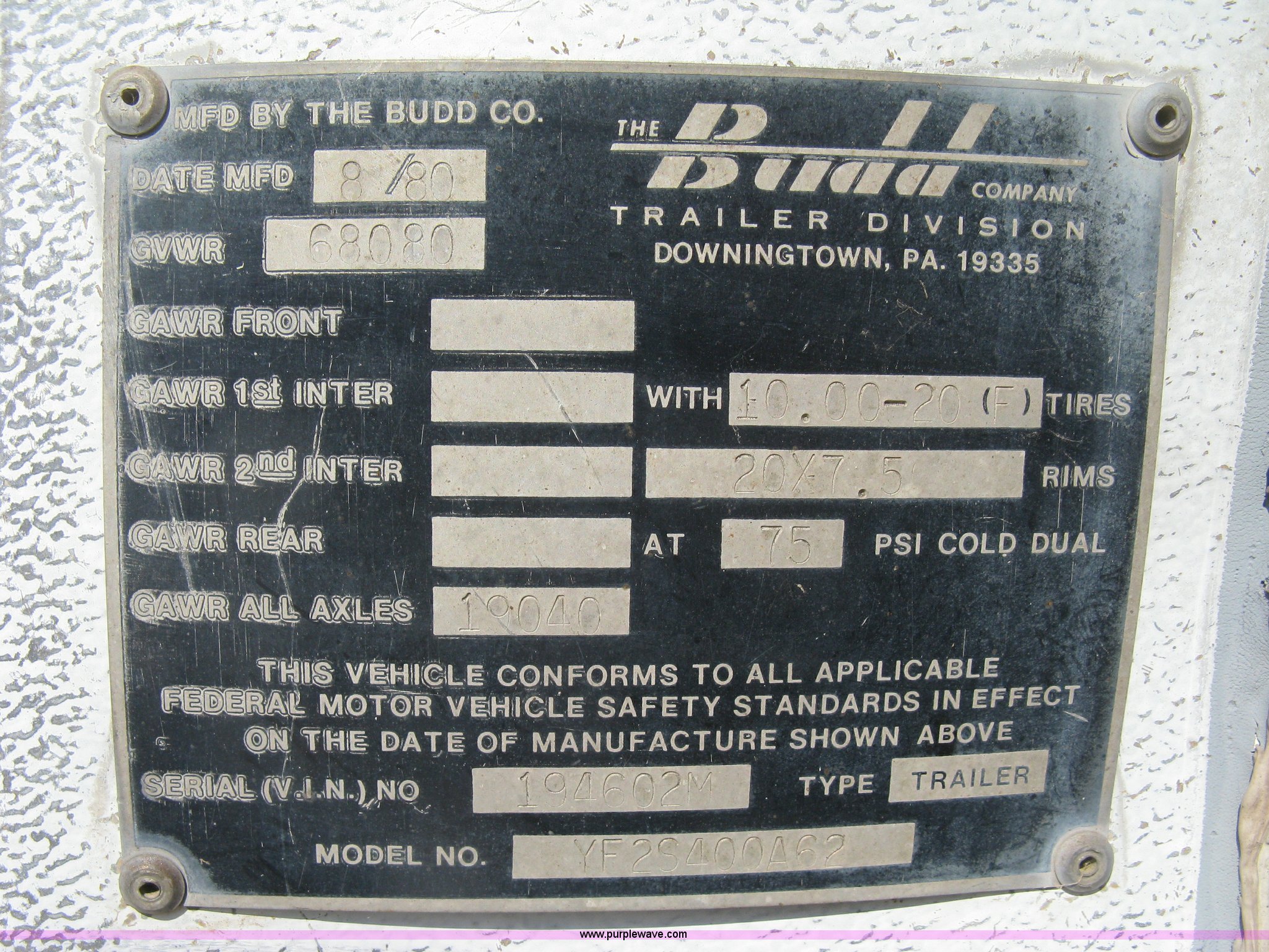 Purple Wave is selling a used Dry Van Trailer in Kansas. This item is a 1980 Budd dry van trailer with the following: Model YF2S400A62, 42'L x 8'W, Aluminum/steel frame, Wood floor, E-track interior walls, Two speed landing gear, Spring suspension, Air brakes, 10.00-20 tires, GVWR68,080 lbs, Exterior body damage and patching, Interior rust/water damage to rear doors, Unit# 1068