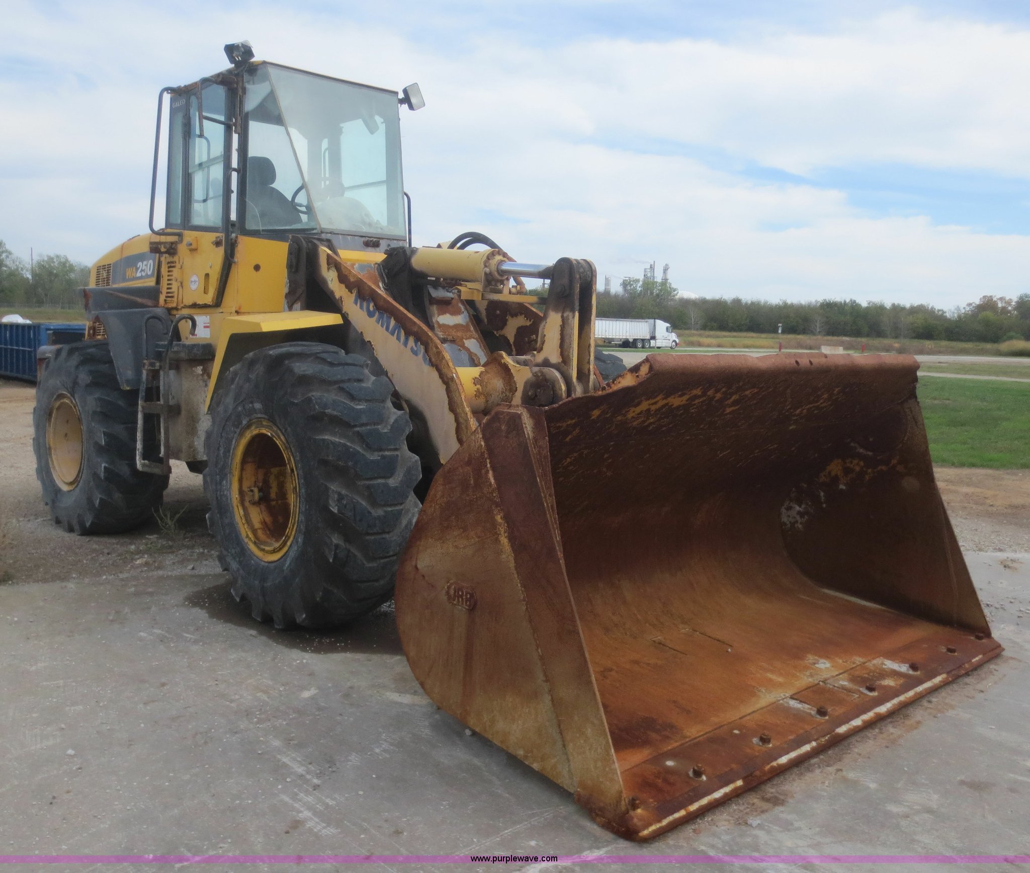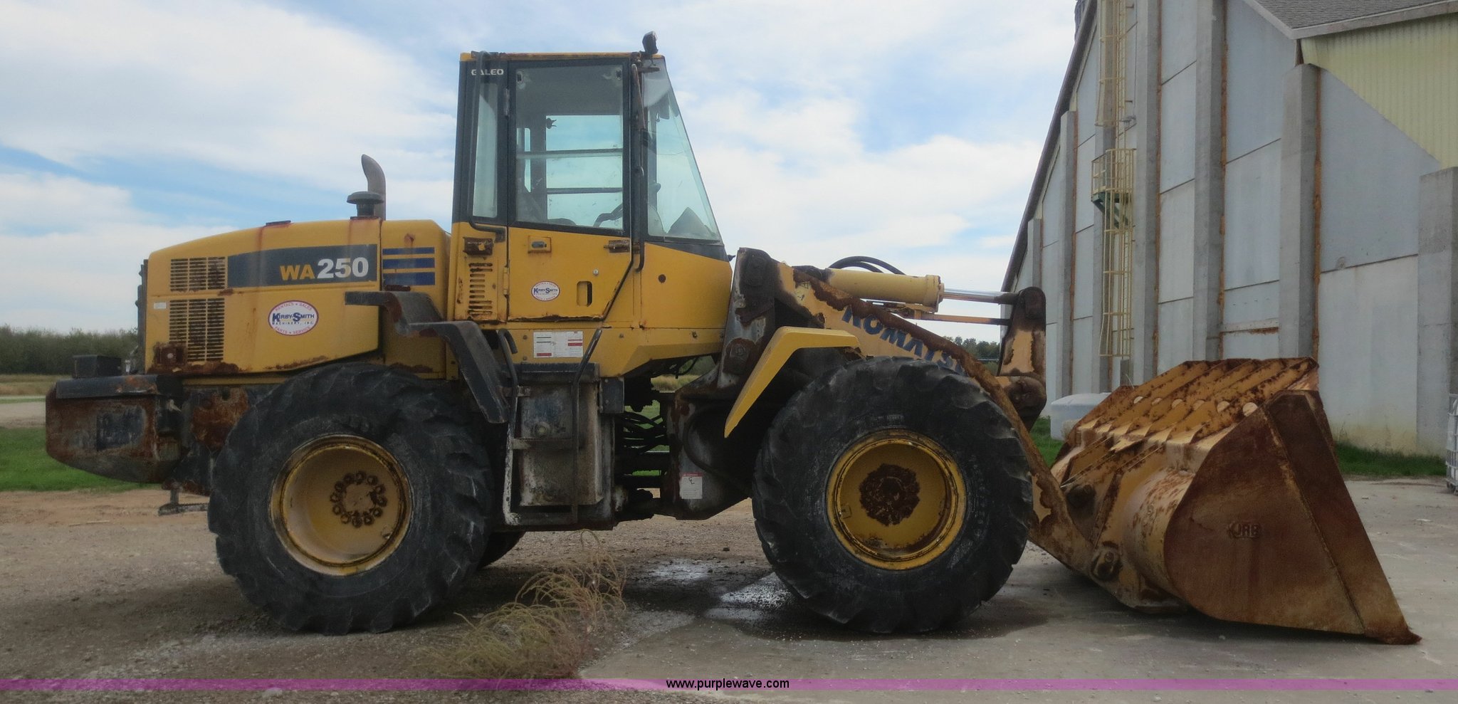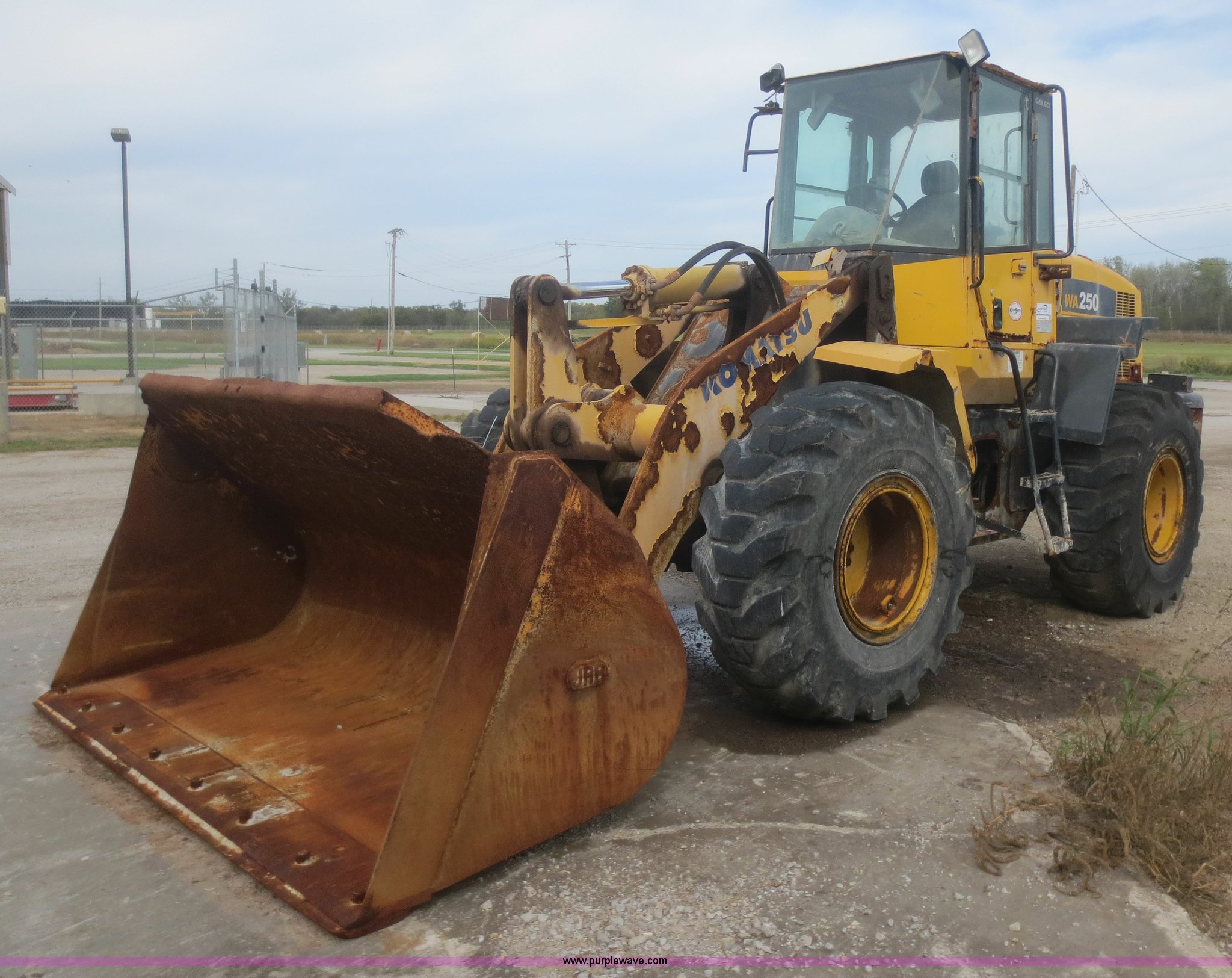 Purple Wave is selling a used Wheel Loader in Oklahoma. This item is a 2006 Komatsu WA250-5L wheel loader with the following: 6,451 hours on meter, Six cylinder turbo diesel engine, Four speed shuttle shift transmission, Variable shift control, Four wheel drive, AC and heat, AC inoperable, Joystick controls, JRB 9'W bucket, Bolt-on cutting edge, 20.5-25 tires, 24,199 lbs. base operating weight, Transmission will not engage, Interior/exterior cosmetic damage, Major rust damage, Serial A73792