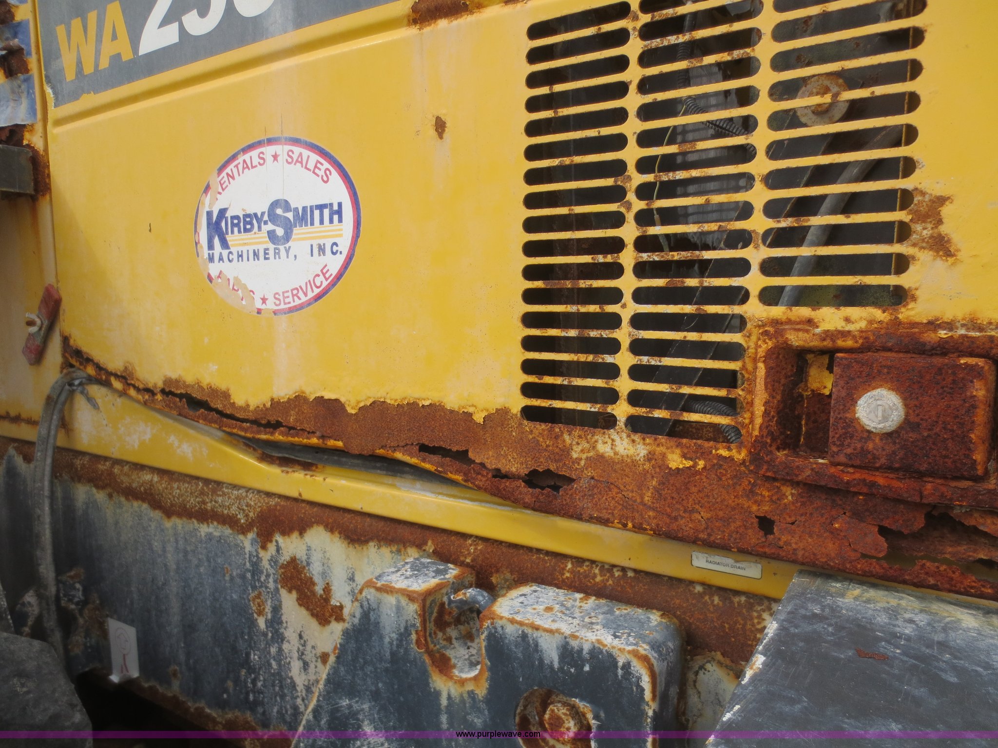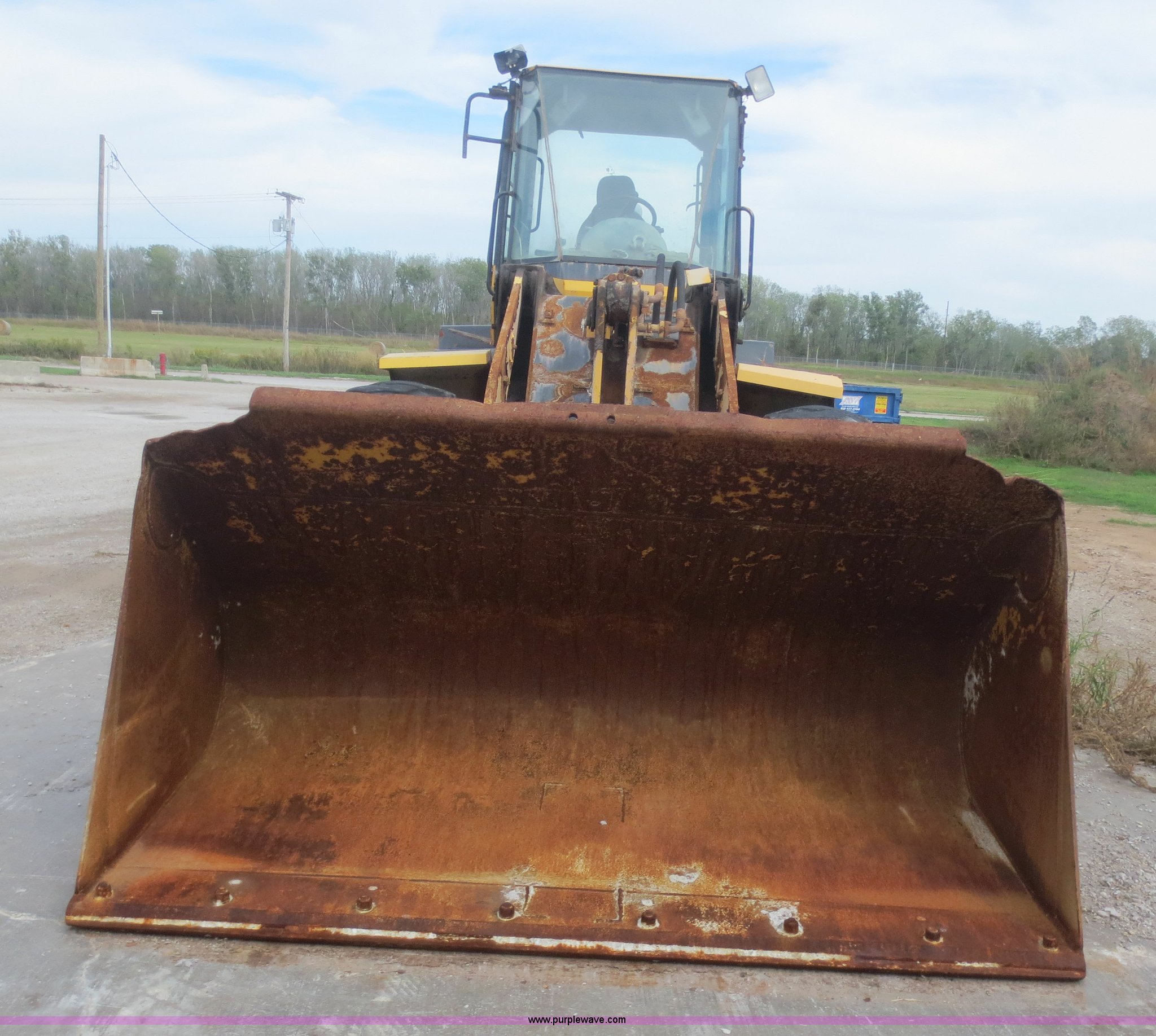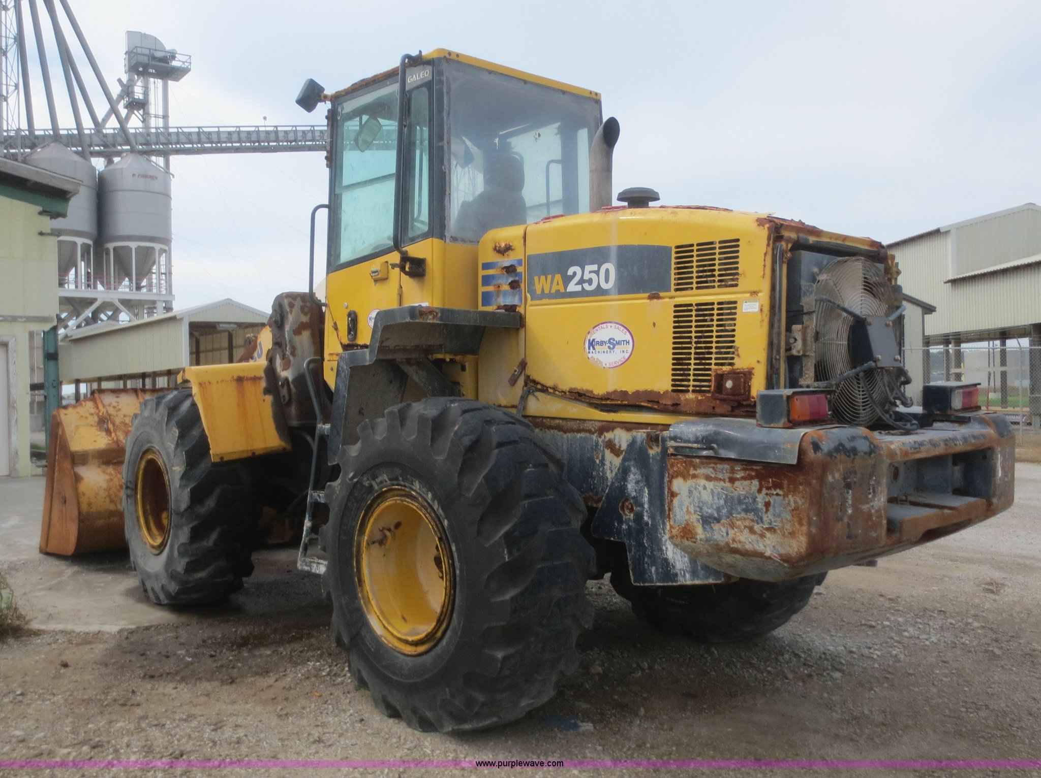 Purple Wave is selling a used Wheel Loader in Oklahoma. This item is a 2006 Komatsu WA250-5L wheel loader with the following: 6,451 hours on meter, Six cylinder turbo diesel engine, Four speed shuttle shift transmission, Variable shift control, Four wheel drive, AC and heat, AC inoperable, Joystick controls, JRB 9'W bucket, Bolt-on cutting edge, 20.5-25 tires, 24,199 lbs. base operating weight, Transmission will not engage, Interior/exterior cosmetic damage, Major rust damage, Serial A73792