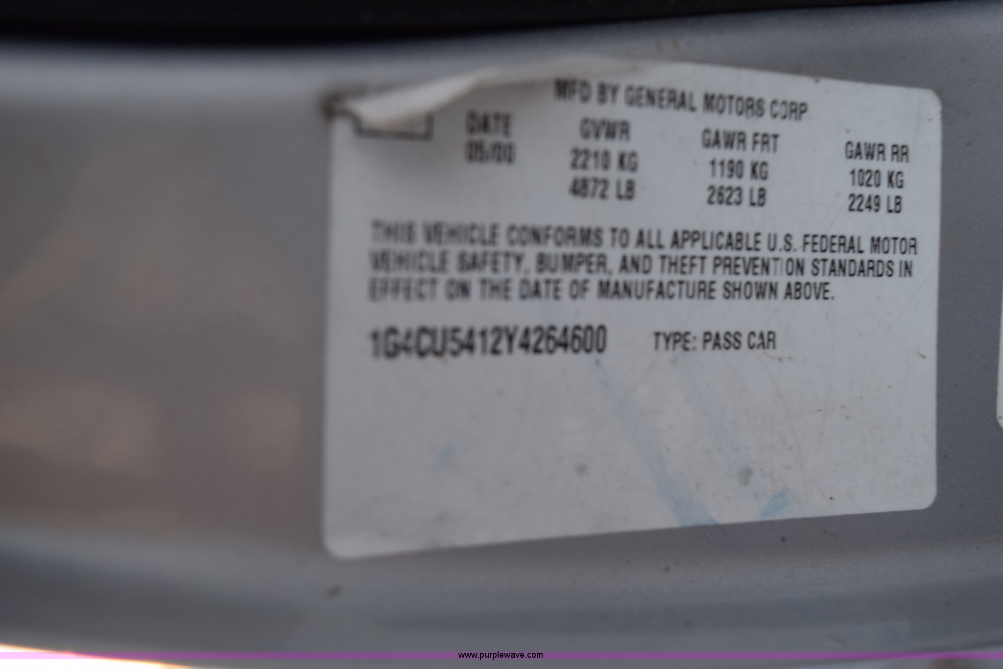 2000 Buick Park Avenue Ultra. Unknown miles on odometer, 3.8L V6 OHV 12V supercharger gas engine, Automatic transmission, AC and heat, Tilt, Cruise, AM/FM/CD/cassette, Power windows, locks, mirrors, and seats, Leather interior, 225/60R16 tires, Interior/exterior cosmetic damage, Case# 14V045518. Vehicle is abandoned. Condition and history are unknown. No additional information is available. Vehicle does not have keys unless notated otherwise in the item listing.. View City Of Wichita Terms for title acquisition and item removal requirements.. 1G4CU5412Y4264600. Ken's Auto Tow. 3730 S Broadway St. Wichita, KS 67216