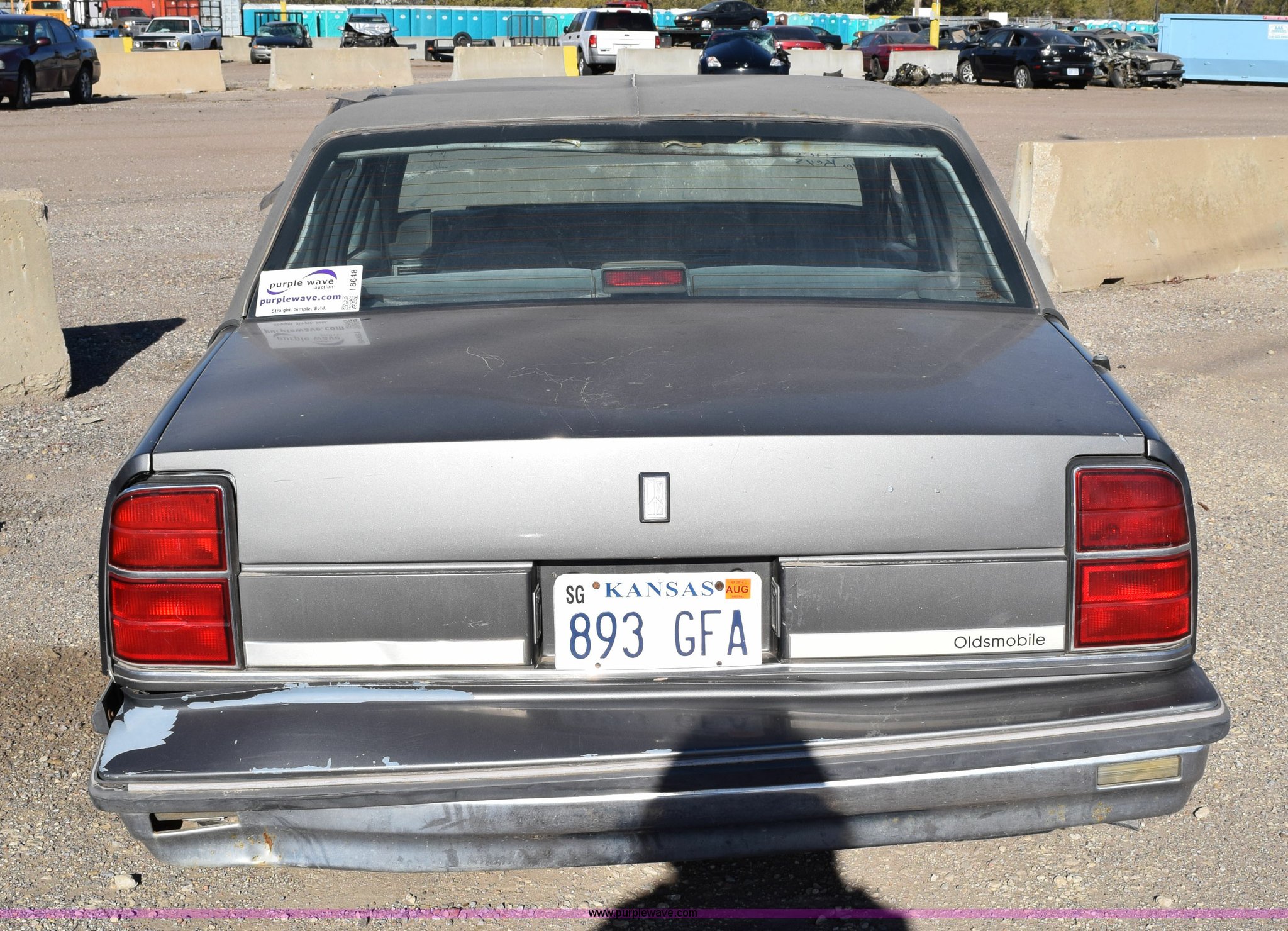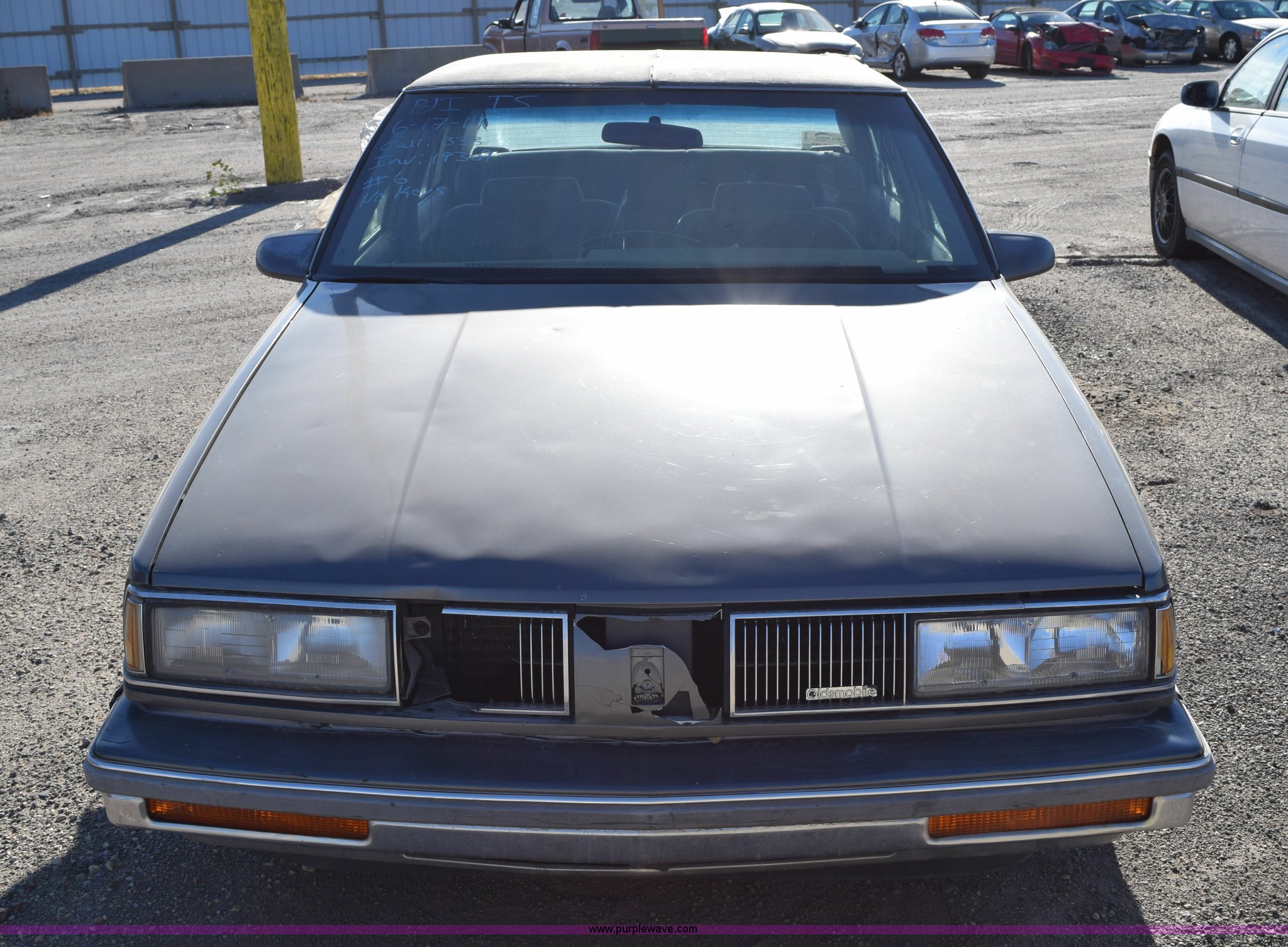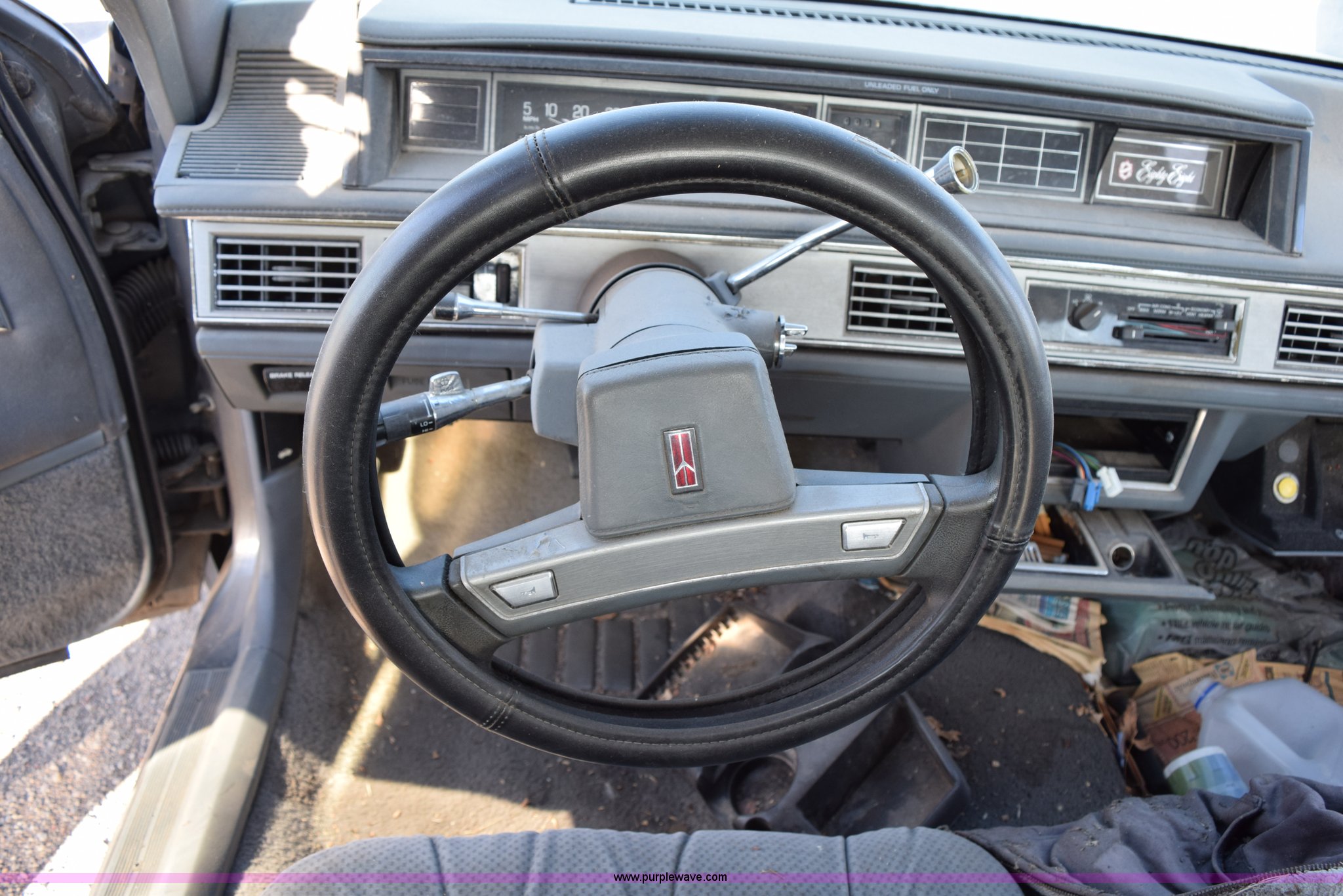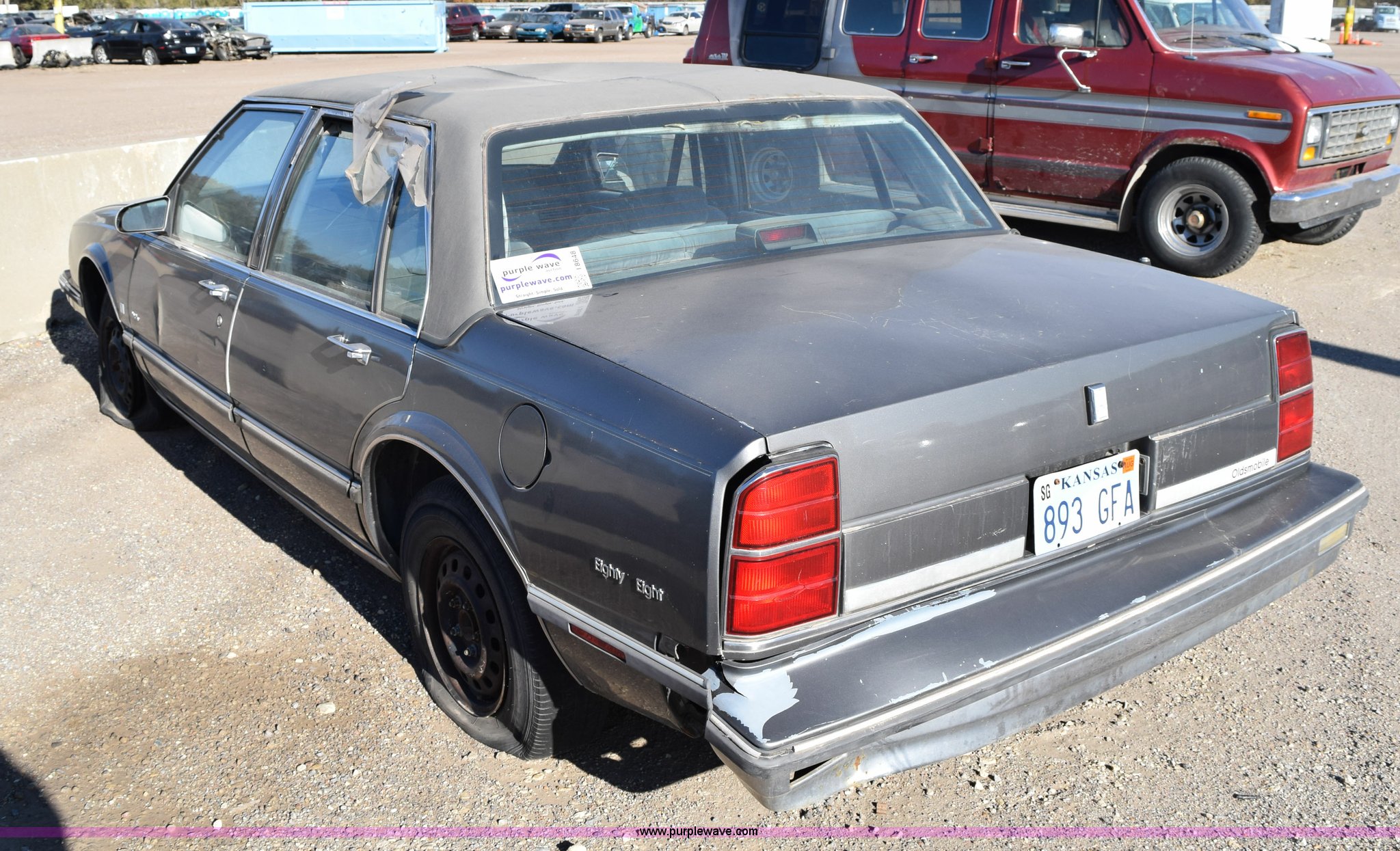 Purple Wave is selling a used Passenger Vehicle in Kansas. This item is a 1989 Oldsmobile Royale Brougham Eighty Eight with the following: 160,806 miles on odometer, 3.8L V6 OHV 12V gas engine, Automatic transmission, AC and heat, Tilt, Power windows, locks, mirrors, and seats, Cloth interior, Interior/exterior cosmetic damage, Radio missing, Cracked windshield, Roof damage, Case# 14C039360