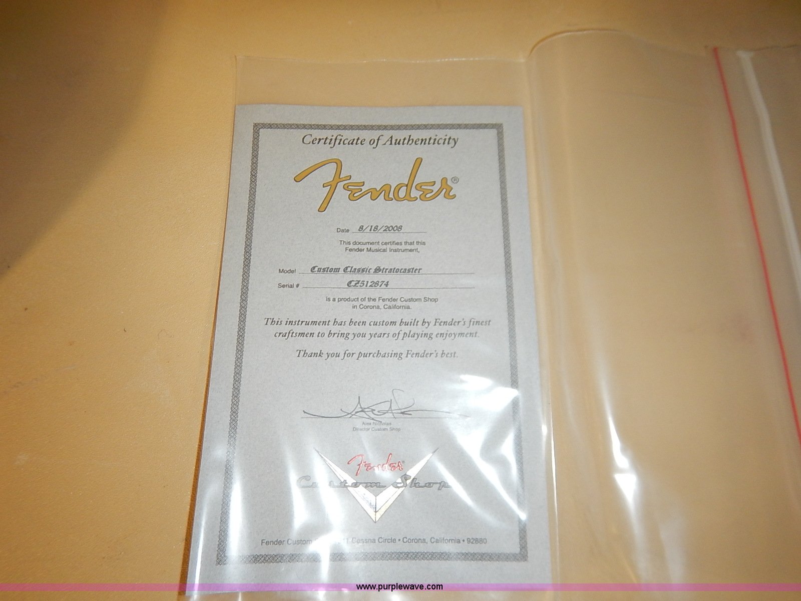 Purple Wave is selling a used Music Equip. in Kansas. This item is a Fender Custom Classic Stratocaster electric guitar with the following: Six string, 16.5" body, 26" neck, Shoulder strap and cable, G&G original vintage case, Certificate of Authenticity included, Serial CZ512874