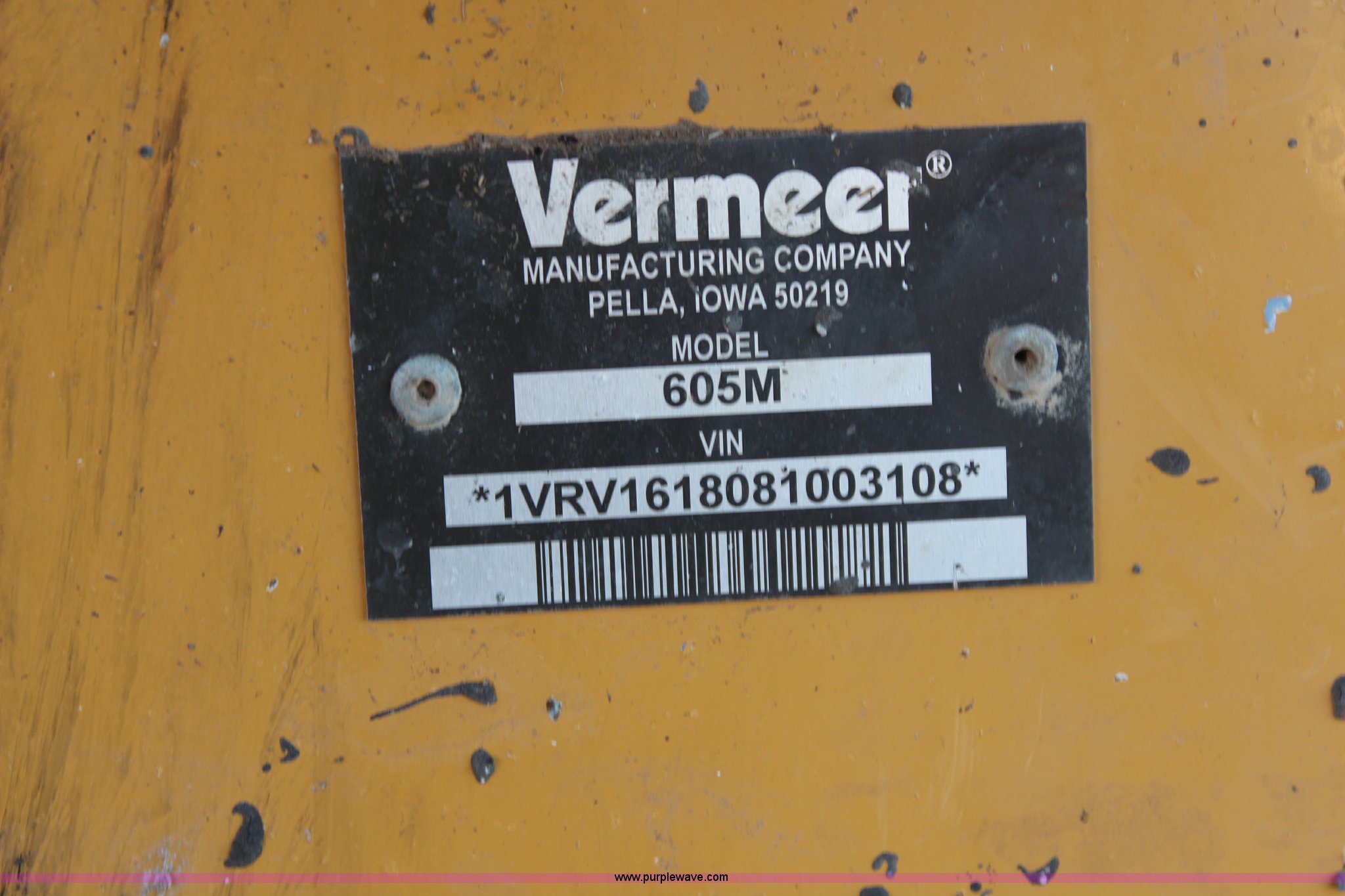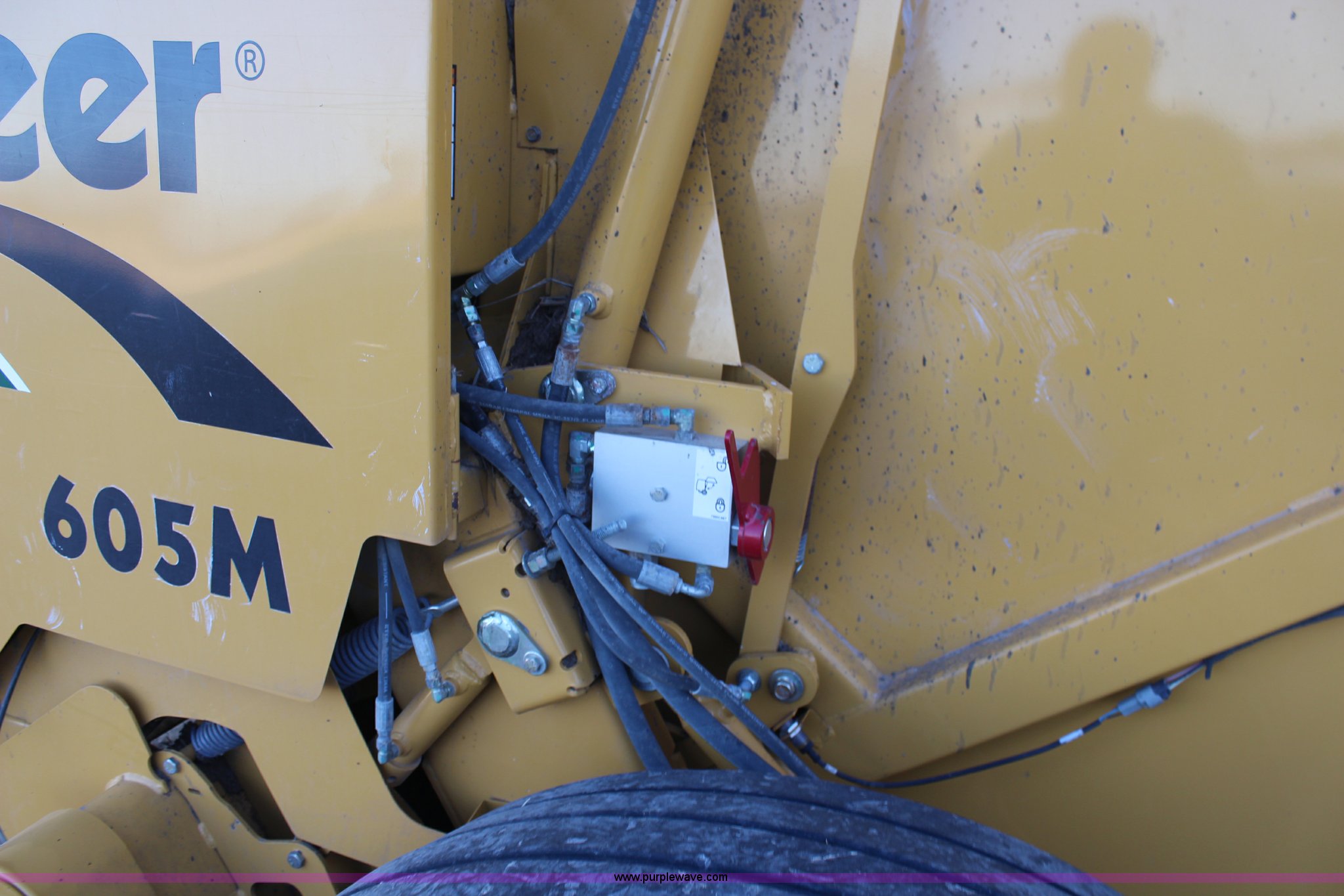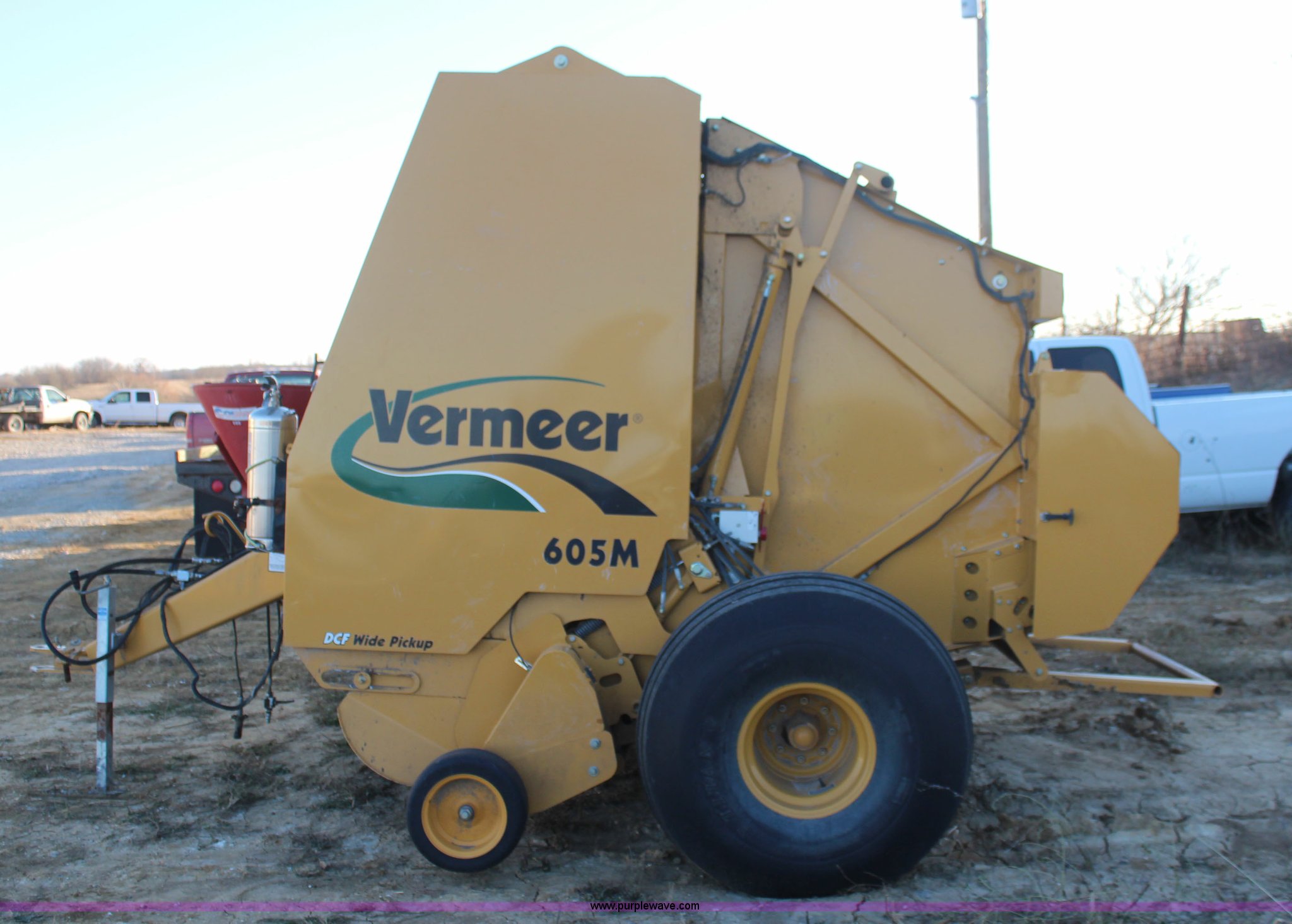 Purple Wave is selling a used Round Baler in Kansas. This item is a 2008 Vermeer 605M round baler with the following: 6,709 bales on counter, 5' x 6' bale capacity, 1000 PTO, Vermeer Accu-Bale Plus monitor, Bale ramp, Chain oiler, Auto-tie, Twin twine tie and net wrap, 7'W pickup, DCF wide pickup, Hydraulic pickup lift, Gauge wheels, 21.5L-16.1 floatation tires, Fire extinguisher included, Manual included, Super M updates installed approx. 200 bales ago, Recently replaced Super M belts, Serial 1VRV1618081003108