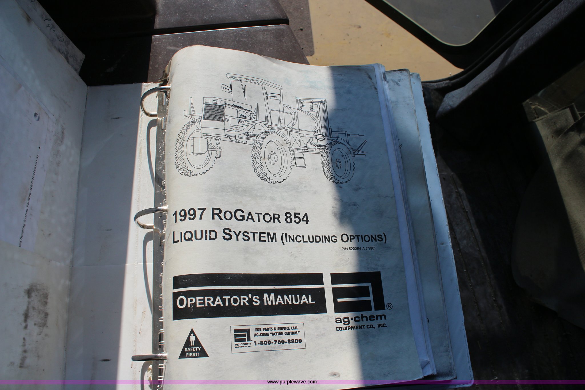 Purple Wave is selling a used Applicator Self Propelled in Kansas. This item is a 1997 Ag-Chem RoGator 854 self-propelled sprayer with the following: 3,567 hours on meter, Cummins 5.9L six cylinder diesel engine, 200 HP, Hydrostatic transmission, Four wheel drive, 750 gallon stainless steel tank, 50 gallon rinse tank, Stainless steel induction tank, Raven SCS460 spray control system, Foam marker, 60'/80'W boom, (5) boom sections, 20" nozzle spacing, Triple nozzle bodies, Hydraulic boom fold, Hydraulic height adjustment, AC and heat, AM/FM, Air suspension seat, Trimble EZ-Guide Plus light bar and guidance system, EZ-Steer auto steering, Radar ground speed sensor, Fenders, Spring suspension, Hydraulic axle width adjustment, 14.9R46 tires, Manuals, Serial 8522067