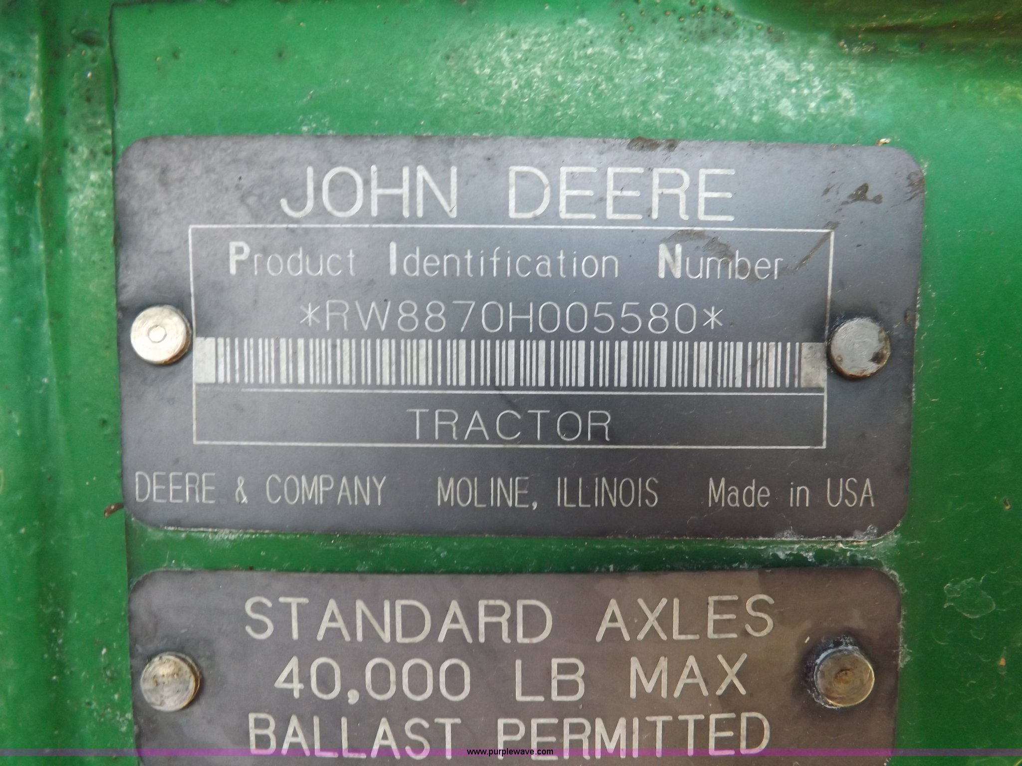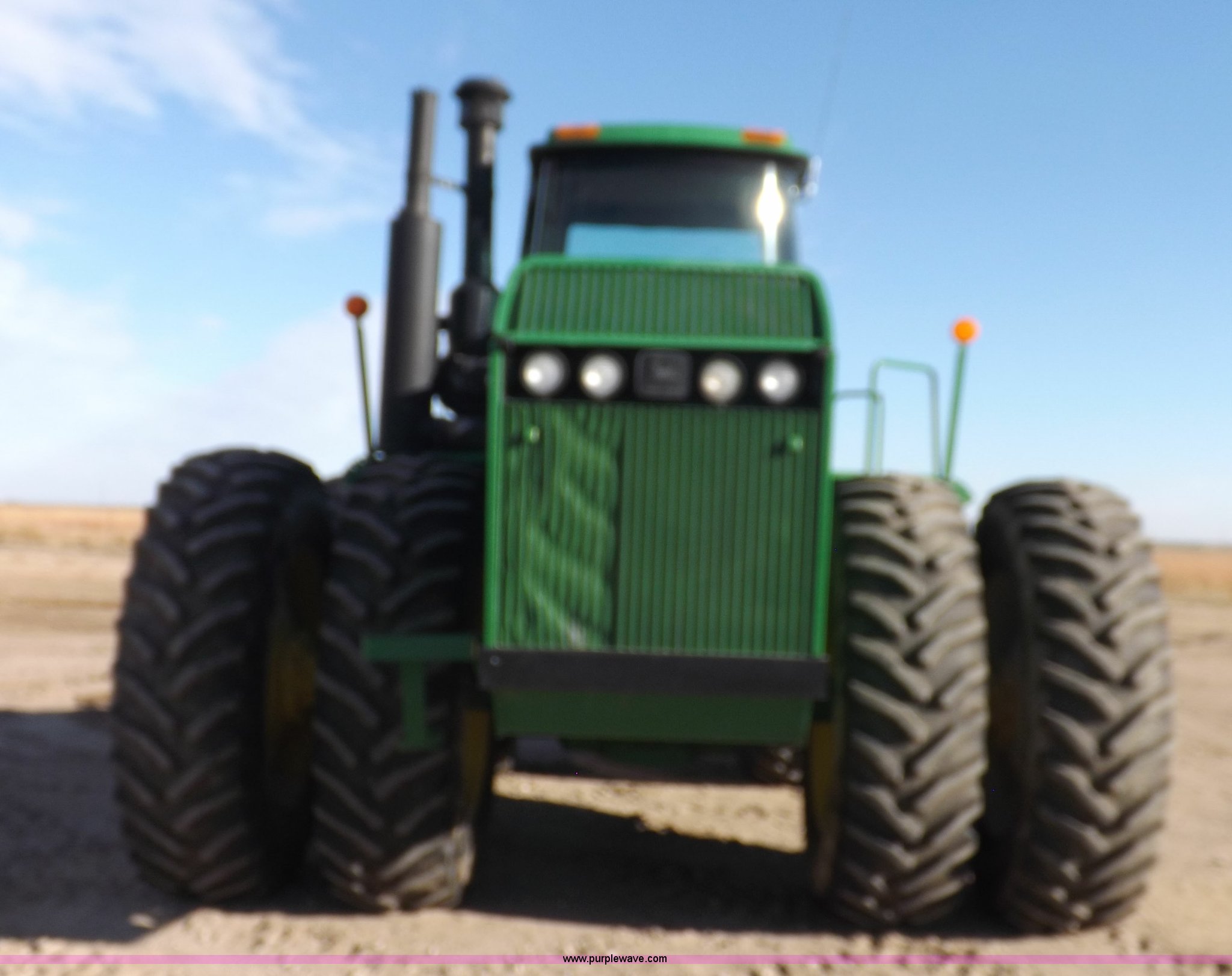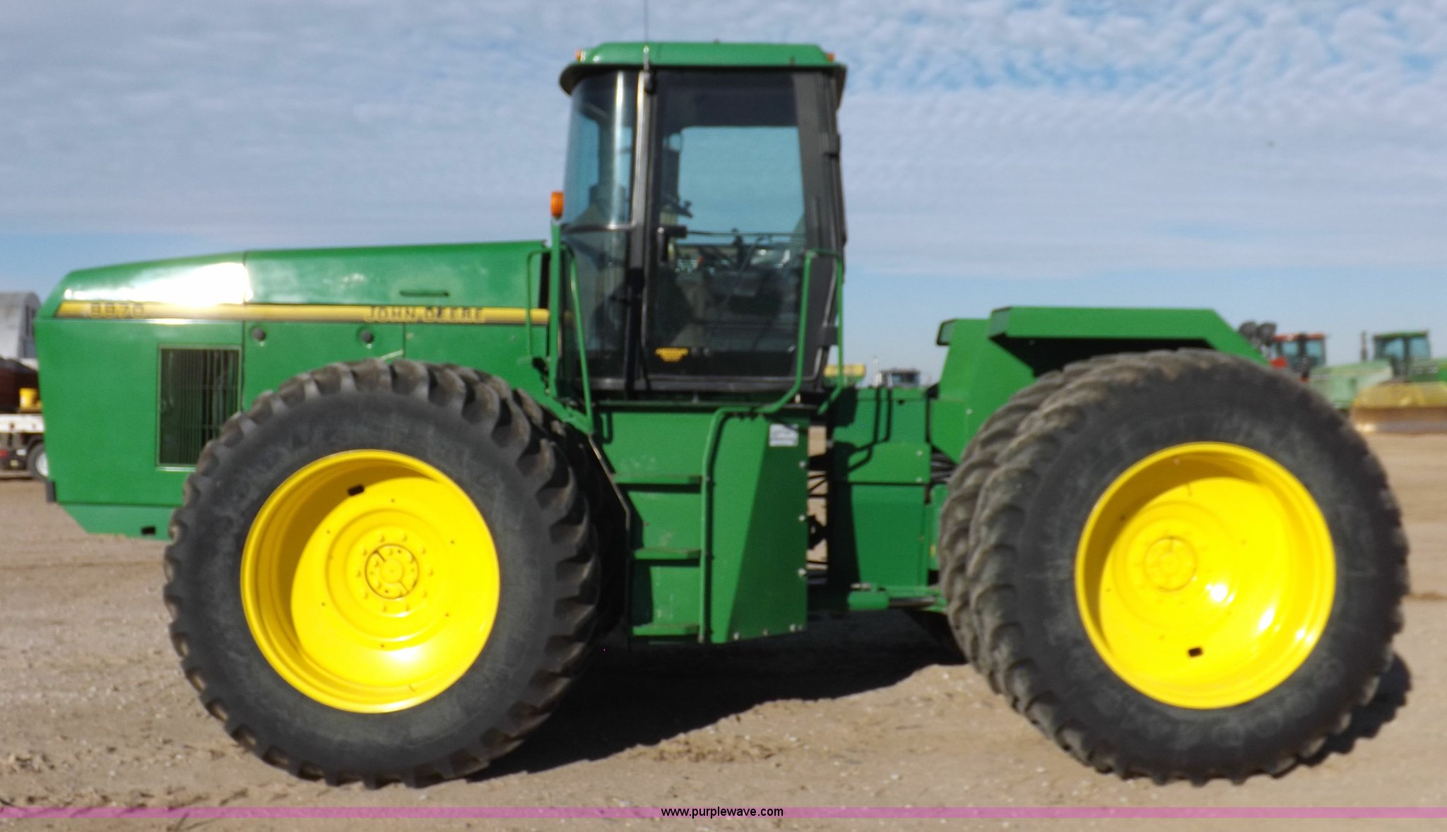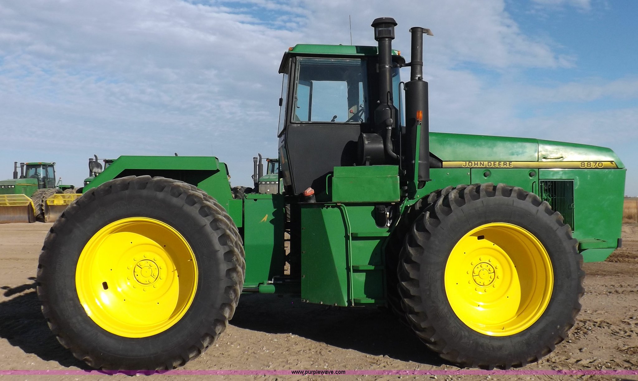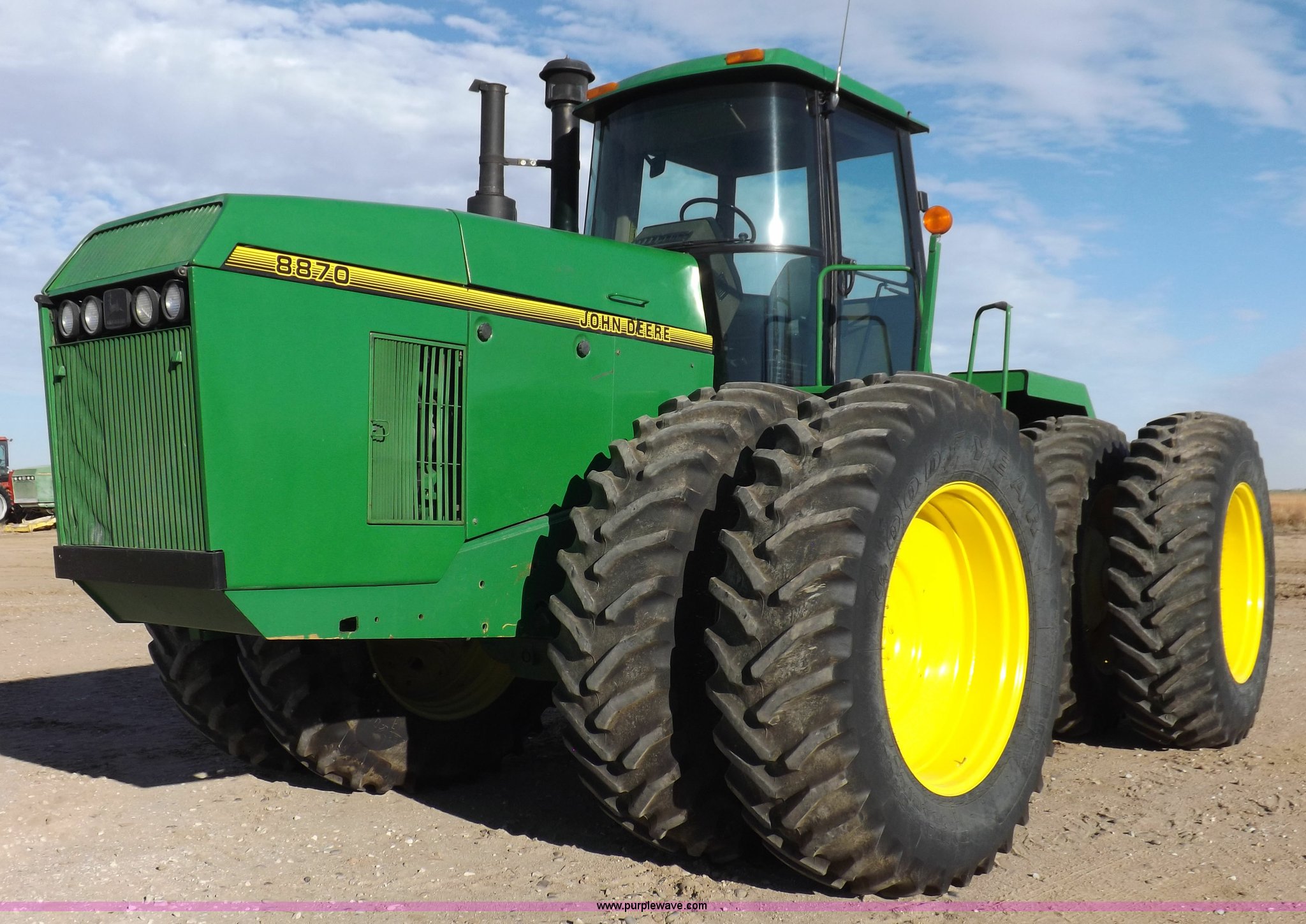 Purple Wave is selling a used Articulated 4-Wheel Drive Tractor in Kansas. This item is a 1996 John Deere 8870 4WD tractor with the following: 2,867 hours on meter, John Deere 6101HRW10 six cylinder diesel engine, 300 HP, Serial RG6101H507021, Differential lock, Partial powershift transmission, 24F-6R gears, AC and heat, AM/FM, Air suspension seat, Ground radar, Tilt steering wheel, Draw bar, (3) rear hydraulic remote sets, Rear inner wheel weights, 134" wheelbase, 520/85R42 dual tires, Upholstery damage, Radiator screen damage, Serial RW8870H005580