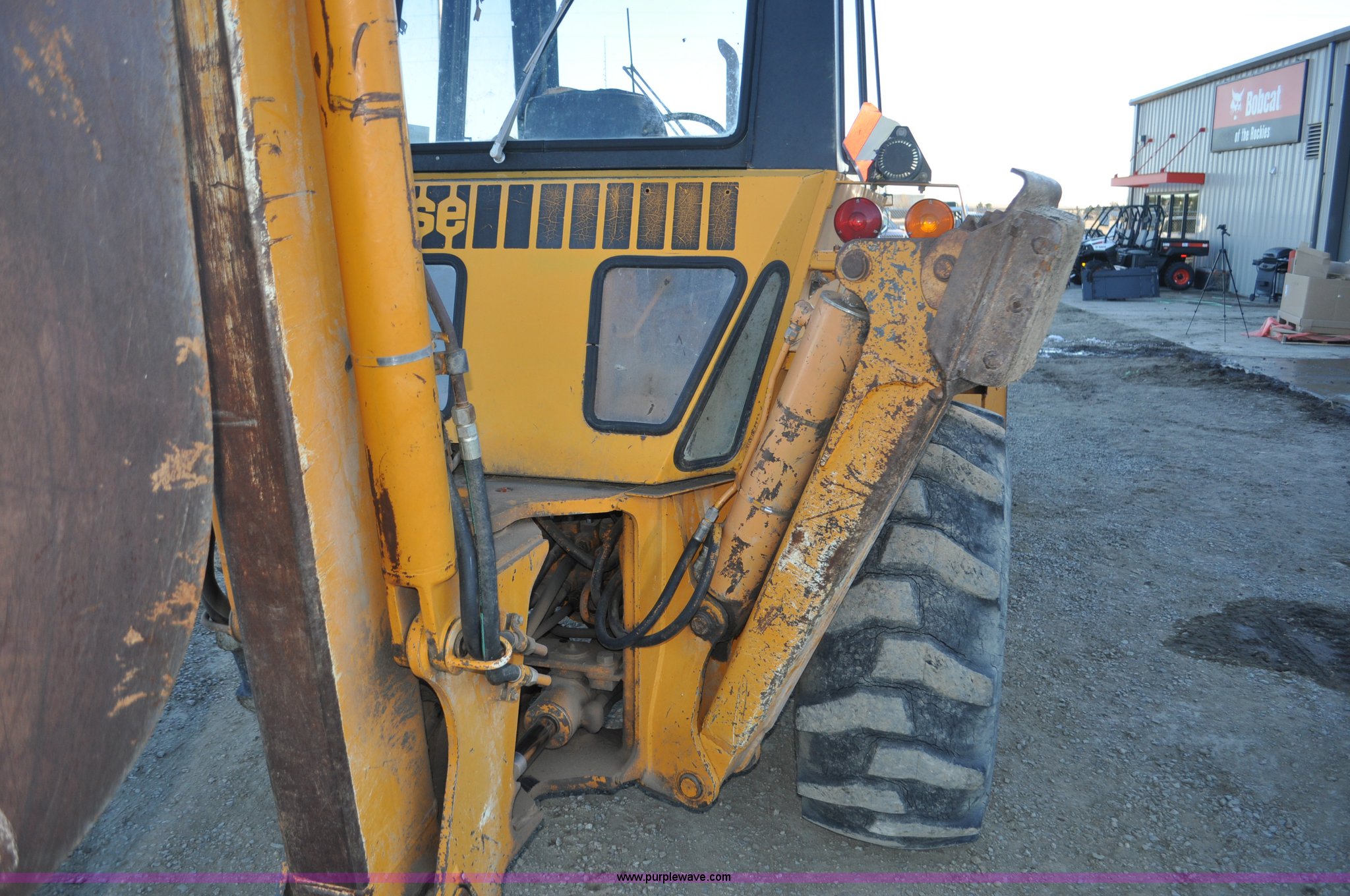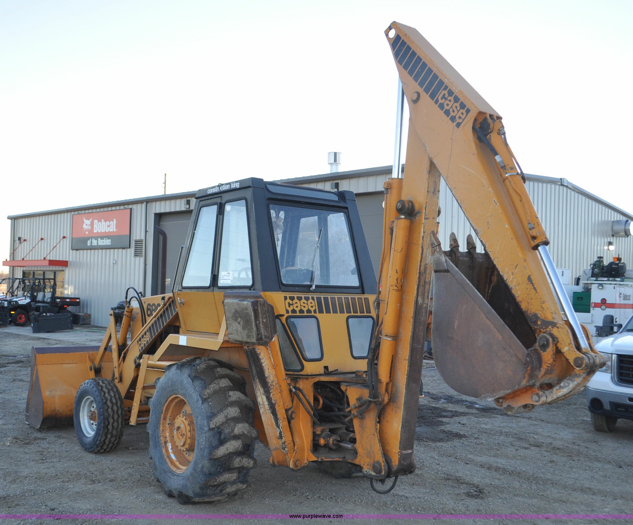 1976 Case 680E Construction King backhoe. 4,810 hours on meter, Case 336 four cylinder diesel engine 80HP, Syncromesh transmission 4F-4R gears, ROPS Serial 649, Spring suspension seat, Windshield wipers, Wobble stick backhoe controls, Standard front end loader Case 96"W bucket, Bucket has holes for bolt-on cutting edge, 24"W toothed backhoe bucket, Front and rear work lights, Air brakes, 11L-16 front tires, 19.5L-24 rear tires, 13,902 lbs. base operating weight, Serial 9122273, Unit# 1089015. View equipment video. Bobcat of the Rockies. 1608 E. Allison Road. Cheyenne, WY 82007