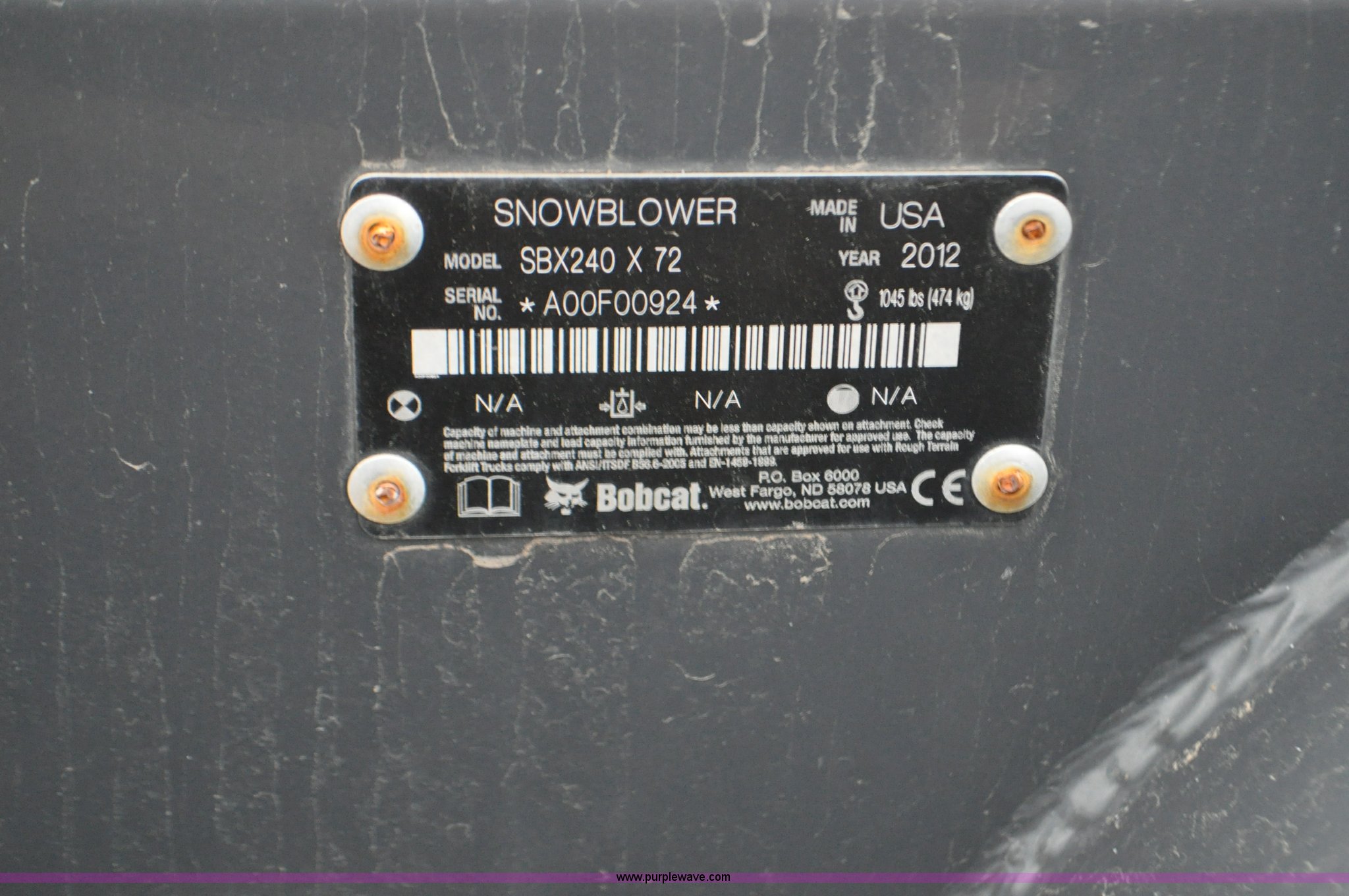 Purple Wave is selling a used Skid Steer Attach. in Colorado. This item is a 2012 Bobcat SBX240 skid steer snow blower with the following: 72"W, 18" auger, Hydraulic driven, Serial A00F00924, Unit# 1052216