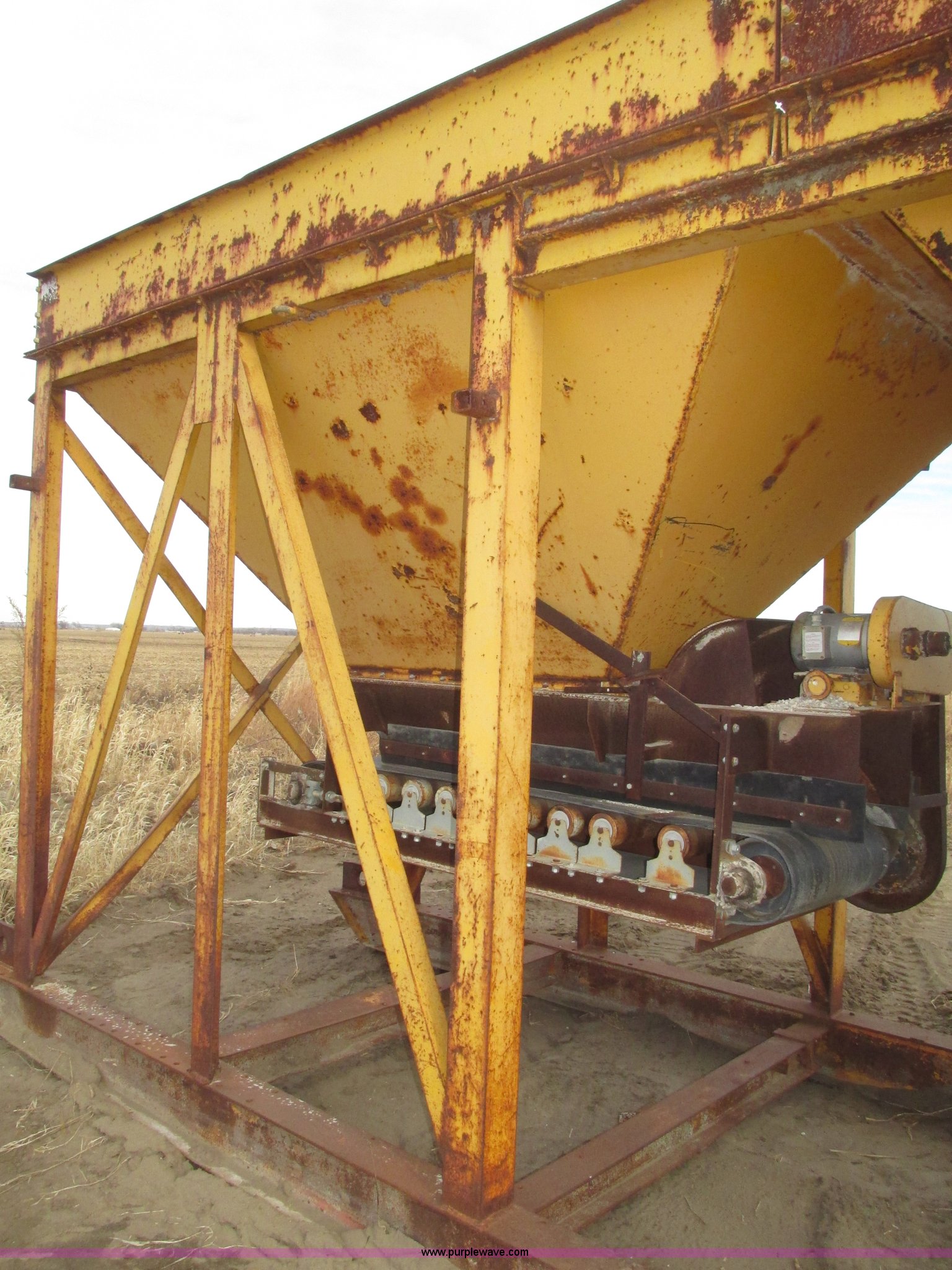 Double bin aggregate hopper/feeder. Approximately 10'L x 7'W bins, 23.5"L x 7.5"W x 9'10"H, Main electrical panels included, 23'L x 6"W x 10"H I-beam skids, Baldor electric motor 1.5 HP, Three phase, 208-230/460V, 81"L x 24"W nine roller conveyor, Marathon electric motor 2 HP, Three phase. Midwest Coatings. 1425 280th Street. Modale, IA 51556