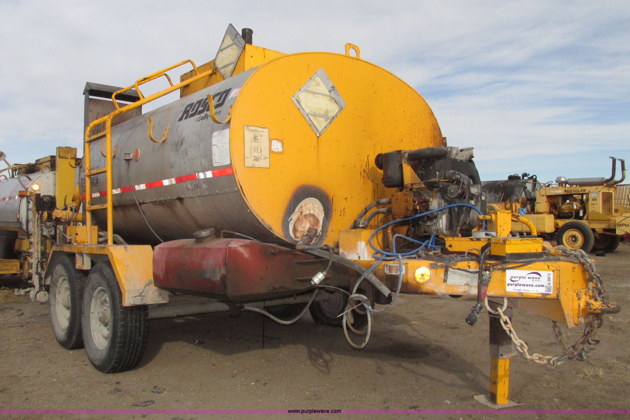 Purple Wave is selling a used Paving Sply. or Attach. in Iowa. This item is a 2003 Rosco towable oil distributor with the following: Hatz two cylinder diesel engine, 1,000 gallon capacity, 14'L, Veeder root control box, Side mounted access ladder, Approximately 8'W spray bar, 36"W wings, Full steel fenders, Bull dog jack stand, Four and seven pin trailer wiring, Spring suspension, LT235/85R16 tires, GVWR 16,500 lbs, GAWR 7,200 lbs, Unit currently contains C55IH in tank, Material will be removed prior to auction
