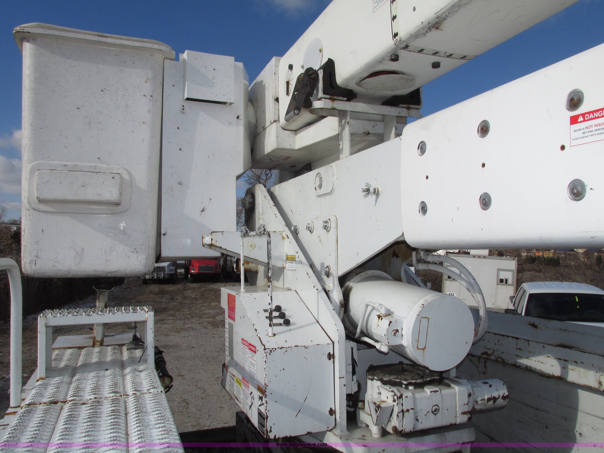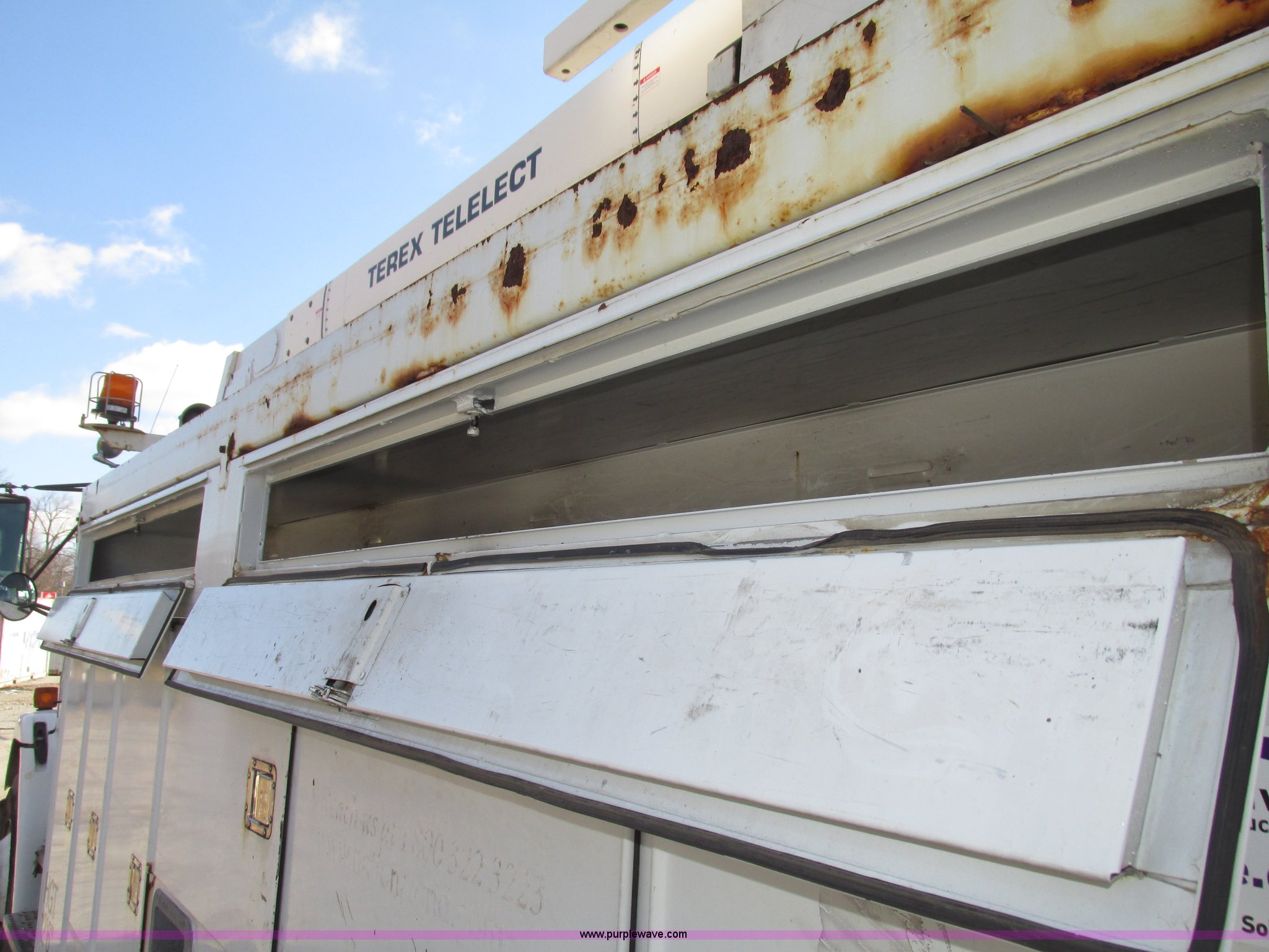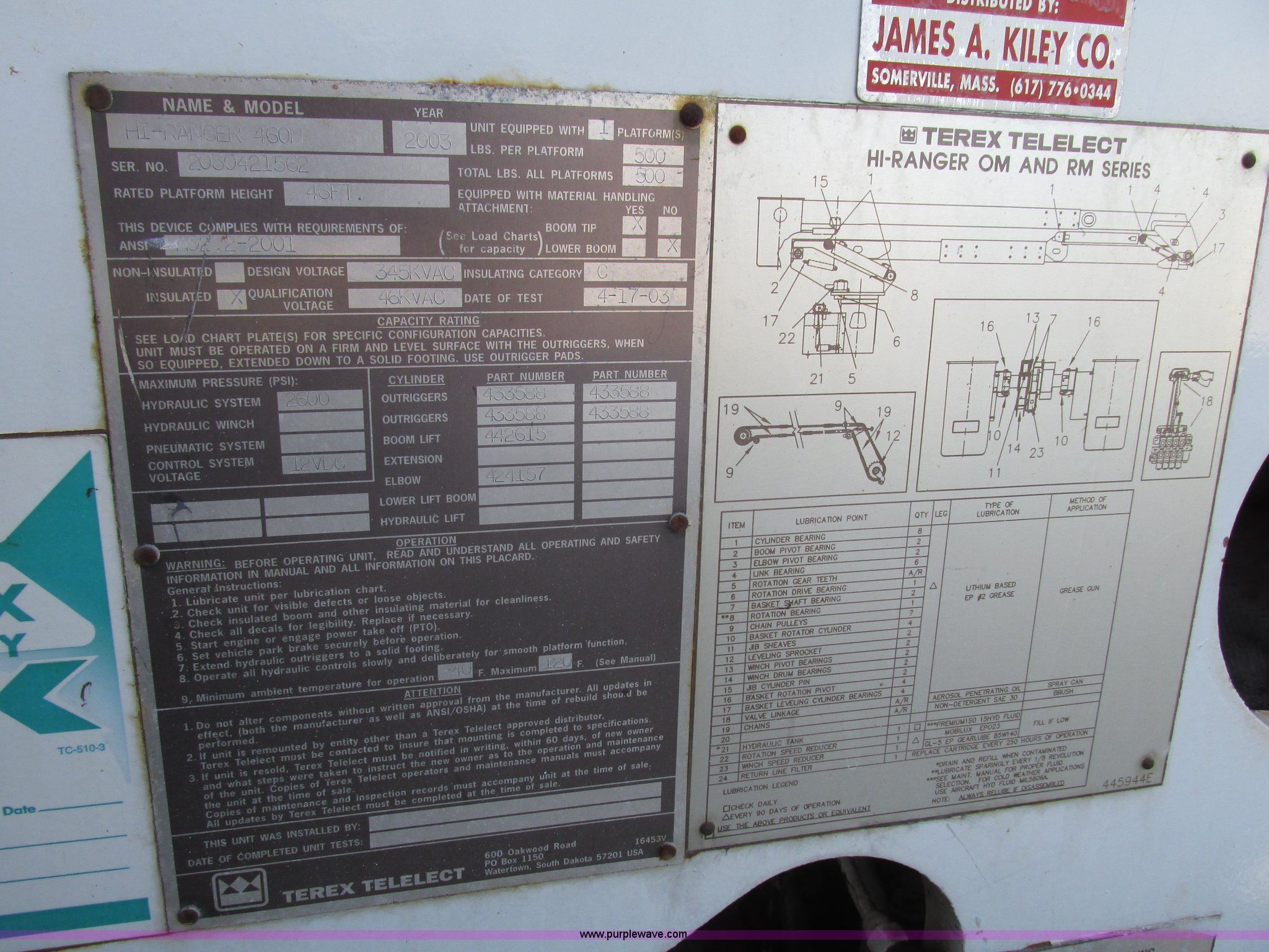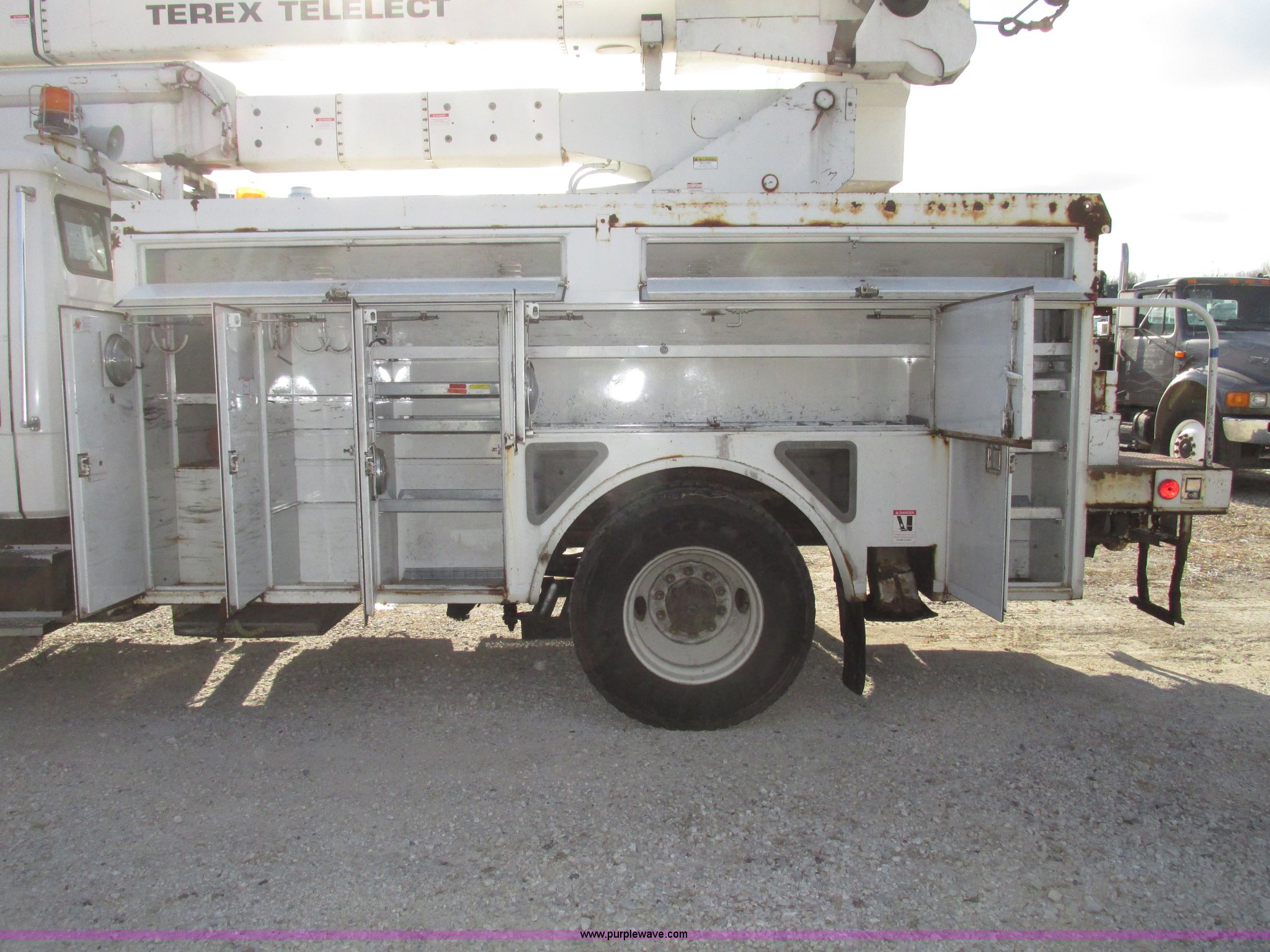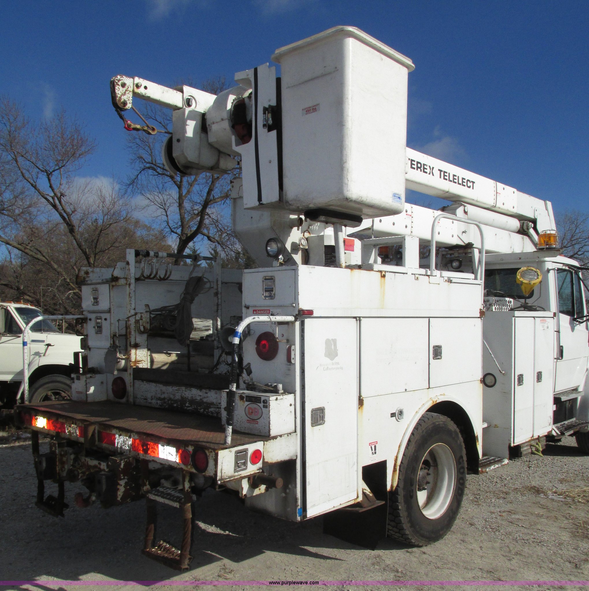 Purple Wave is selling a used Truck Part and Attach. in Nebraska. This item is a 2003 Terex Telelect Hi Range 460M truck boom with the following: 46' rated platform height, 500 lbs rated platform capacity, Rear hydraulic fittings, Basket and ground controls, Single man fiberglass basket, Reading utility bed, 13'1"L x 96"W, (12) compartments, 2" rear bumper, Hazard and beacon lights, 58"L x 16 3/4"W cat walk, 60"W x 19"D front storage bin, 60"W I.D., (4) hydraulic outriggers, (3) 24" x 24" wood pads, Approximately 16"D compartments, Mud flaps, Pintle hitch, Trailer wiring, Gladhand connections, Truck is not included, Unit will be removed from truck prior to auciton, Serial 2030421562, Unit# 506